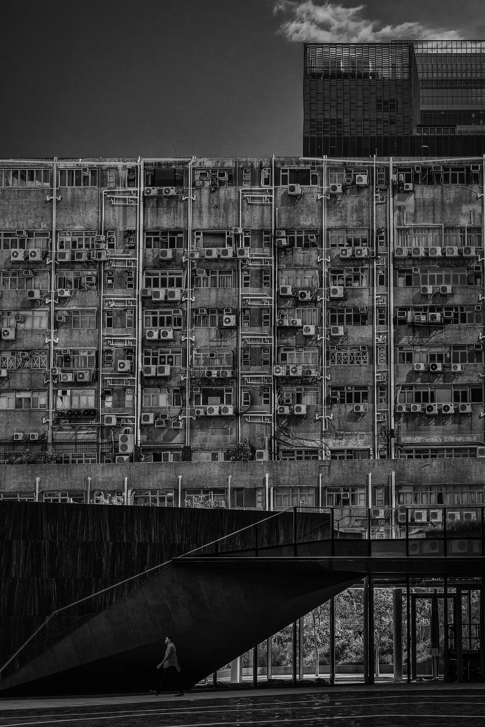 In an industrial district in Hong Kong, surrounded by a mix of old and new developments, this shot was taken to highlight a contrasting co-existence: a new skyscraper’s stylishly designed front entrance and an old industrial complex with myriads of air conditioners, pipes and wires mounted on its wall. The shadow and light accentuated the overall monochromic effect of the city’s architecture