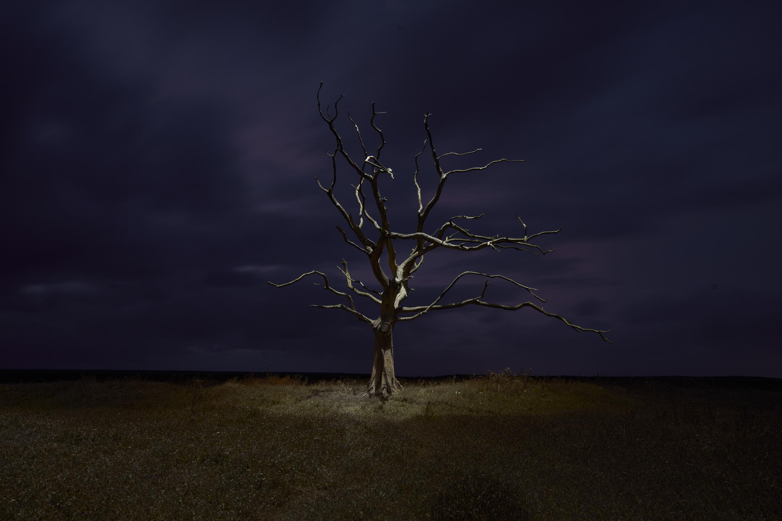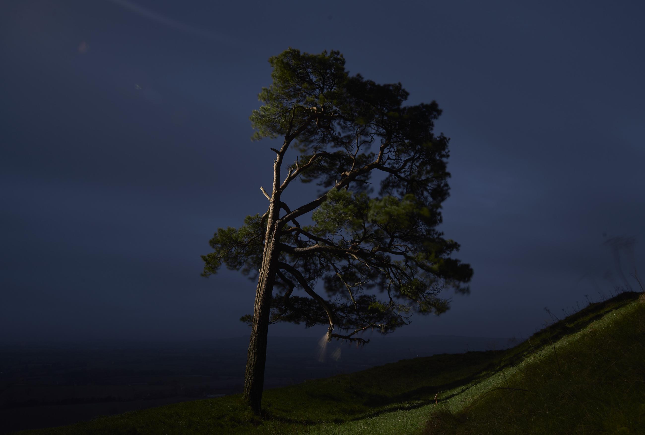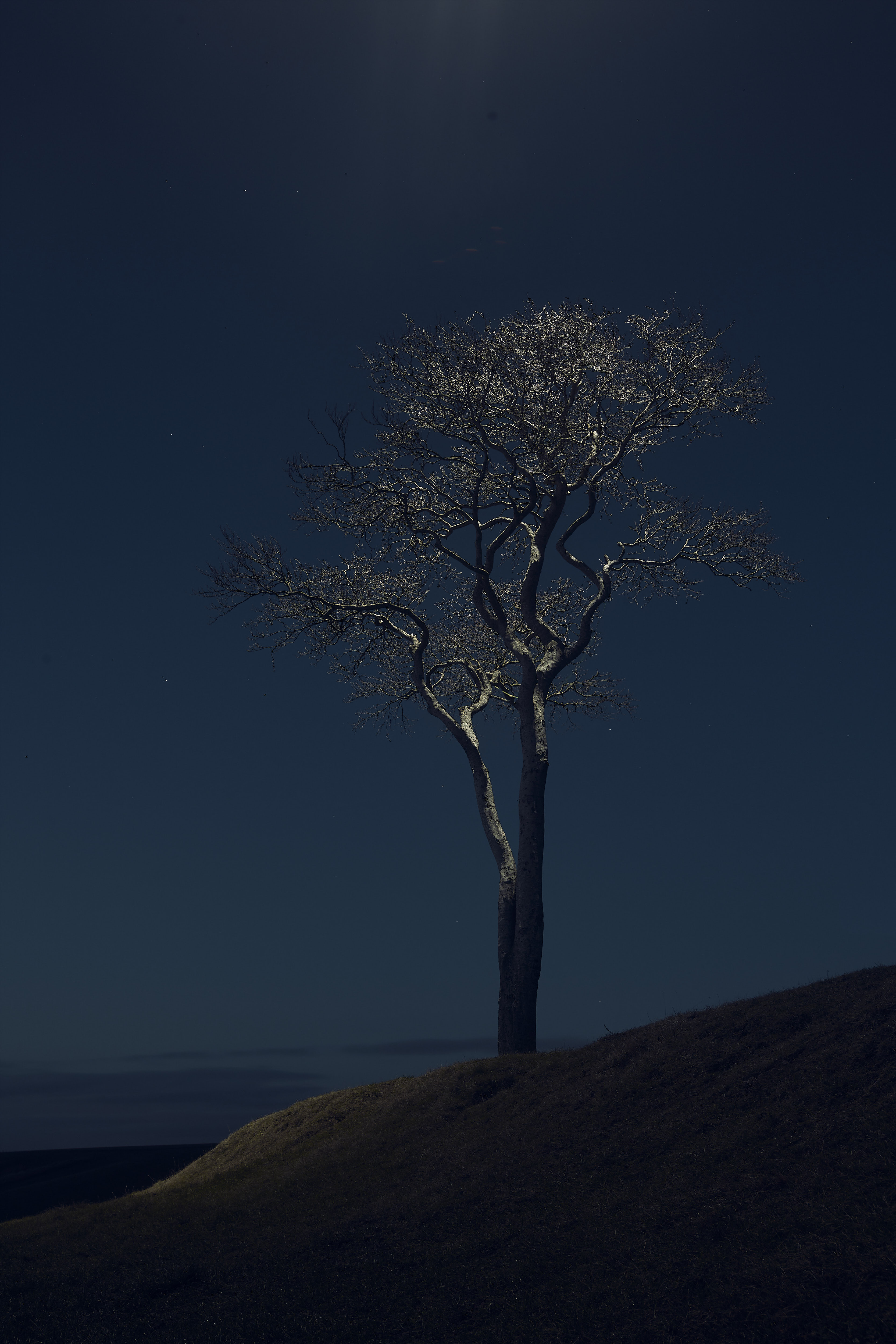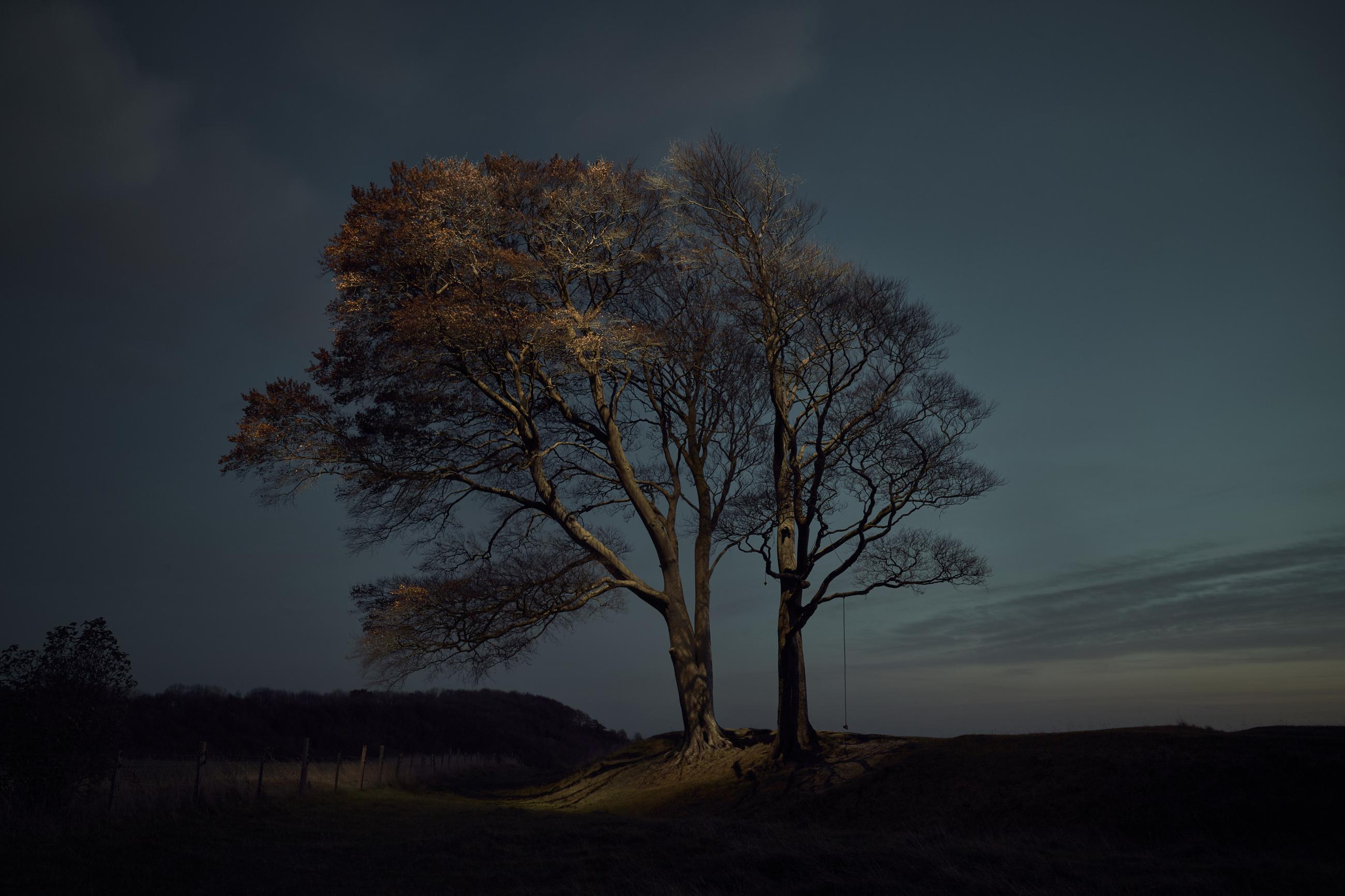 This project was born of the Covid-19 lockdowns, and the impact upon my work as a portrait photographer. Inspired by my home county of Wiltshire, where the distinctive landscape features many knolls with lone trees raised above the horizon line. Unable to photograph people, I turned to my love of trees. I wondered if it was possible to take a unique portrait of these quiet giants. I chose to photograph against dusk skies and lit the trees with drones to create an otherworldly impression. As lockdowns took hold, so did this project. I started looking into every field and up every hill for aesthetically interesting treescapes. While many people discovered the joys of walking in nature during the lockdowns, once the sun had set it was just me, the trees and the darkness, which was an experience that at first terrified me but with time I began to relish.