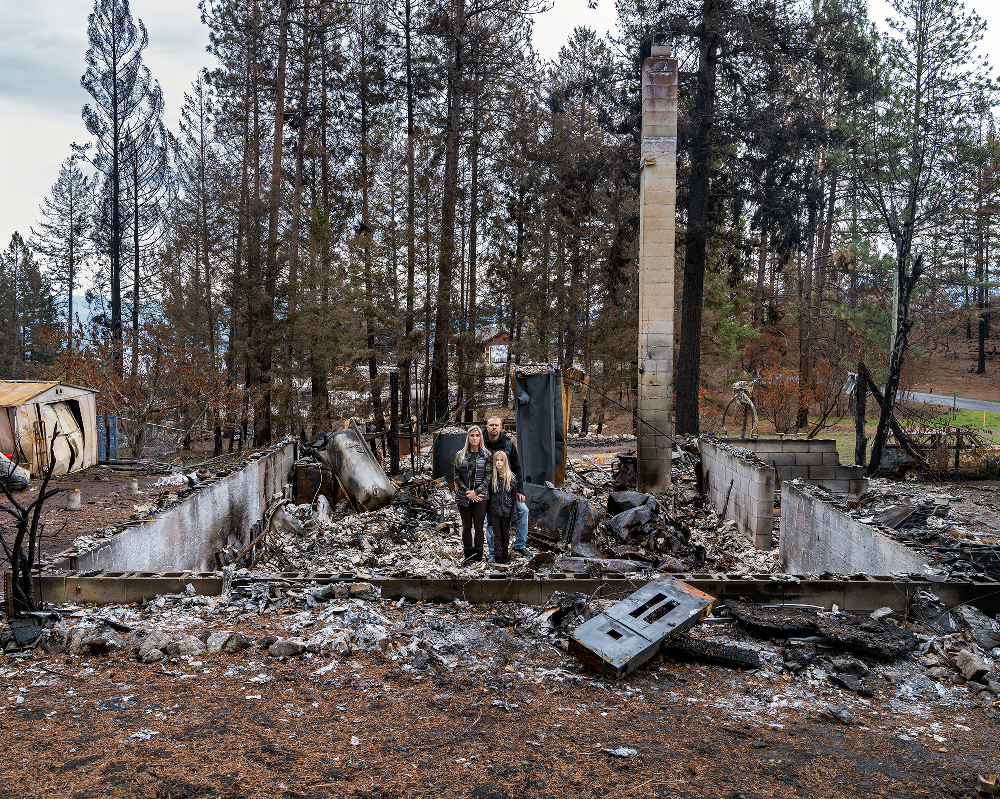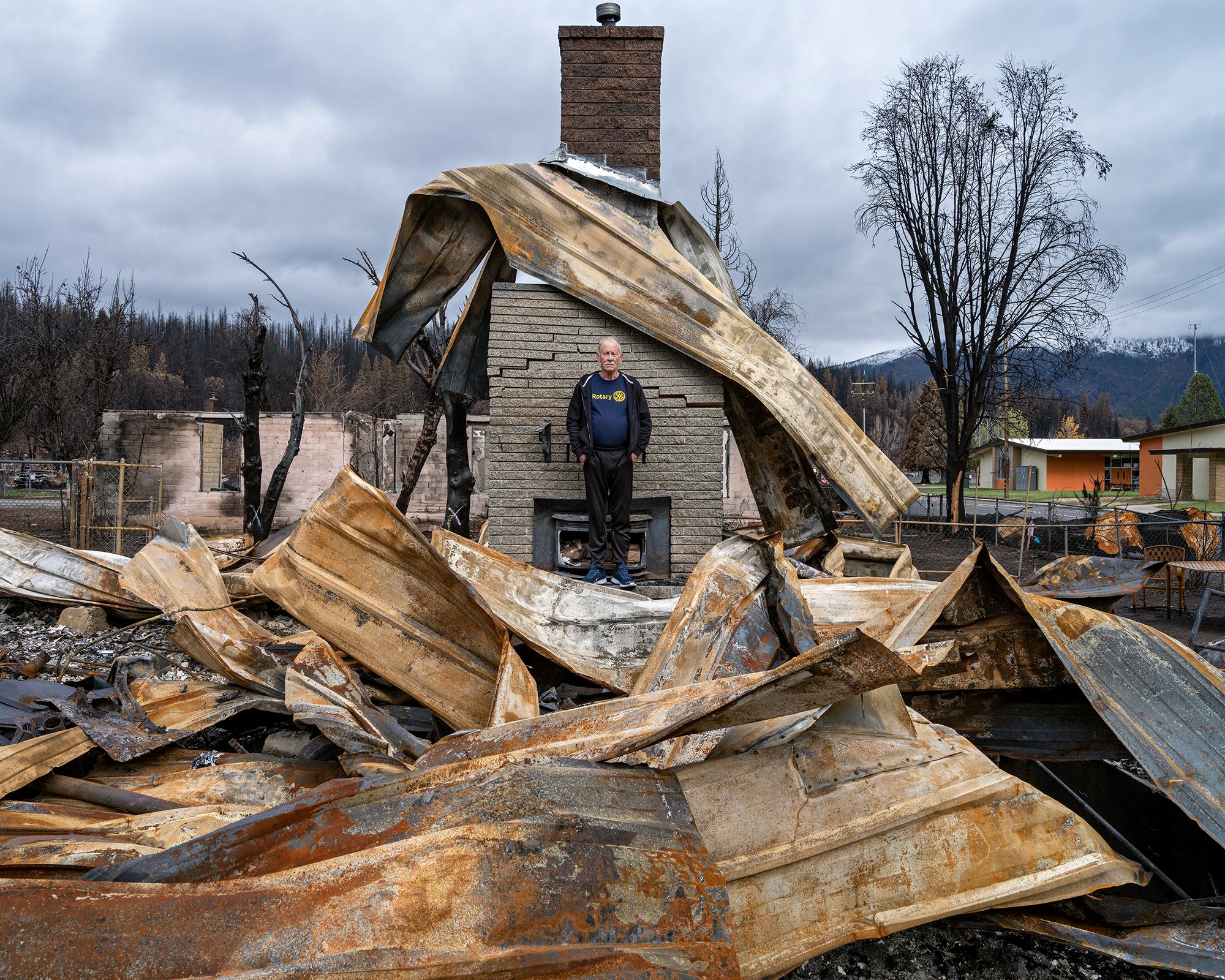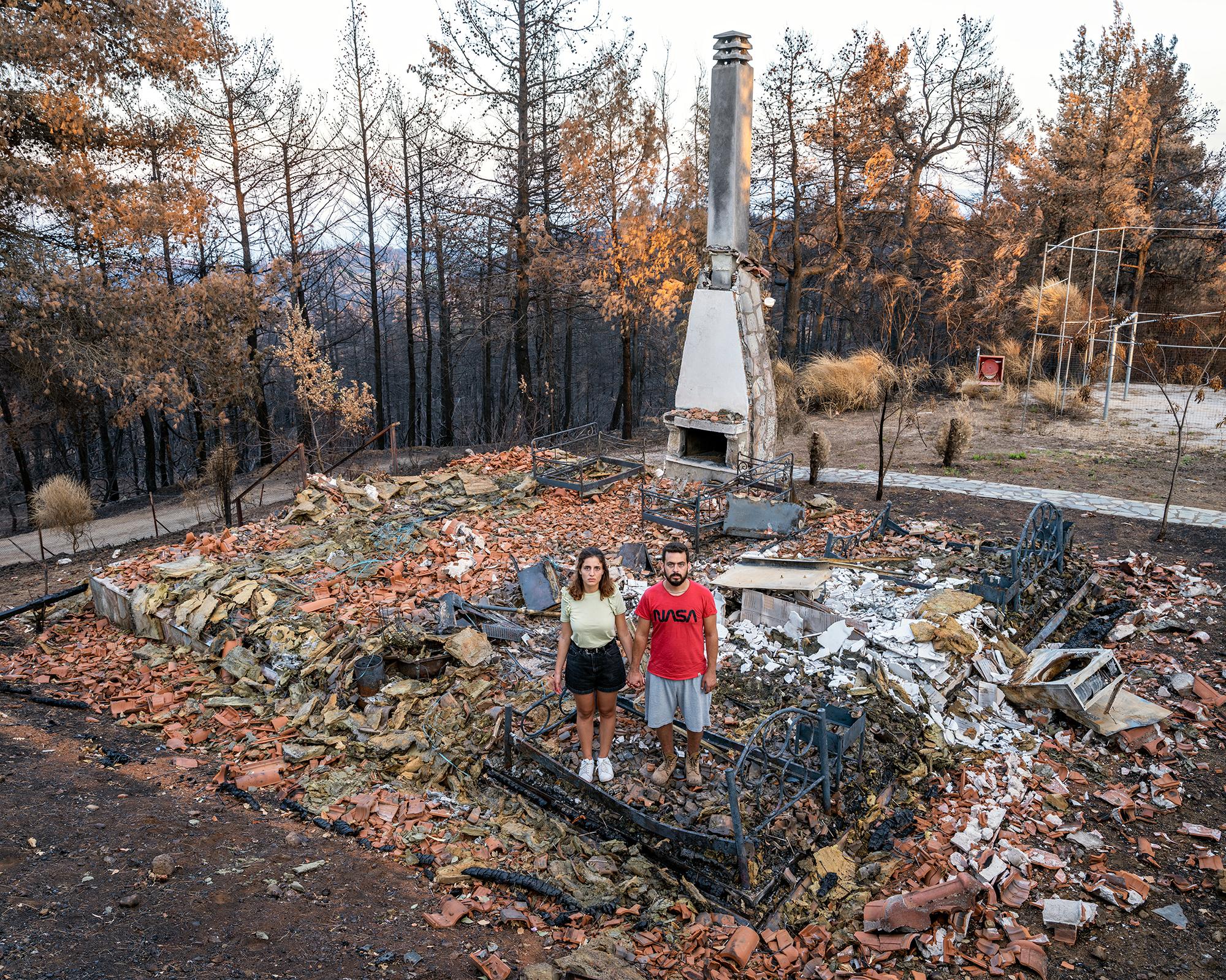 As our global temperatures rise we have seen an unprecedented increase in the extremity of wildfires around the world. In 2021 I travelled to Greece, Canada and the USA to document the aftermath of fires that had destroyed homes, killed numerous people and burnt millions of acres of land. I choose not to document the burning flames, but rather to seek out their aftermath. These portraits are made across different communities and cultures around the world. My subjects pause and engage the camera, looking out from their devastated lives. While their poses may seem conventional, the context is catastrophe, and their gazes are unsettling. They are not disempowered victims: in their encounter with the camera they invite us to engage with the calamity that has befallen them, bearing witness to the impacts of climate change which will be so much worse unless meaningful action is taken.