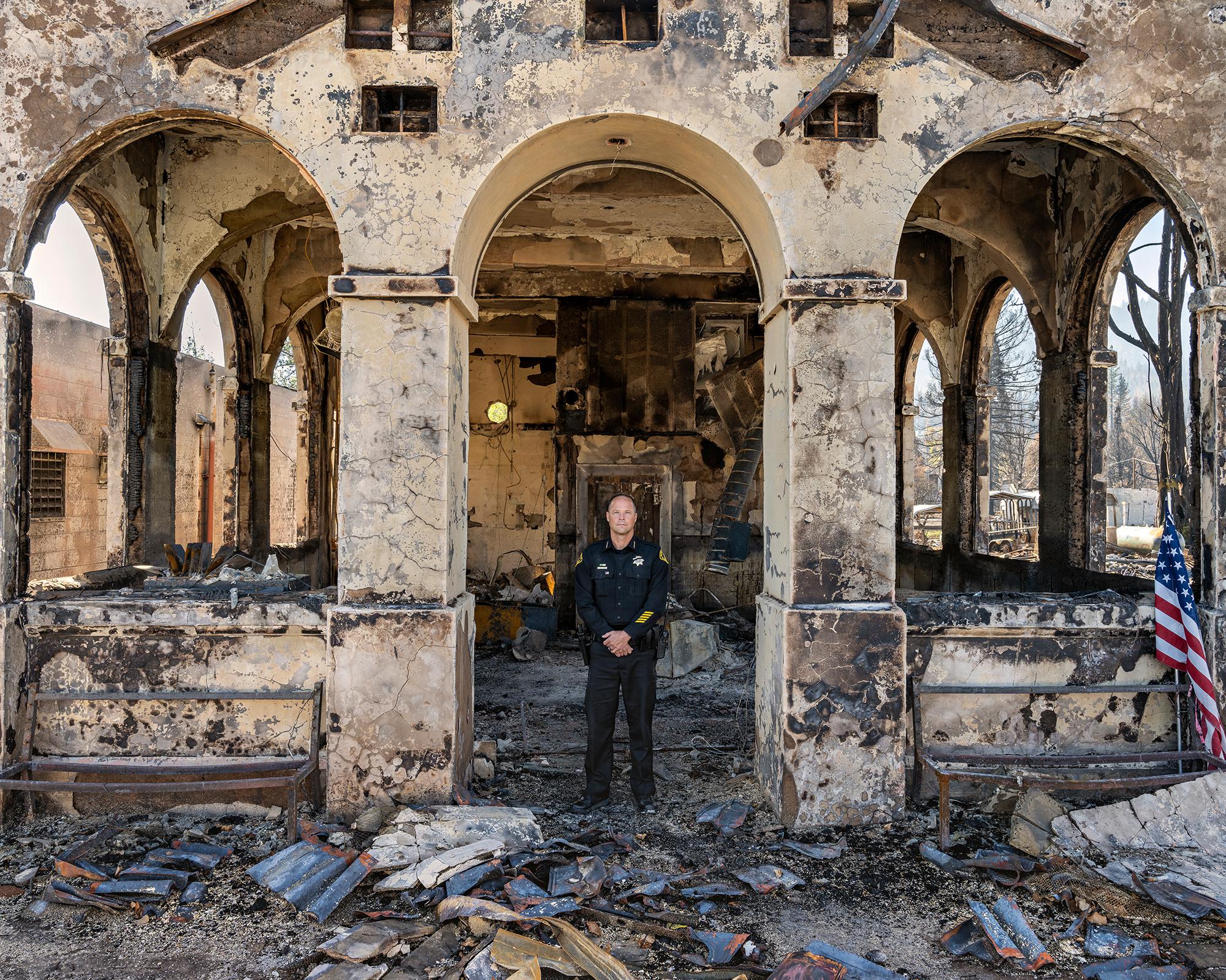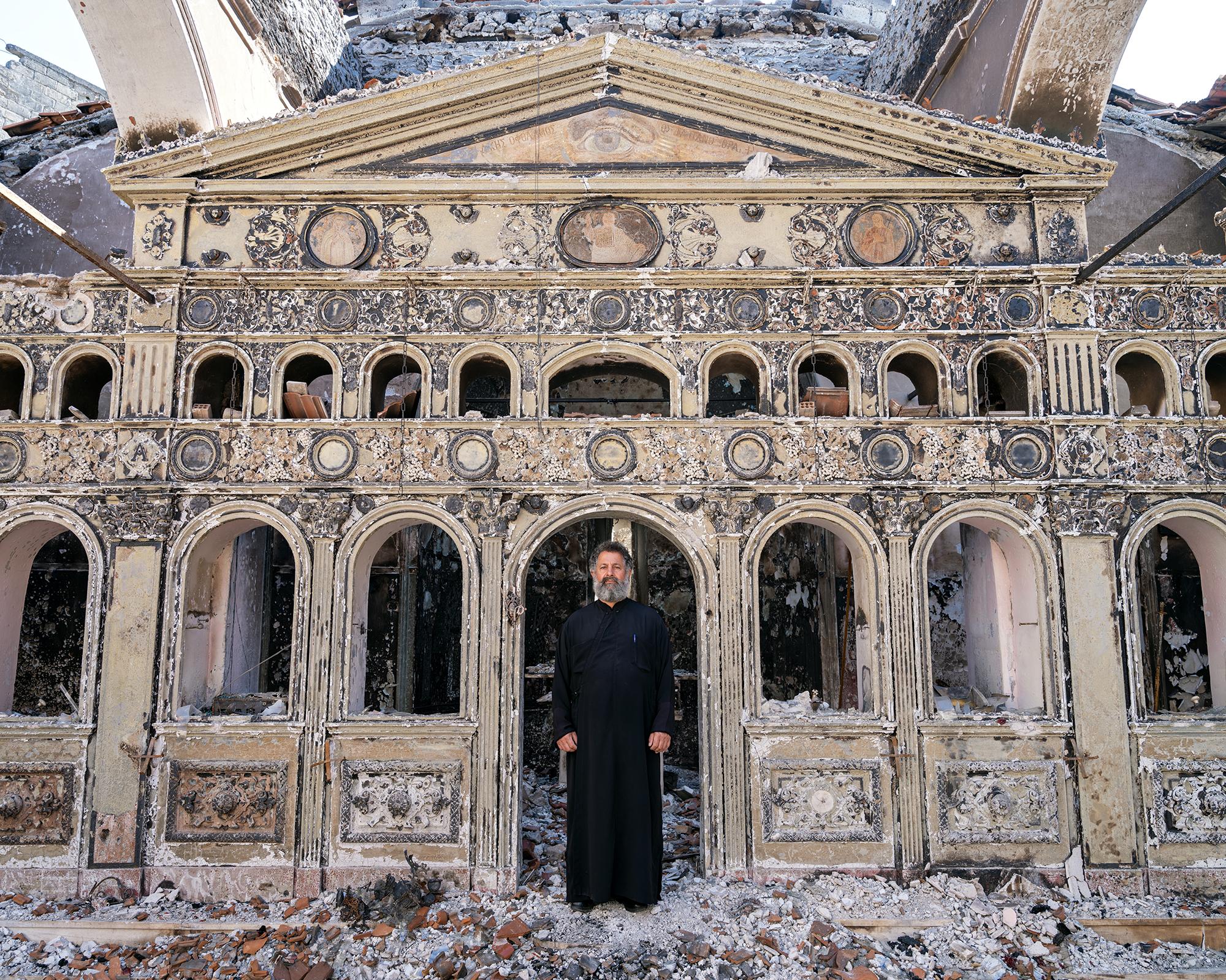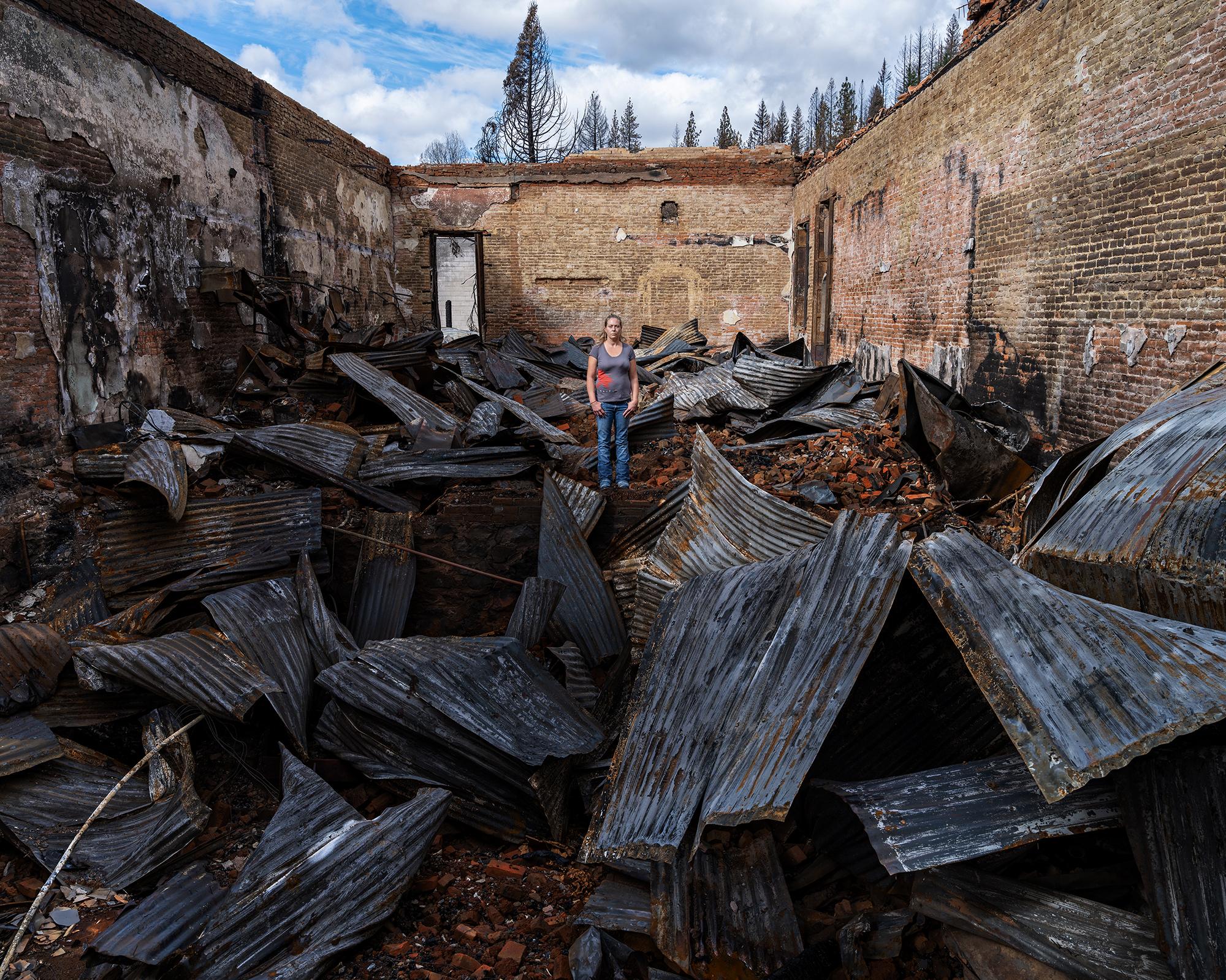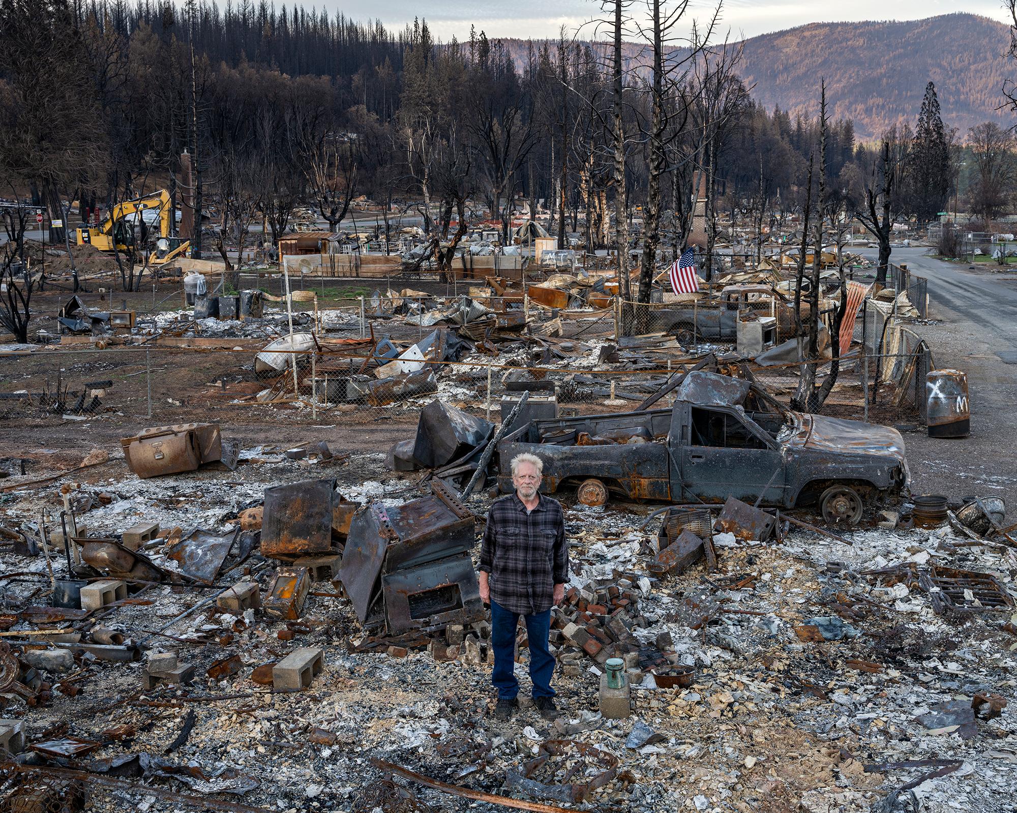 As our global temperatures rise we have seen an unprecedented increase in the extremity of wildfires around the world. In 2021 I travelled to Greece, Canada and the USA to document the aftermath of fires that had destroyed homes, killed numerous people and burnt millions of acres of land. I choose not to document the burning flames, but rather to seek out their aftermath. These portraits are made across different communities and cultures around the world. My subjects pause and engage the camera, looking out from their devastated lives. While their poses may seem conventional, the context is catastrophe, and their gazes are unsettling. They are not disempowered victims: in their encounter with the camera they invite us to engage with the calamity that has befallen them, bearing witness to the impacts of climate change which will be so much worse unless meaningful action is taken.