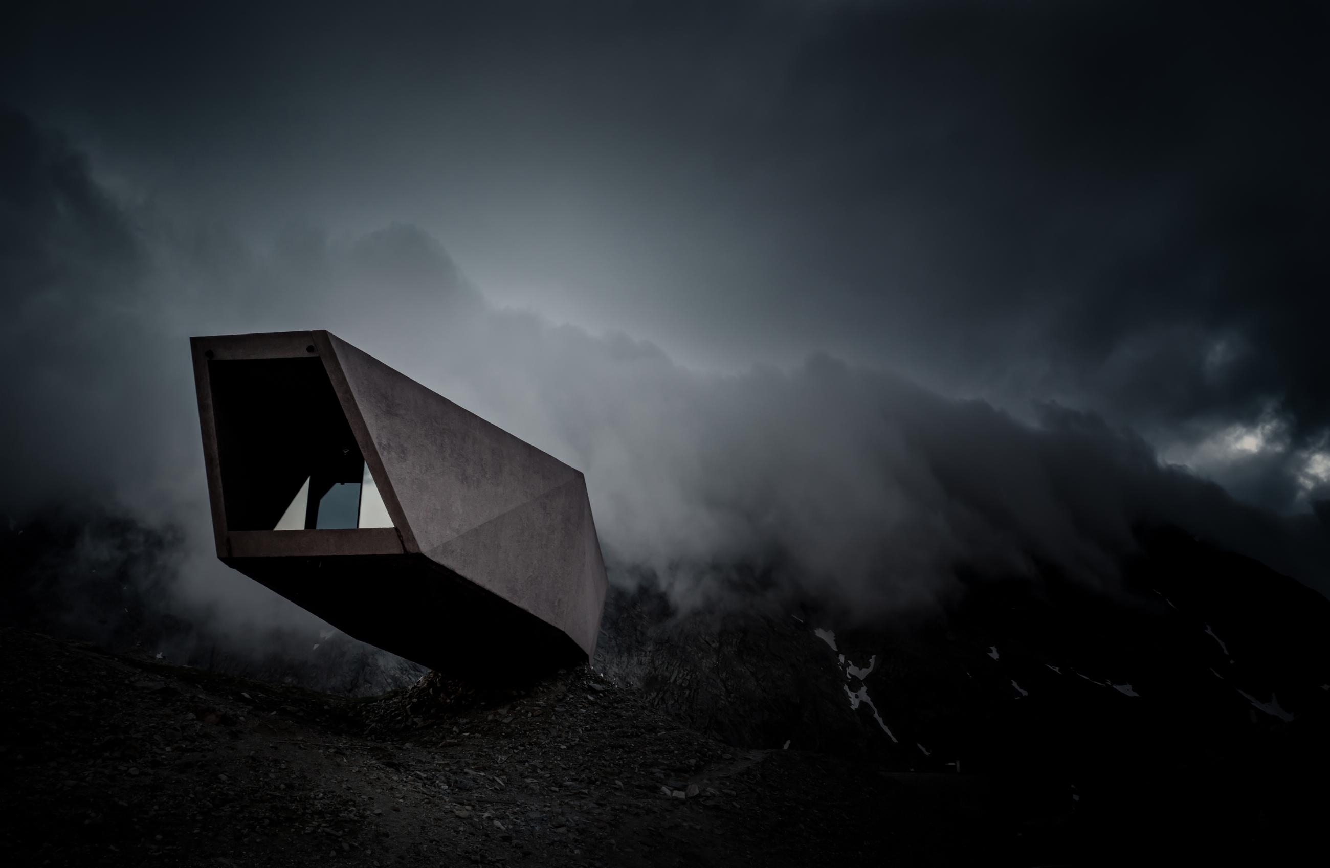 The Pass Museum on the Timmelsjoch is located at an altitude of 2,509m and documents the history of the Alpine region between Tyrol and South Tyrol. It has the spectacular shape of a boulder and was built by the South Tyrolean architect Werner Tscholl in a very daring place. In search of unusual alpine architecture, I became aware of this impressive concrete building. I obtained permission to spend the night there because the pass road would close overnight. Suddenly, heavy dark clouds appeared, which then seemed to cling to the mountains. Strong wind and freezing cold snow showers surprised me. The atmosphere was incredibly intense. The museum seemed to loom menacingly out of the mountain, like an observer seeing everything and everyone.