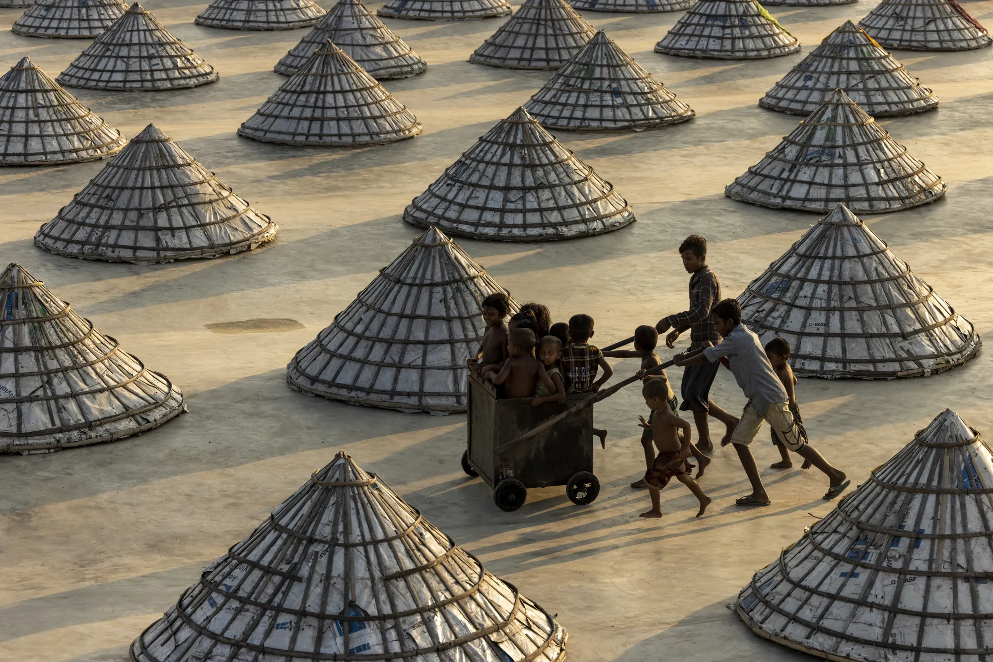 Children weave in and out of scores of giant cones or topas, as they roll a wagon around a rice processing plant. The cart is used by workers to carry rice and put it down for drying, but after they have finished with it, the children use it as a toy to play with. More than 30 children turned this rice mill in Bahmanbaria, Bangladesh, into an obstacle course.