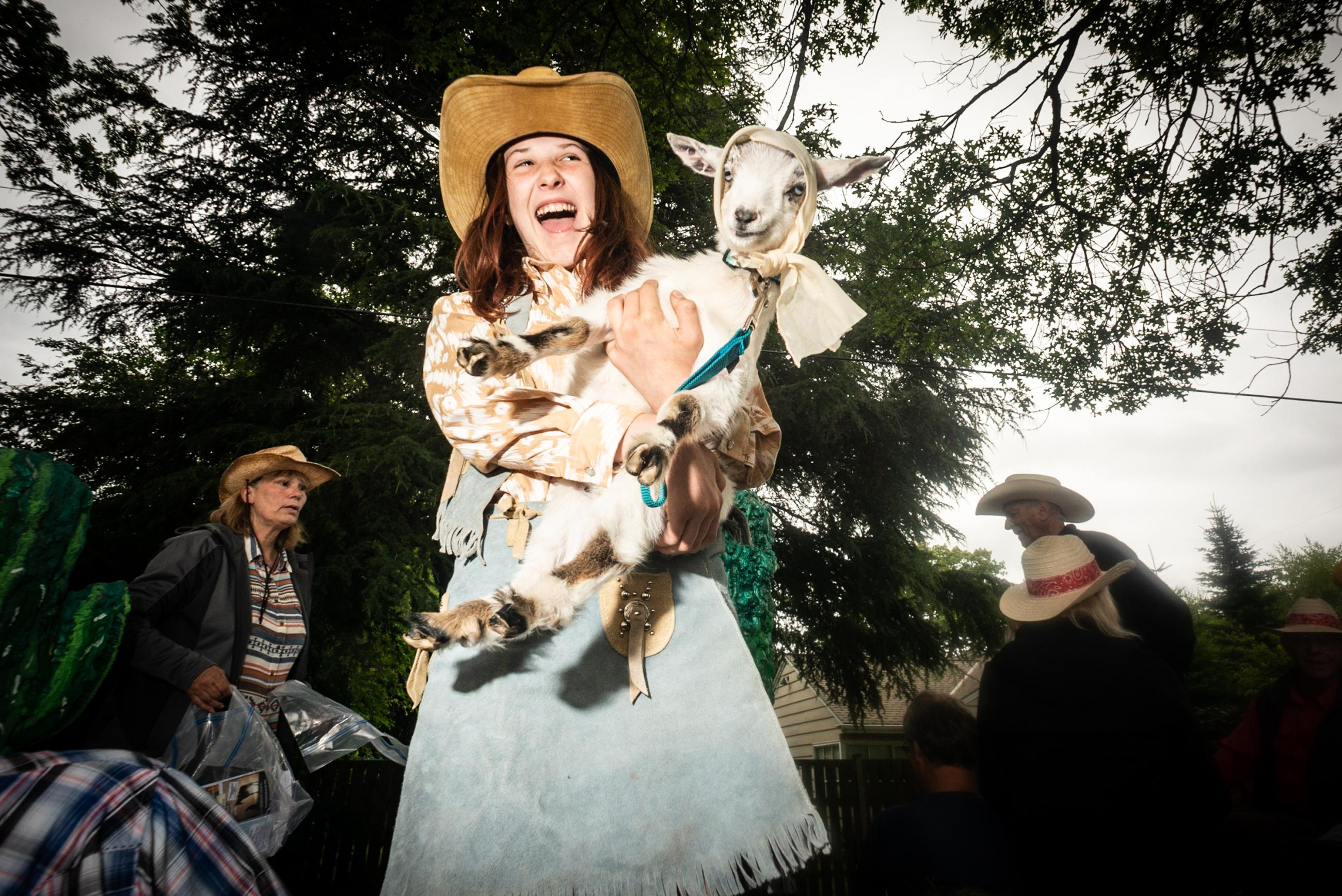 For my Small-Town Celebrations series I have been photographing small-town celebrations throughout the Pacific Northwest, a distinctive part of the North American continent. This photograph was taken on 4 July 2022 in Sedro-Woolley, WA, as a patriotic young cowgirl struggled with a goat in a bonnet. Shooting with an off-camera flash helped me to isolate my subjects from the stormy sky in the distance.