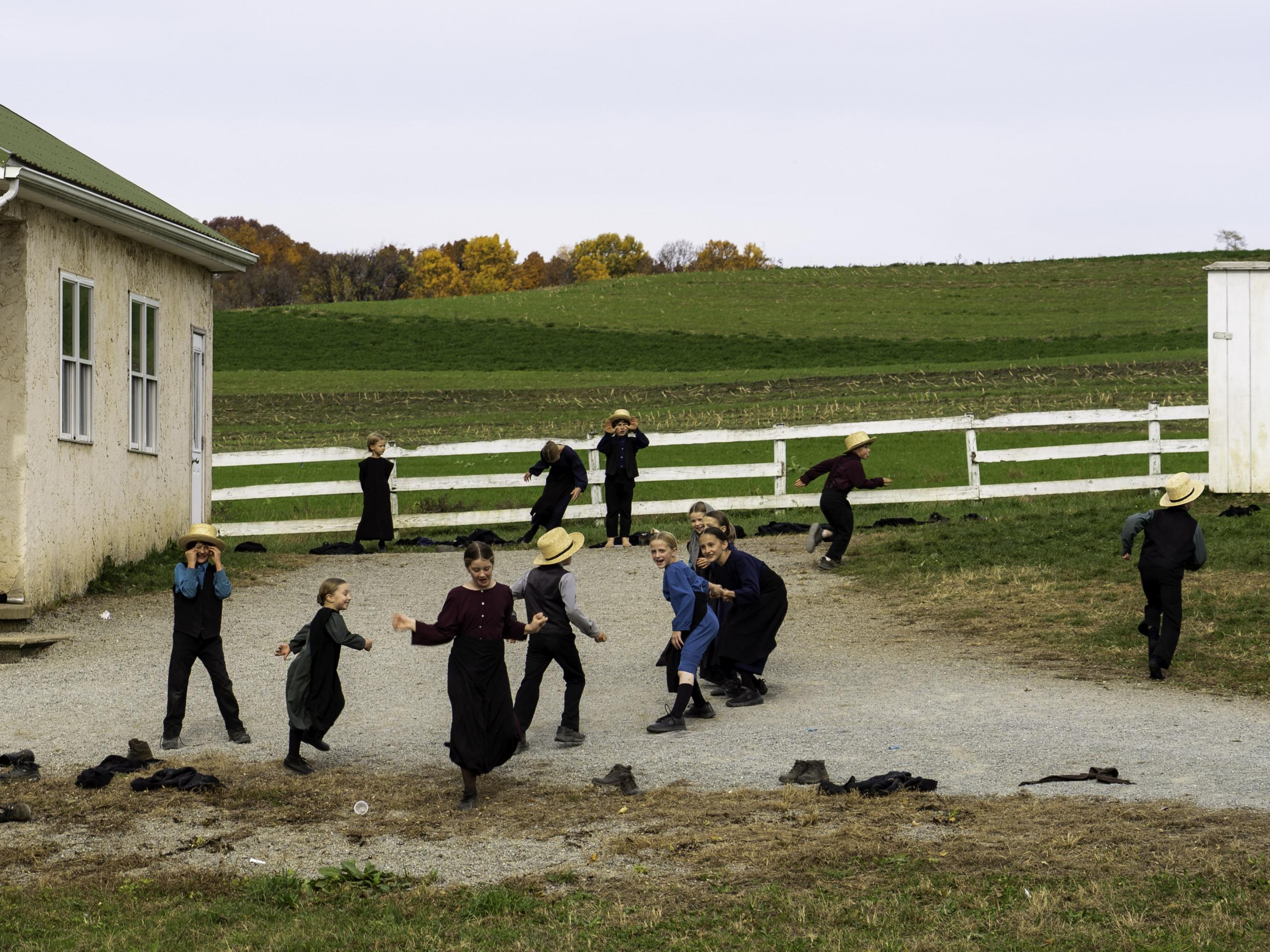 Playtime in an Amish schoolyard. This photograph was taken from a moving car in October 2022.