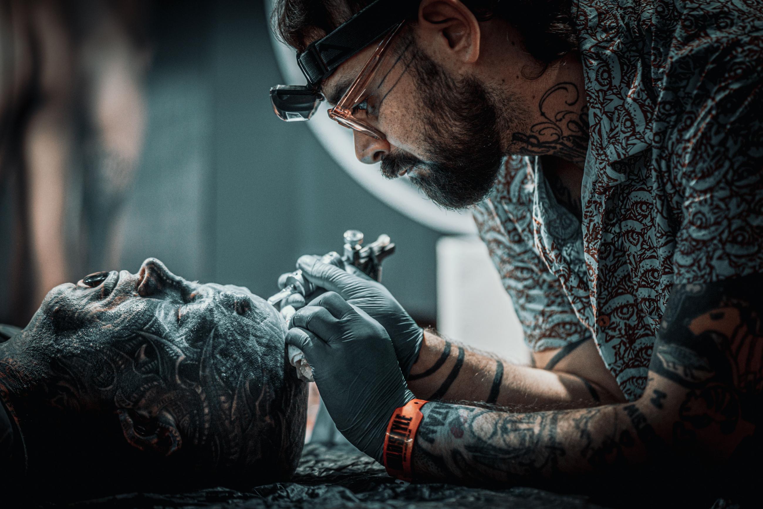 This was a very interesting scene between two artists, which I photographed at a tattoo fair in Austria in spring 2022. The halo behind the tattooist makes the scene more attractive.