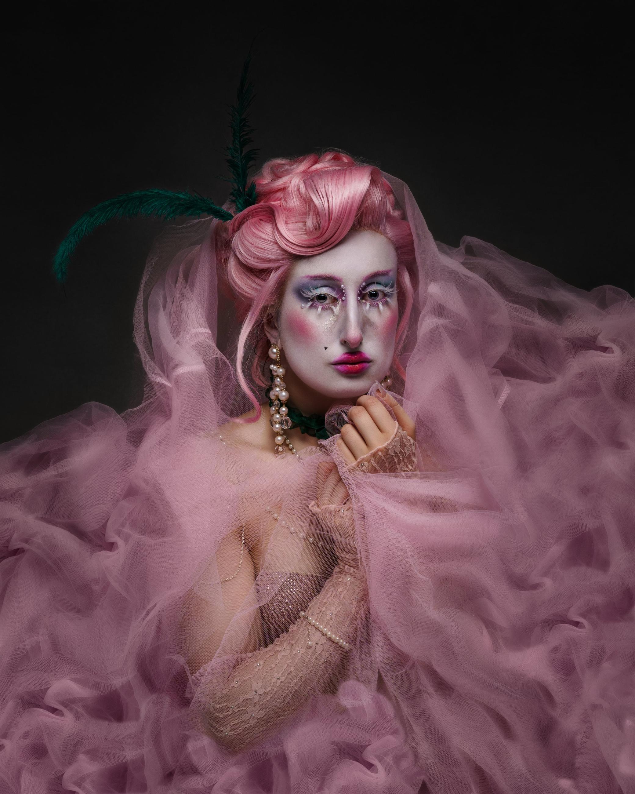 A drag artist wrapped in tulle. This image was taken in my studio in Stratford, London, using a one-light setup.