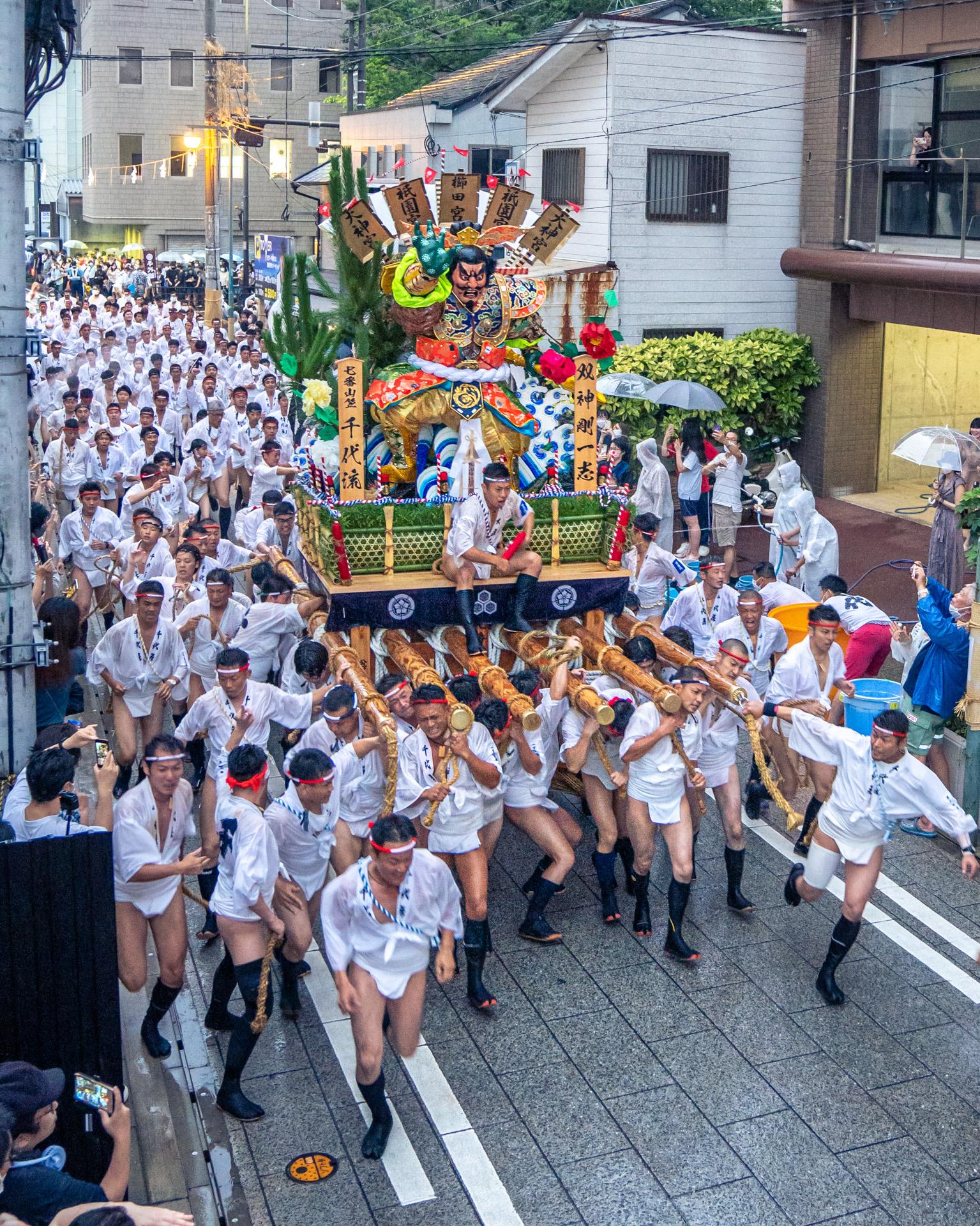 The Hakata Gion Yamakasa is a festival celebrated in the 1st half of July in Fukuoka City, the largest city in Japan’s southwestern island of Kyushu. Several teams of men would race around the city before the break of dawn, carrying one-ton wooden floats known as the Kakiyama. The festival is believed to have an 800-year history, and attracts up to a million spectators each year. It was designated an Important Intangible Folk Cultural Property of Japan in 1979.