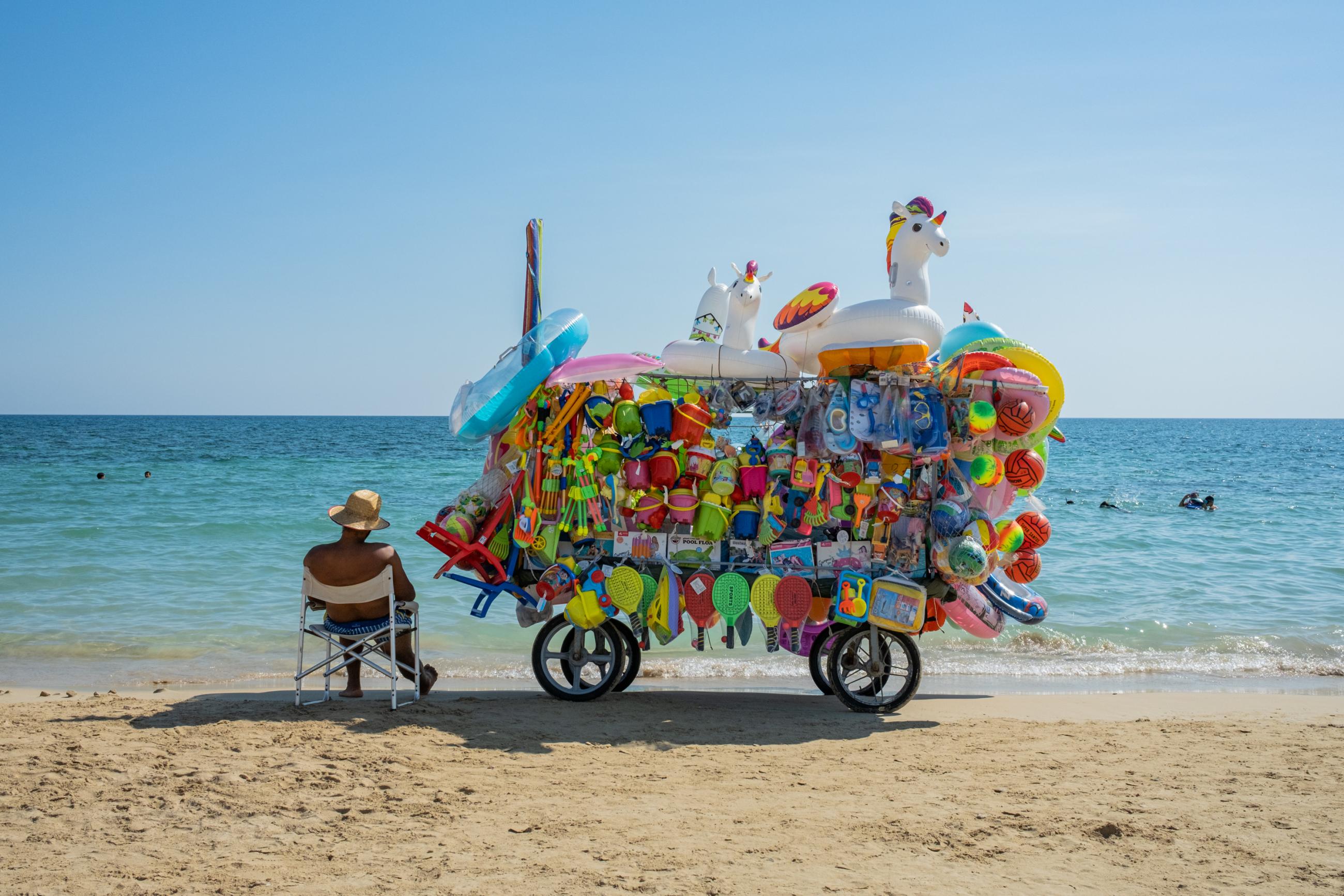 A beach seller sitting down next to his stall in Puglia, Italy.