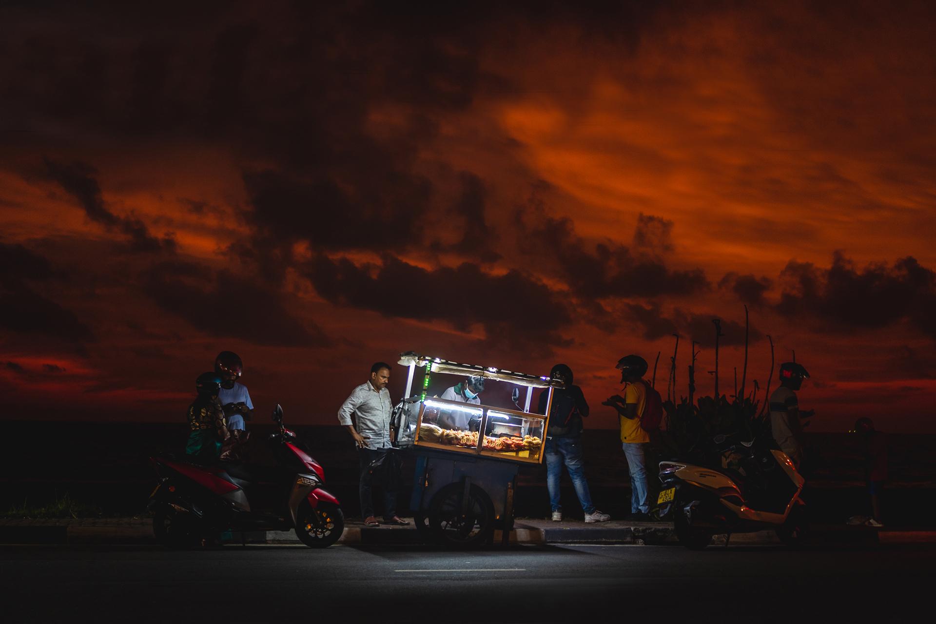 Sunset in Colombo, Sri Lanka, creates a fiery backdrop as people gather around a street food stall selling the famous isso wade, a savoury prawn snack food that is a local favourite. I couldn’t resist taking a photograph, which I shot handheld.