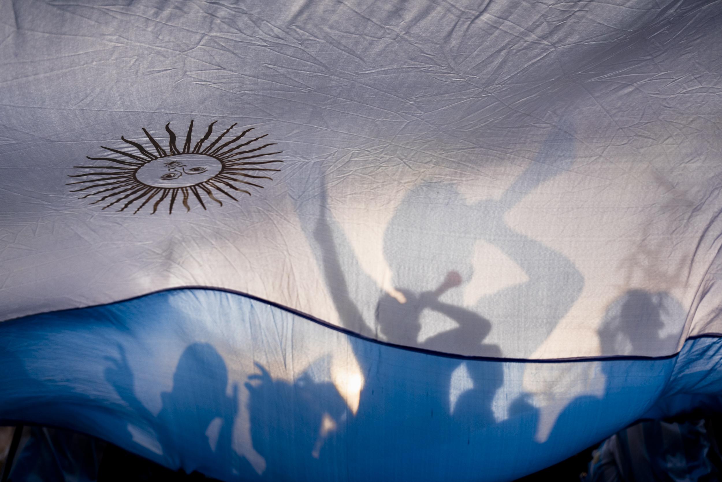 Argentina fans in Dhaka, Bangladesh, celebrate with a huge Argentine flag ahead of their match in the 2022 FIFA World Cup. Bangladesh has a large number of fans of the Argentina football team.