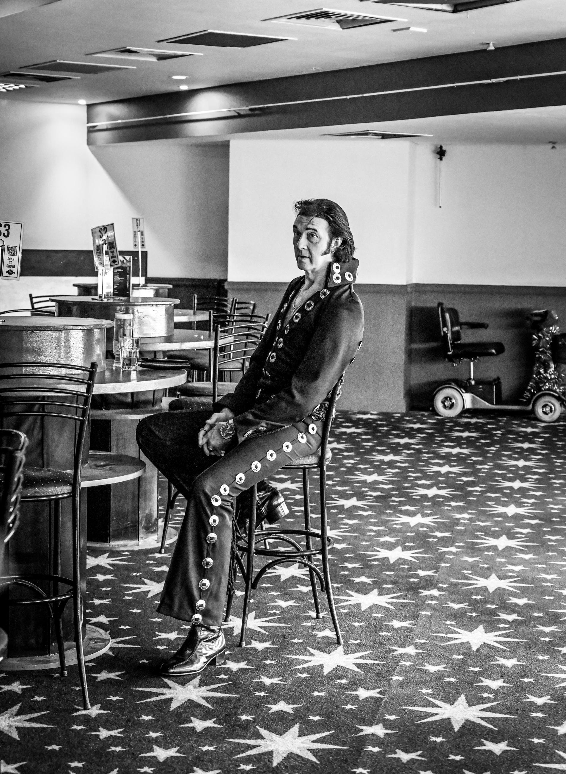 An Elvis tribute artist looks rather melancholy following their performance at the Viva Vegas venue in Blackpool, England.