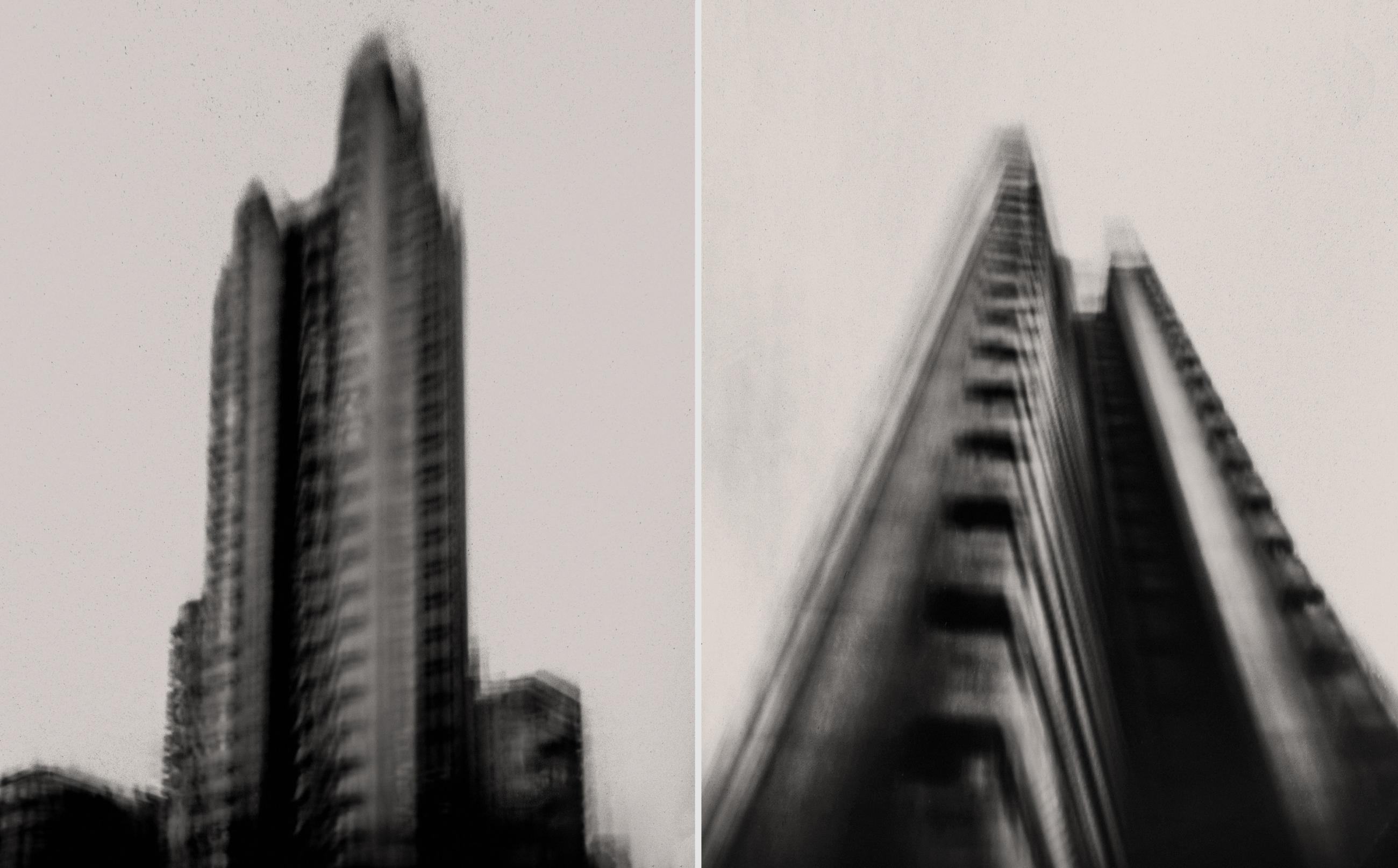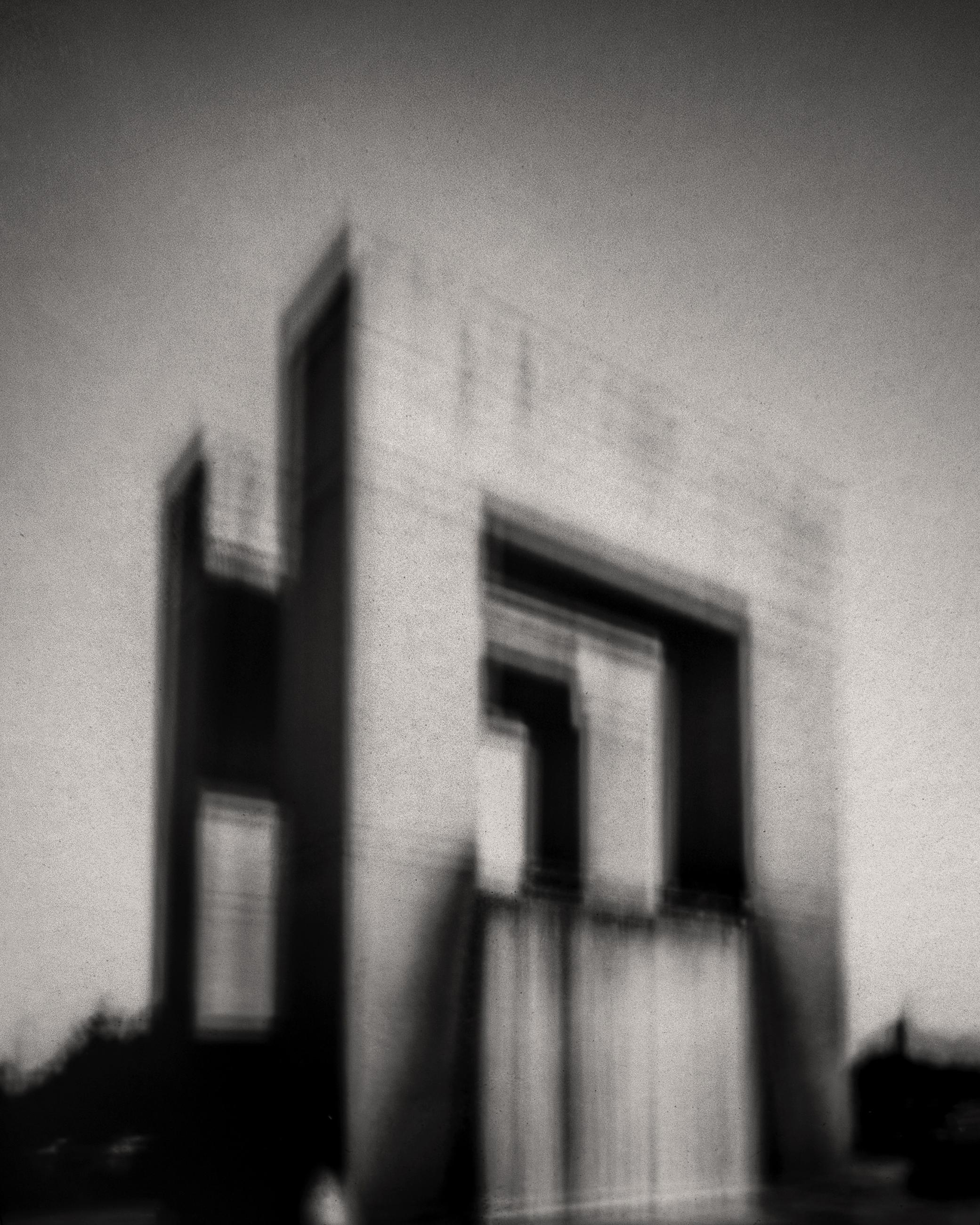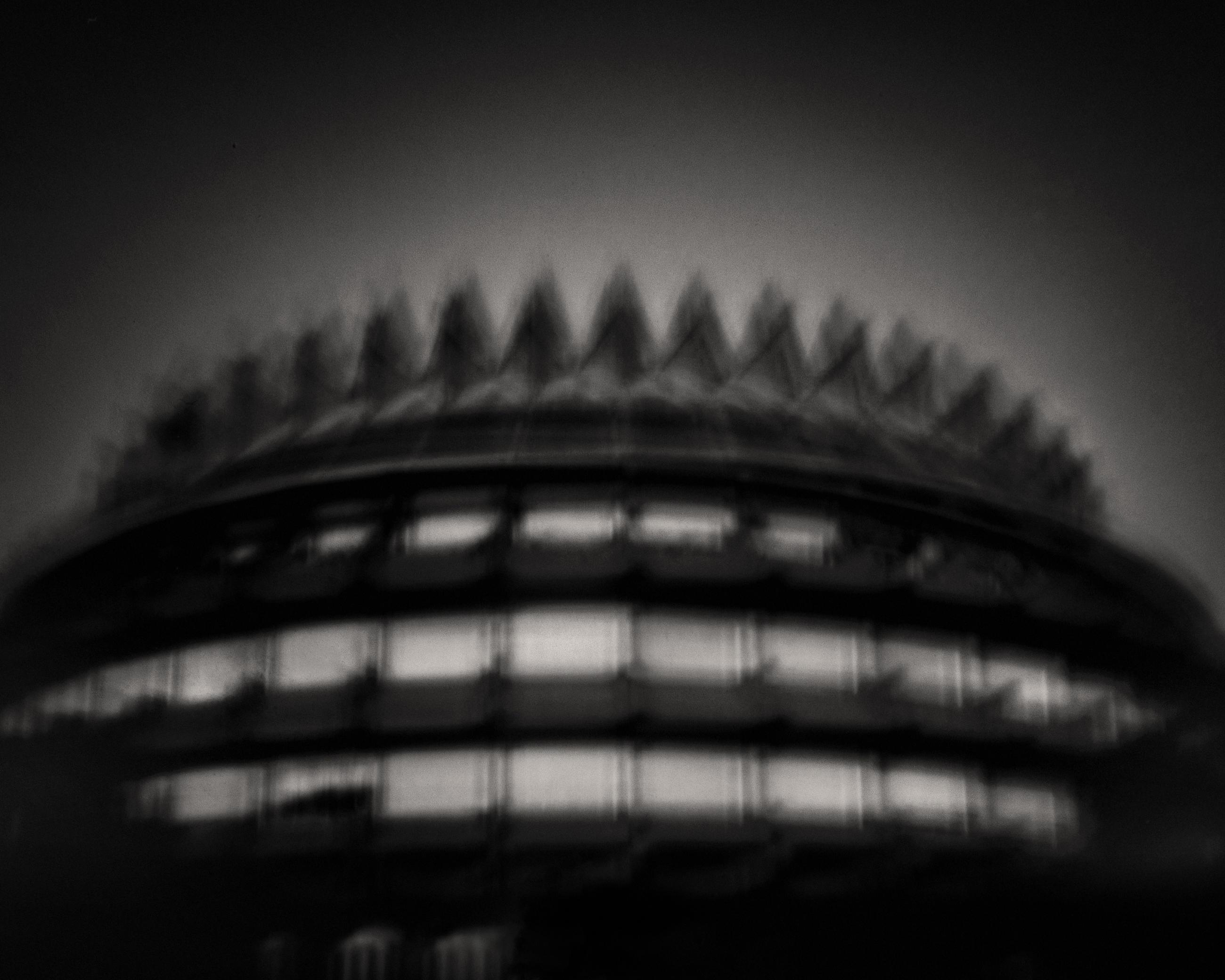 Photographing brutalist structures in Spain with a pinhole camera is based on the notion that they might be viewed differently, through long exposures which produce a less defined image with blurred lines. The resulting photographs show brutalist constructions overlaid with light, creating a dreamlike effect.