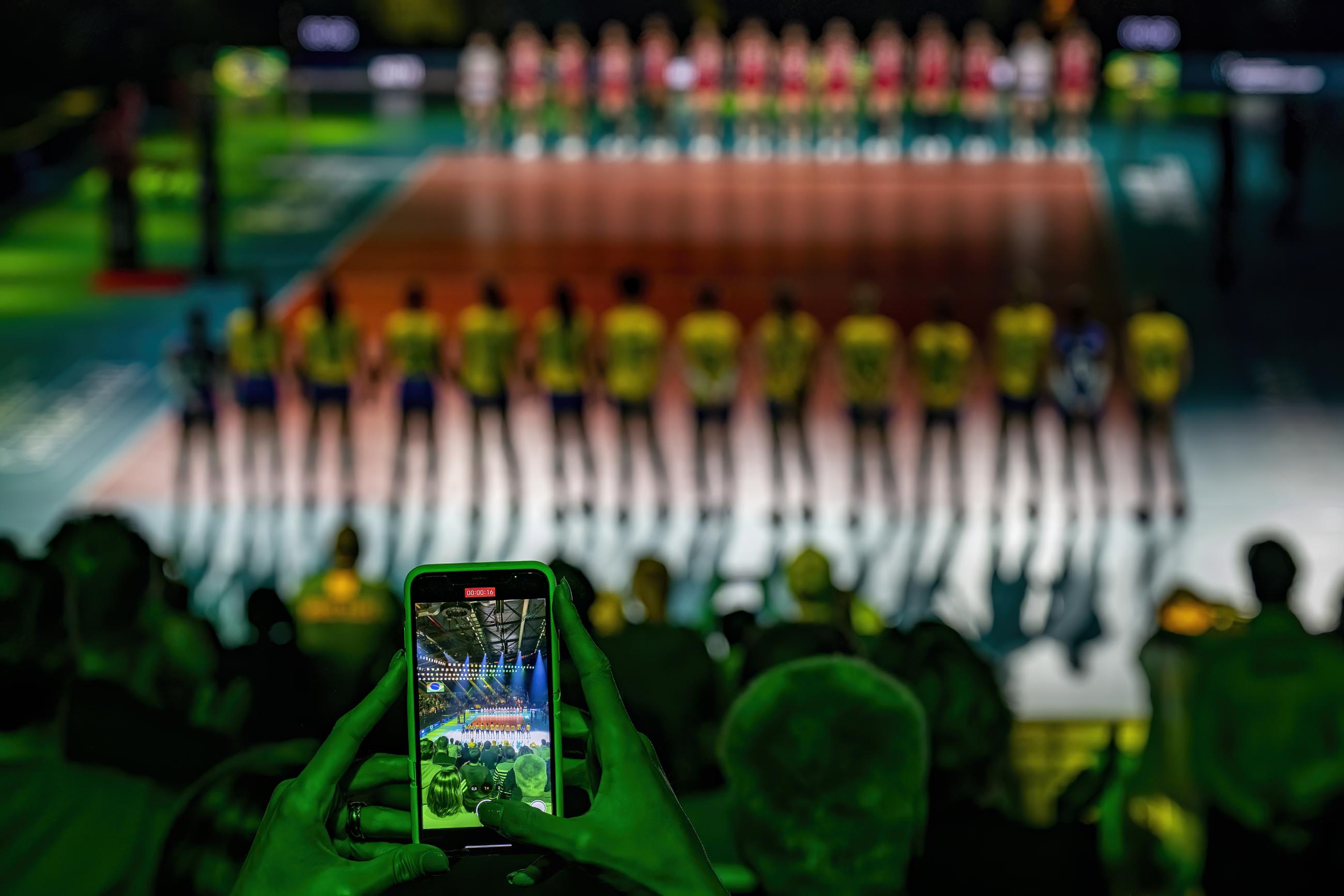 A spectator uses their phone to photograph the Brazilian and Japanese teams during the Volleyball Women’s World Championship.