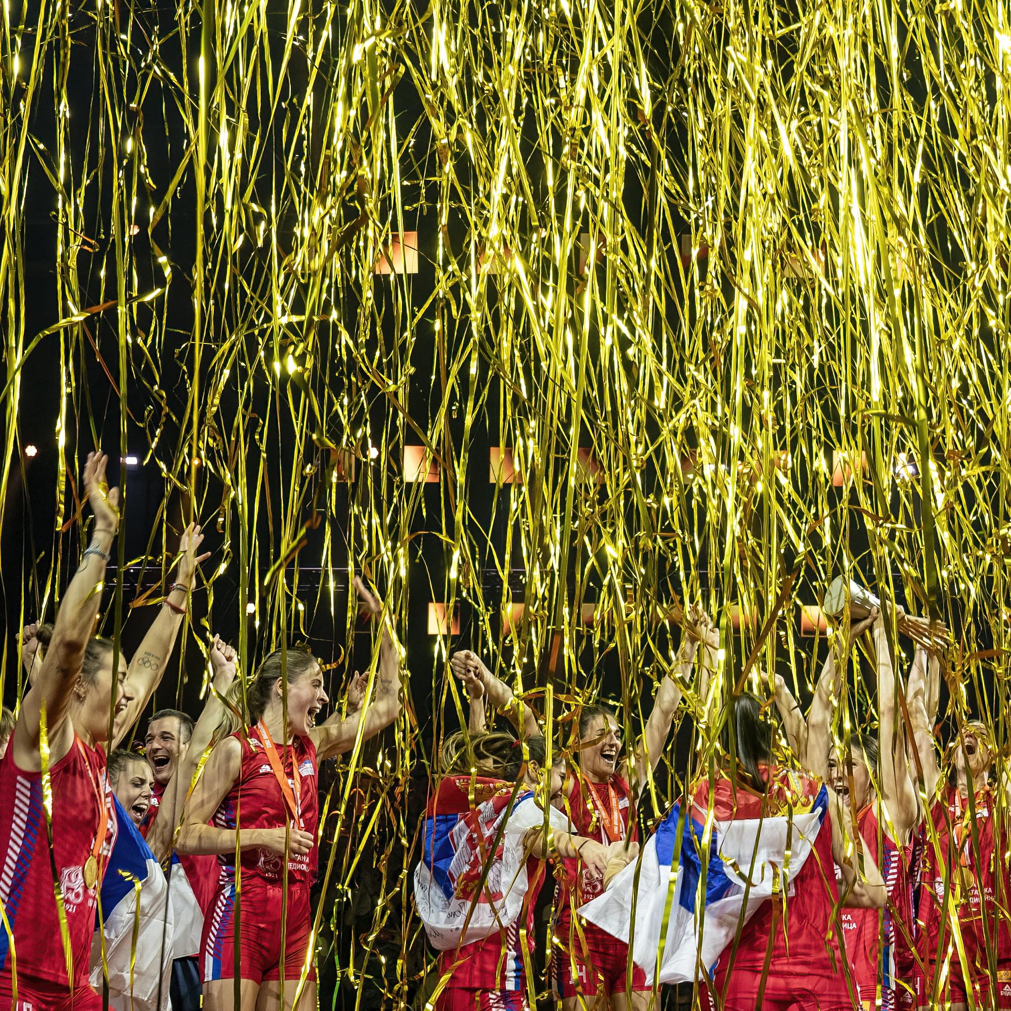 Serbia celebrates after winning the final of the Volleyball Women’s World Championship.