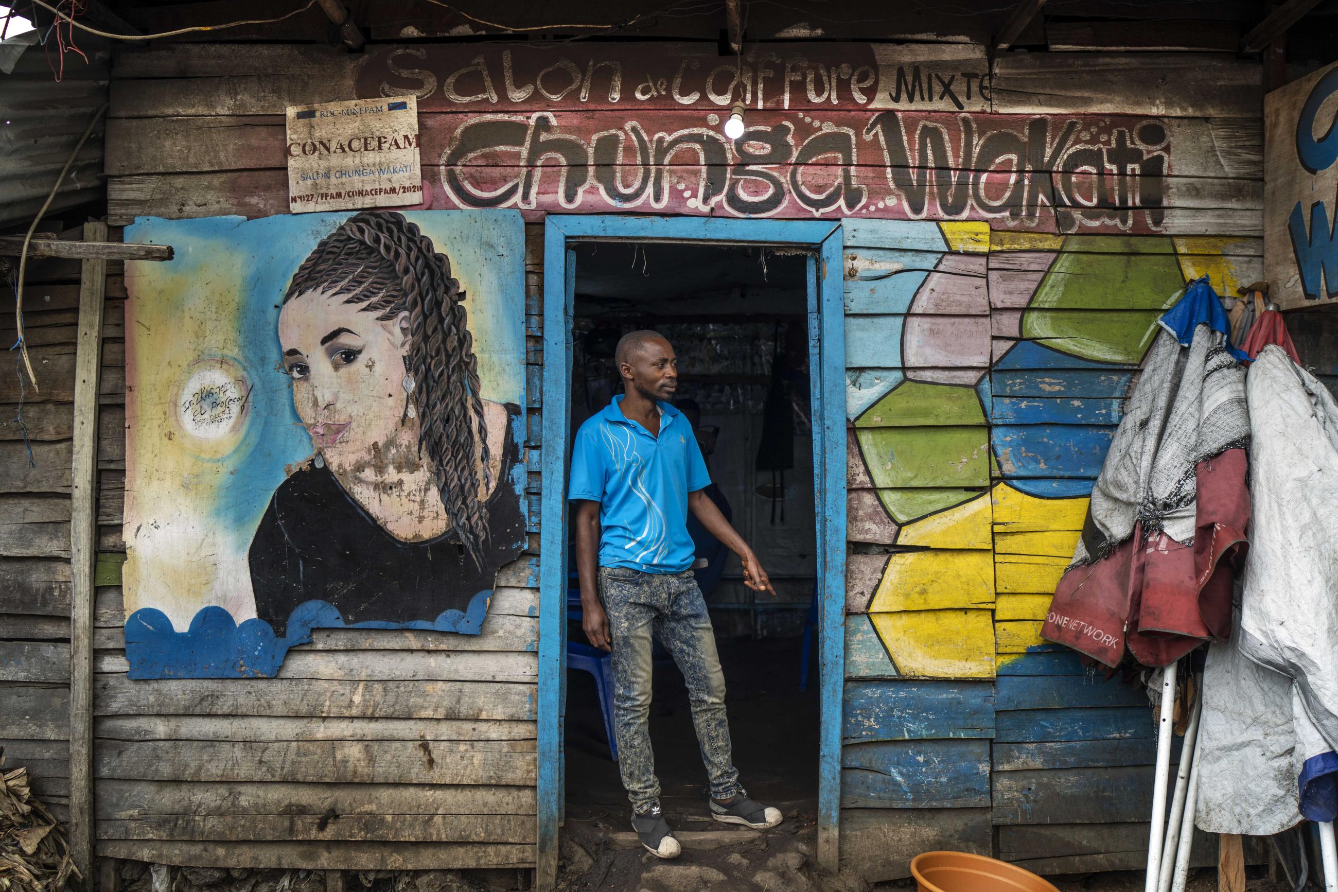 Saw (37) poses in front of his hairdressing salon in Goma, Democratic Republic of Congo, 26 November 2022.