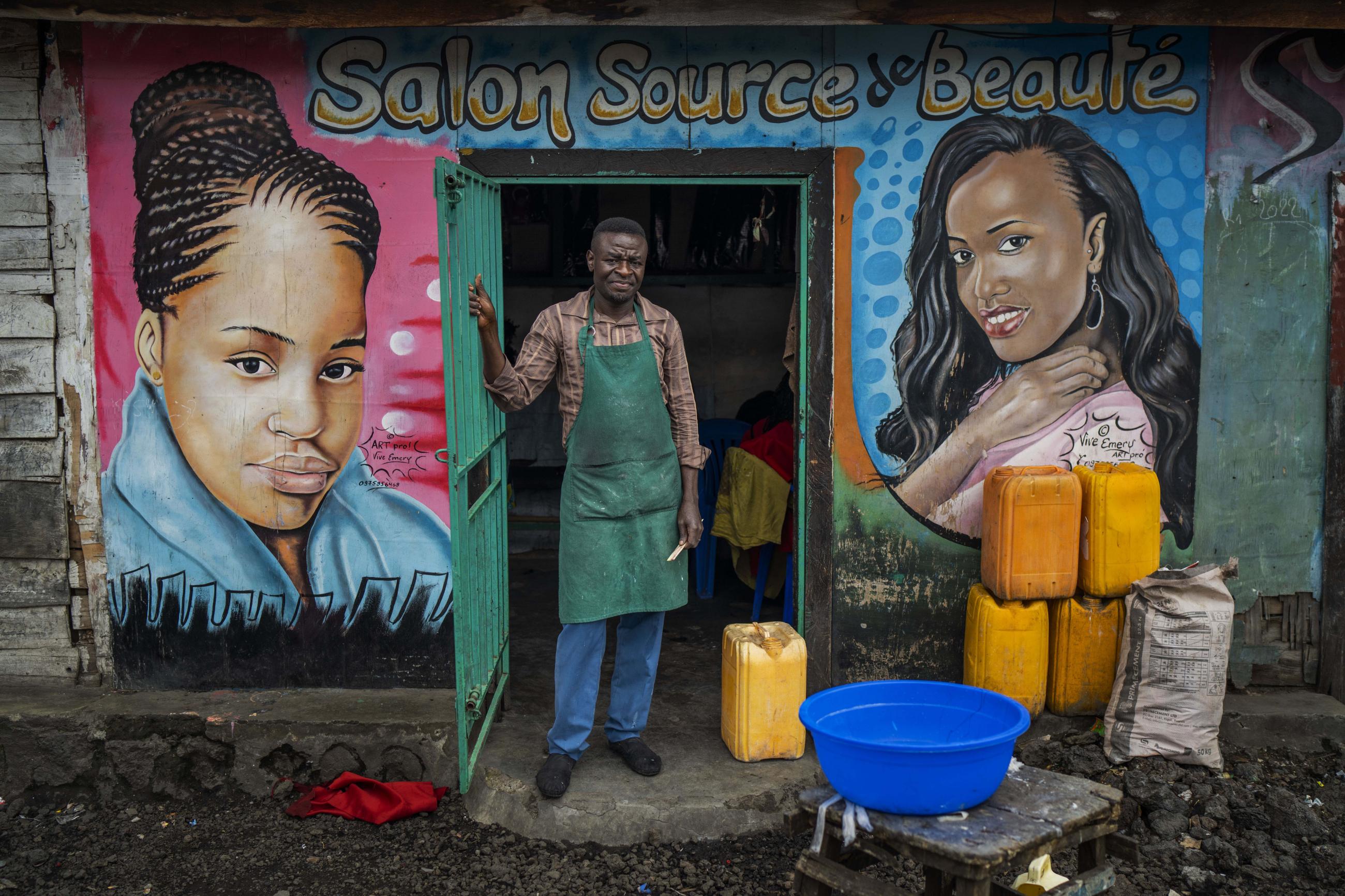 On the N2 highway leading north out of Goma in the Democratic Republic of Congo, colourful hair salon storefronts hide interiors full of customers. The customers are mostly women who are ready to spend their entire day getting the perfect hairstyle, whether it’s butterfly or tribal braids, or curly hair twists. Yet while most of the work is performed by women, it seems that the salons are owned by men, some as young as 20 years old. At a time of tension and economic uncertainty, the bold names and brightly coloured storefronts bring a sense of normalcy to residents who have contended with conflict and natural disasters for decades. The Salon Mixte, the Clinique de Beauté, the Just Love salon and the Salon King are all open for business and here to stay. Despite fighting between M23 rebels and FARDC government forces north of Goma, life goes on for residents of the lakeside town.