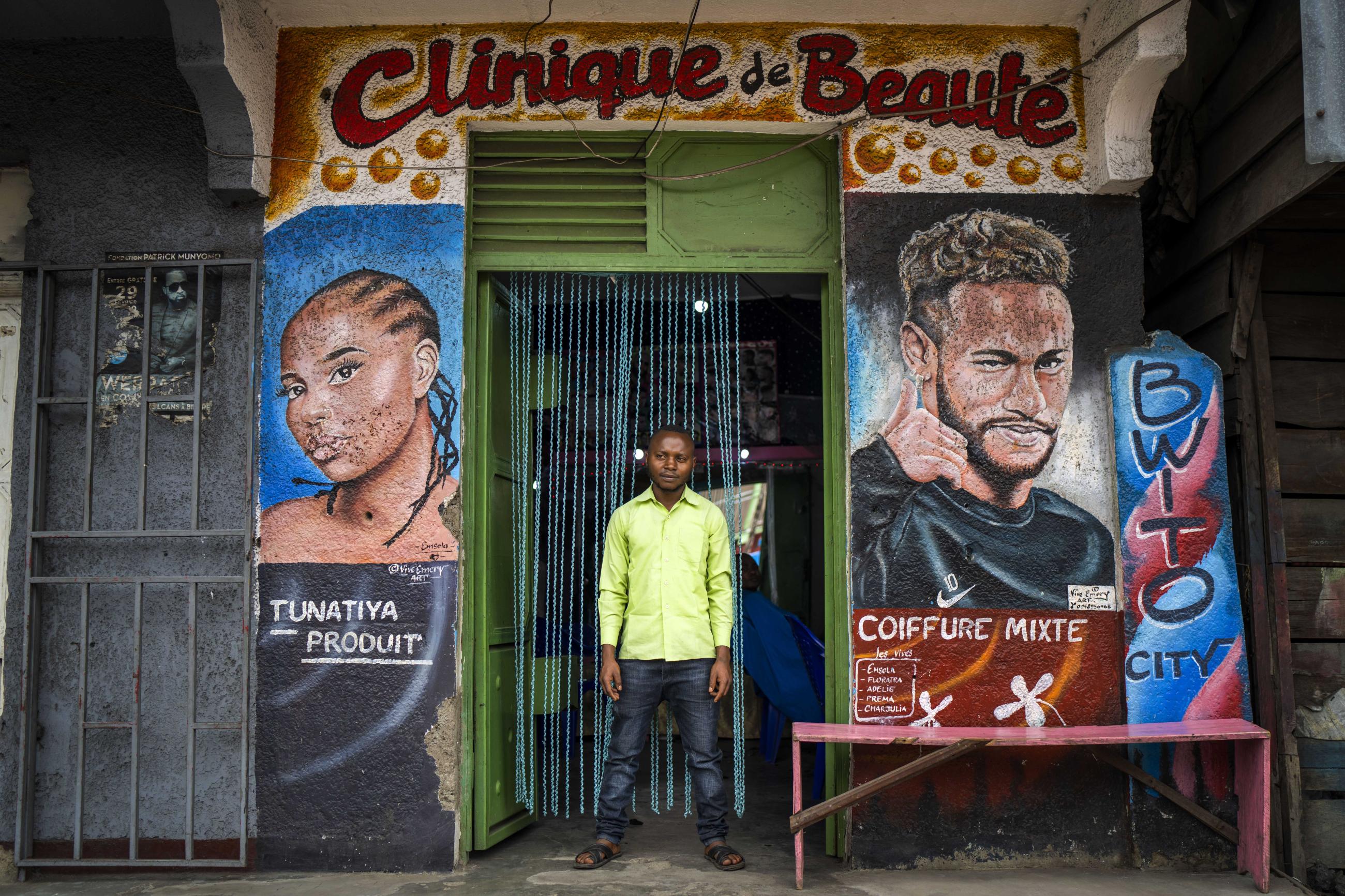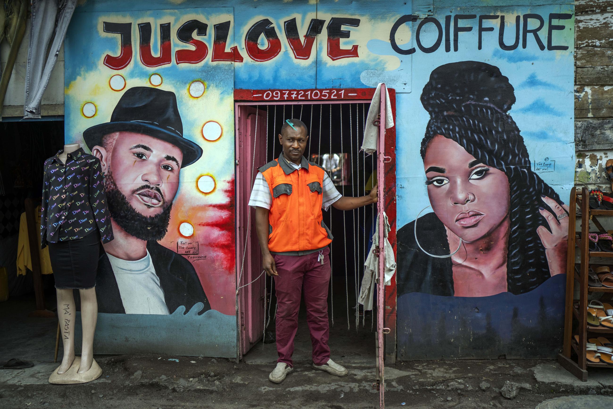 Jean Claude (27) poses in front of his hairdressing salon in Goma, Democratic Republic of Congo, 26 November 2022.