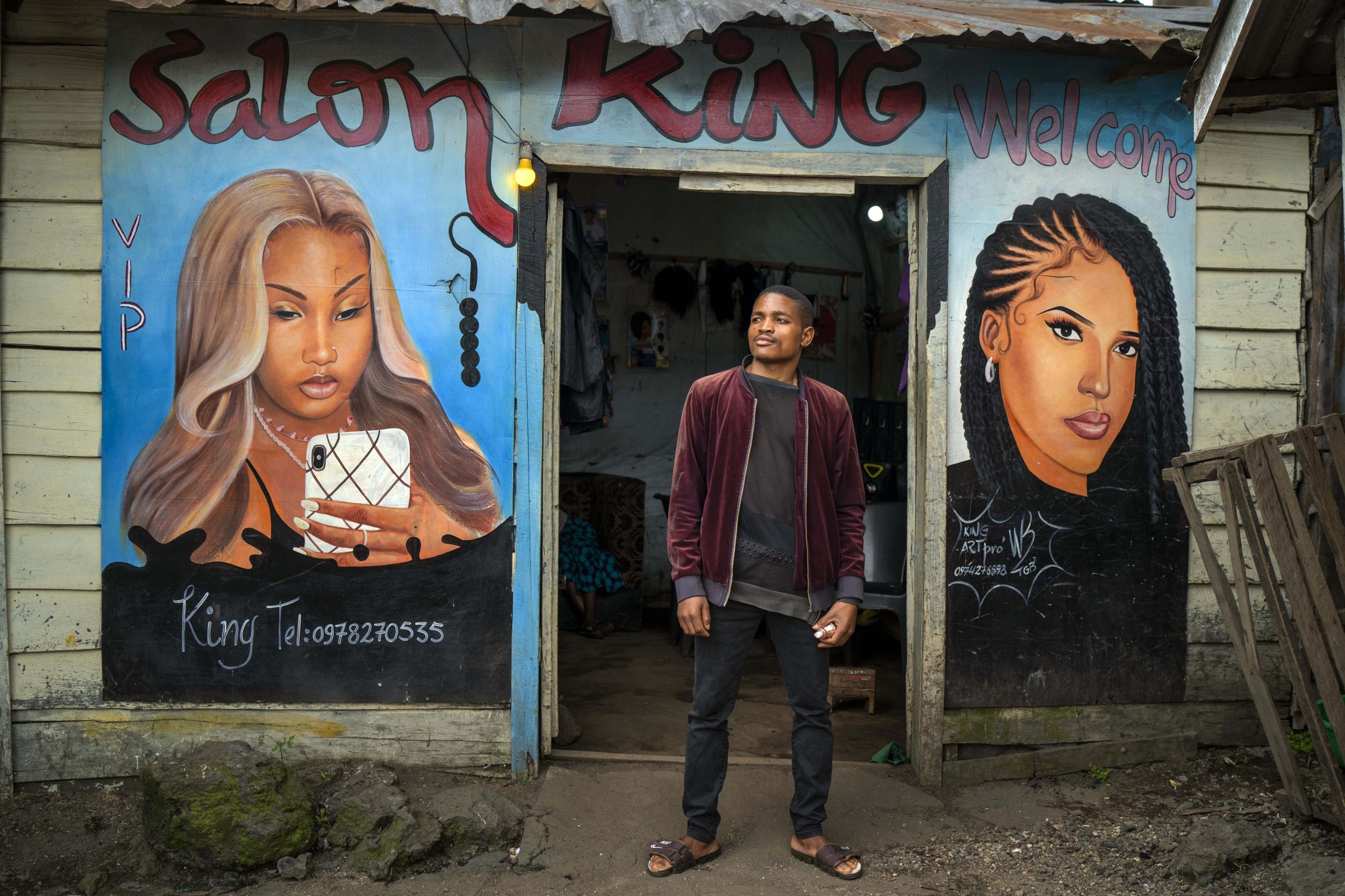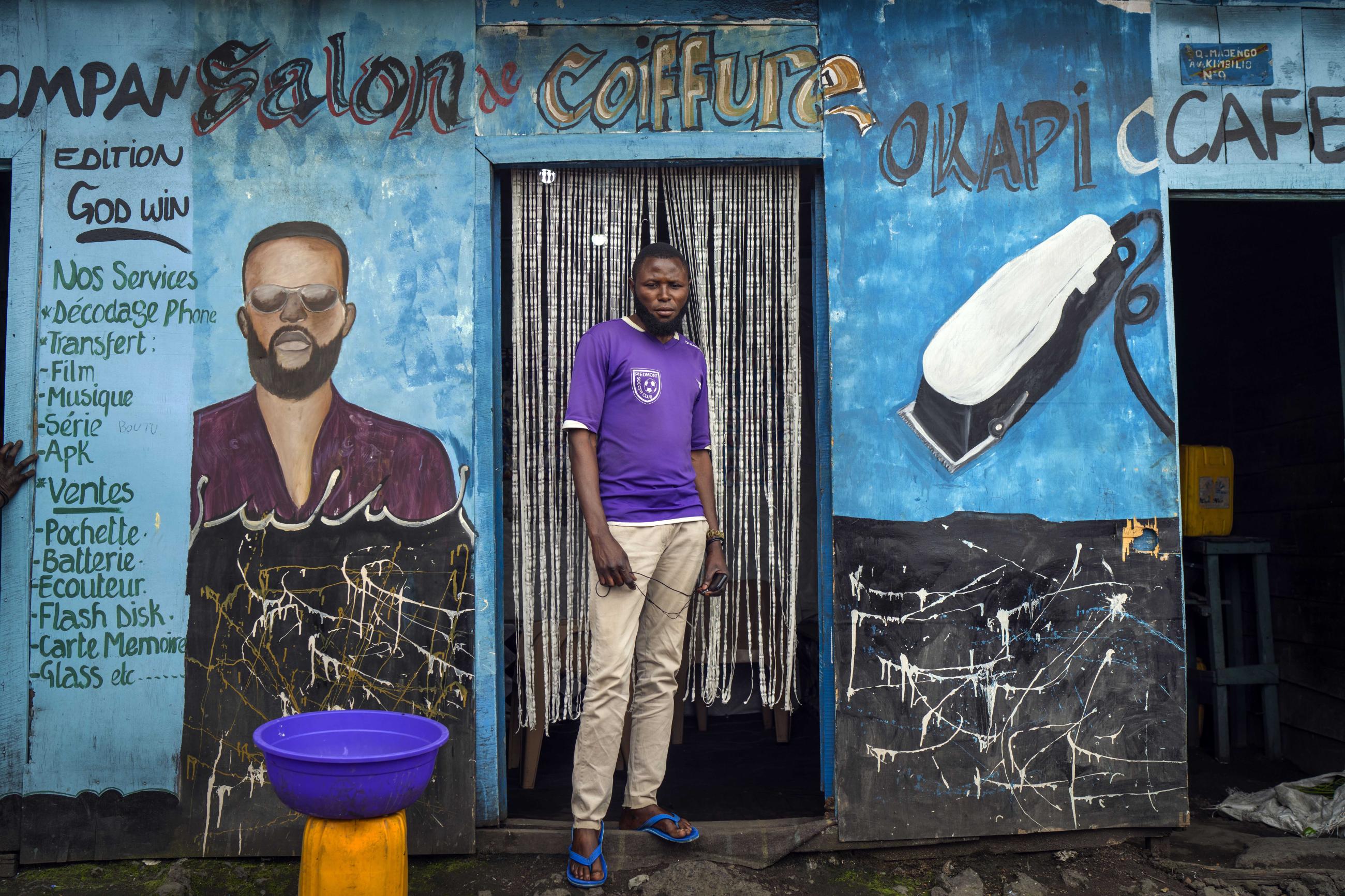 Kagheni (30) poses in front of his hairdressing salon in Goma, Democratic Republic of Congo, 26 November 2022.