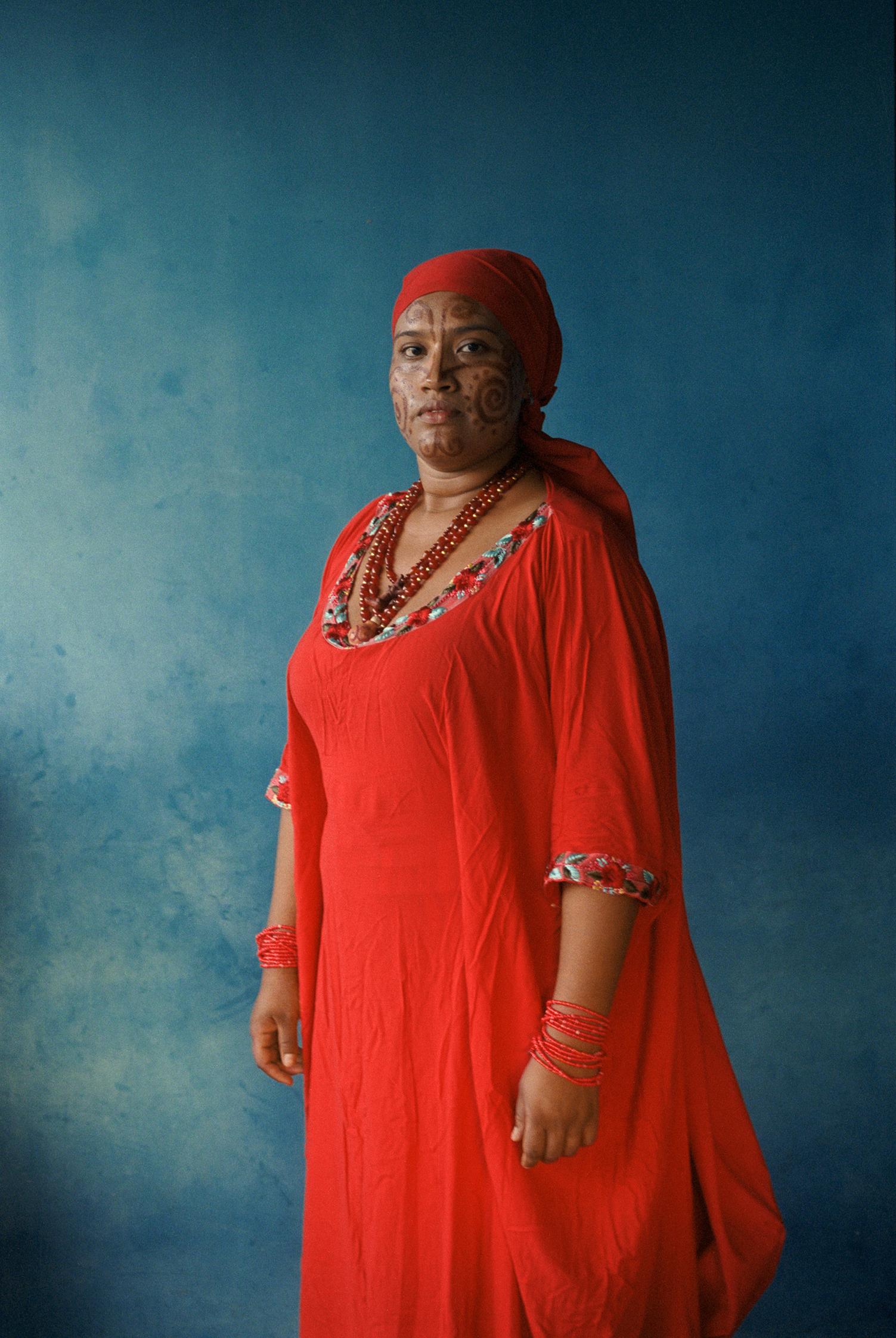 Erin Daniela Moscote Silva, the future leader of Pesuapa. Her dress is traditional and the patterns painted on her face are significant among the Wayuu people, symbolising their way of looking at life; past, present and future all interconnecting in the form of spirals. She graduated from university where she studied engineering and embodies an unusual combination of both the modern and traditional in her ambitions for the future of her community. She’s aware of the importance of ancient rituals alongside new ideas, ensuring her community and those around her are resilient in the face of climate change.