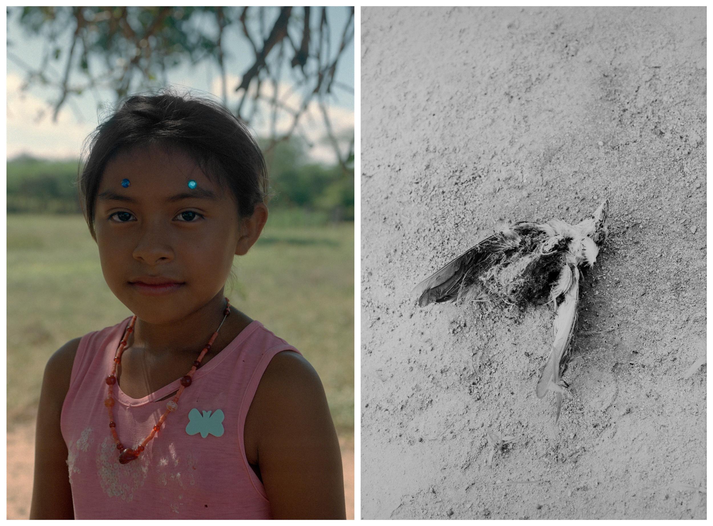 Left: Nina (7), a girl from Polumacho, displays the stickers she got for completing her colouring activities. Right: A dead bird at the door of a house in Pesuapa. For the Wayuu communities, women are authorities, artisans, carers, providers – and ultimately – water defenders. Many Wayuu women travel for hours to source water from wells or natural aquifers called jagüeyes.