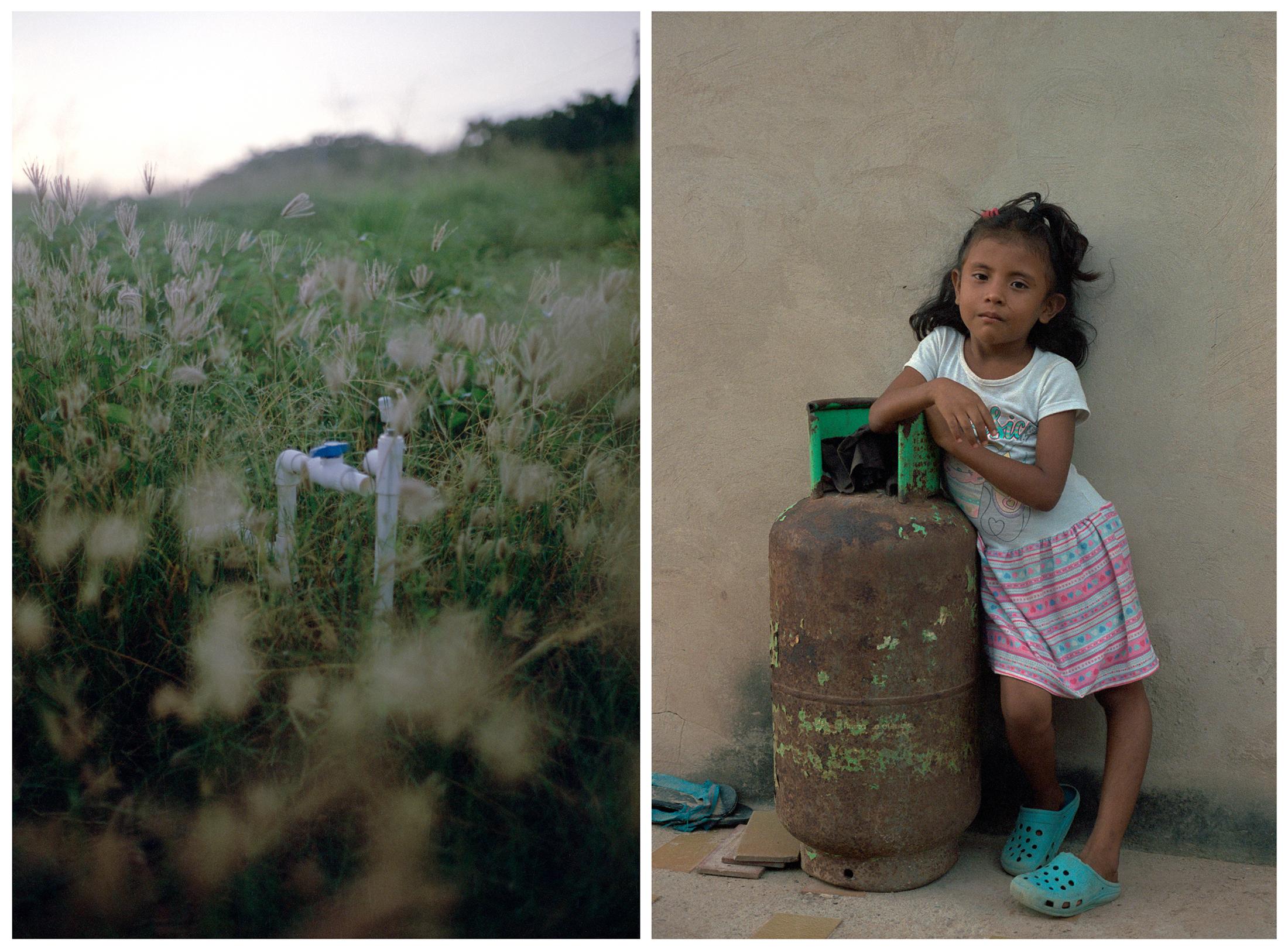 Left: A tap in the middle of a field in Pesuapa. Right: Sailé, a girl from Totopana, leaning on a gas cylinder that is often used by the households for cooking. Due to its access to water, Pesuapa is able to offer its residents a certain amount of resilience in the face of climate change. For communities without a reliable water source, collecting water will be undertaken mainly through the labour of women and girls.