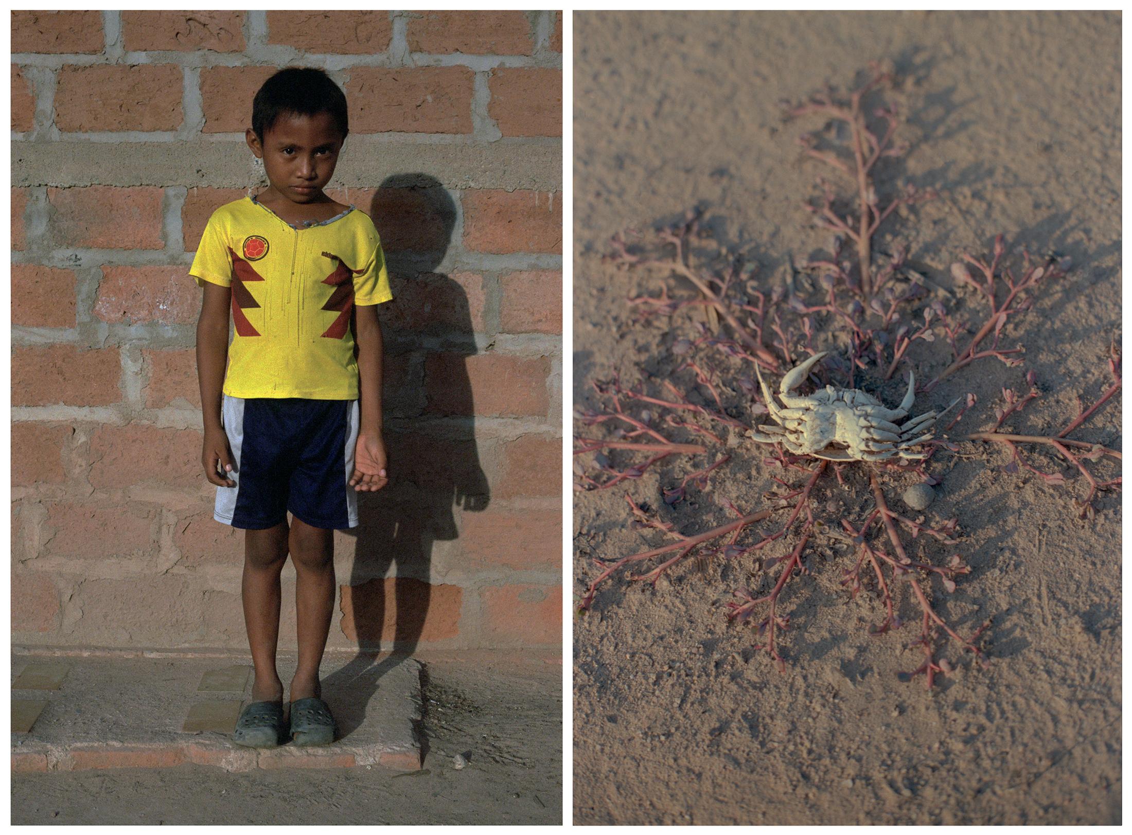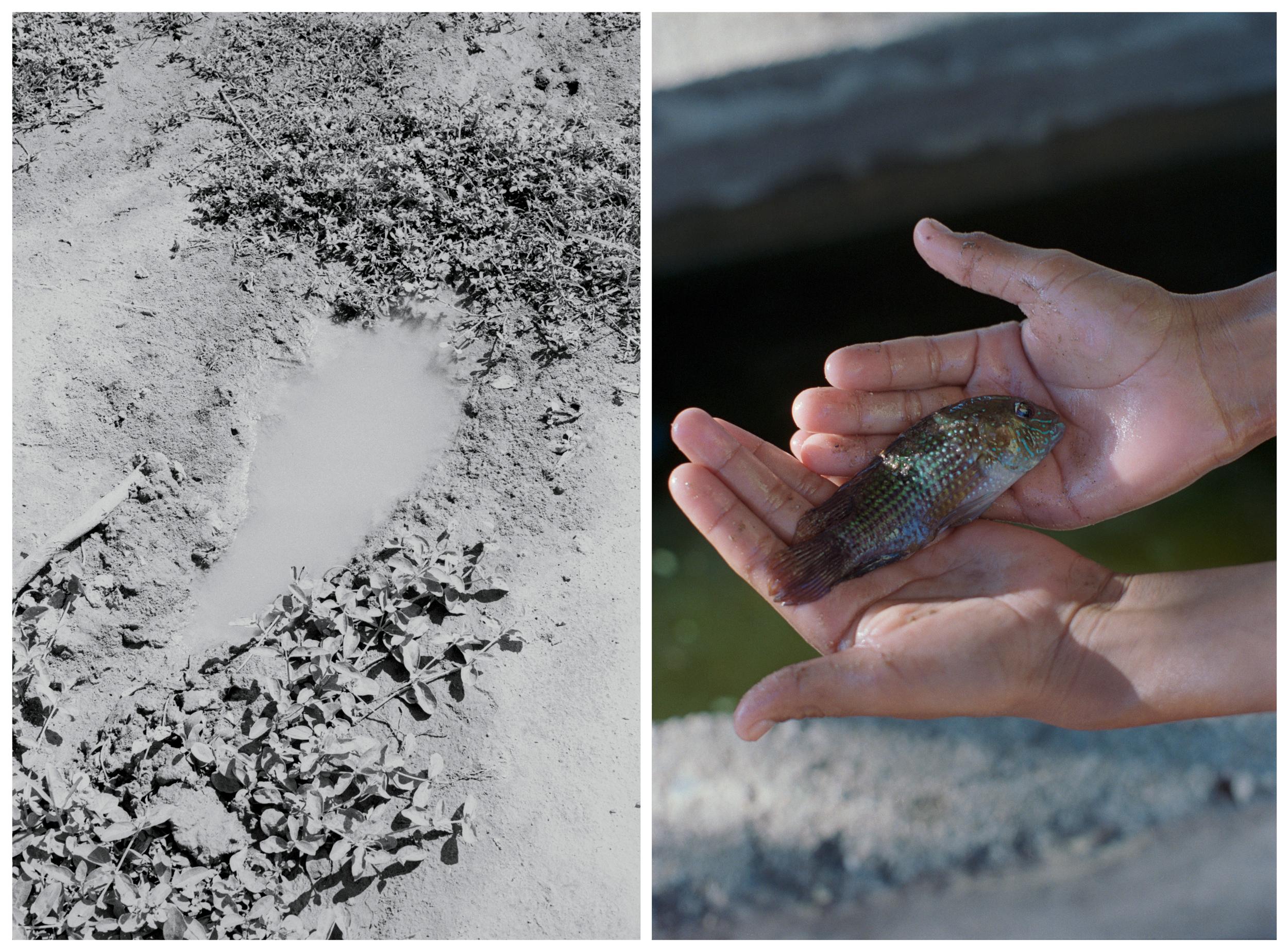 Left: A small puddle near the Pesuapa community. La Guajira, Colombia. Right: Fidel, a young boy from Pesuapa, holds his pet fish in his hands. The Wayuu community of Pesuapa comprises around 105 individuals, with many having returned from neighbouring Venezuela to escape the unfolding humanitarian crisis. A borehole provides water, but it is not of drinking quality, forcing people to buy water from clean sources or endure resulting disease.