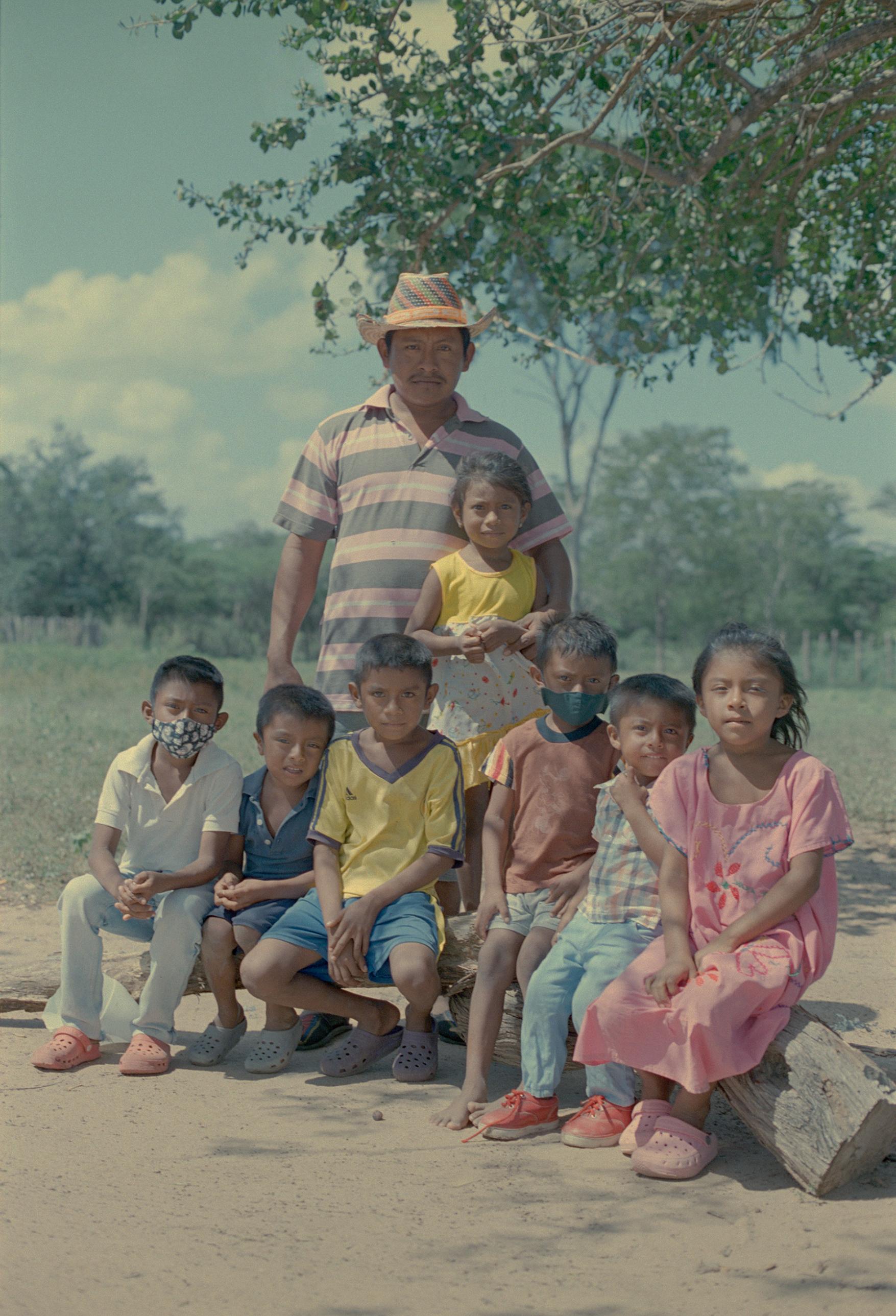 A group of Wayuu children in Polumacho with Emilio, the leader of the village, in November 2021. Emilio told us: ‘At the moment we don’t have enough water; what water we do have we can’t use for drinking. The times of drought have always been difficult. That happens in the months of January, February, from then for about three or four months. If the year goes by and it doesn’t rain, it is very difficult.’
