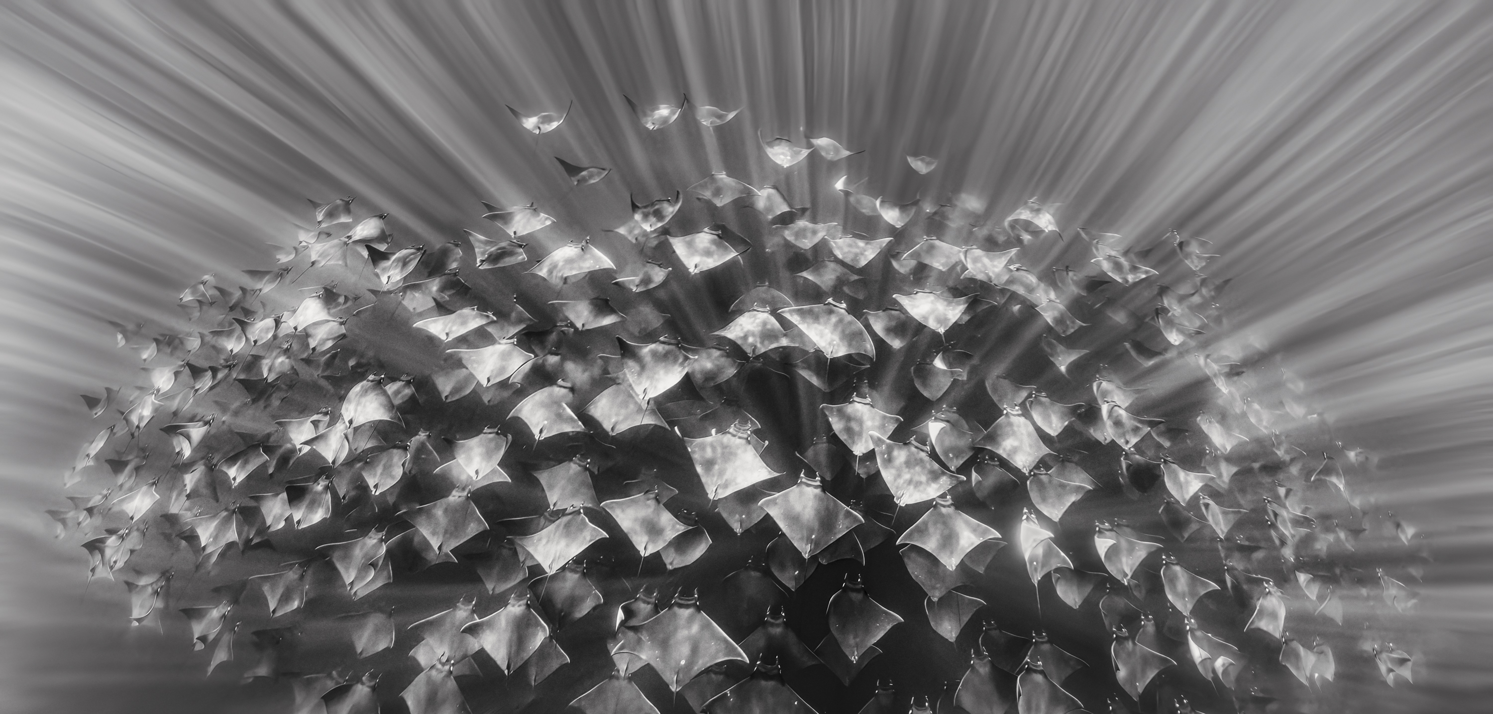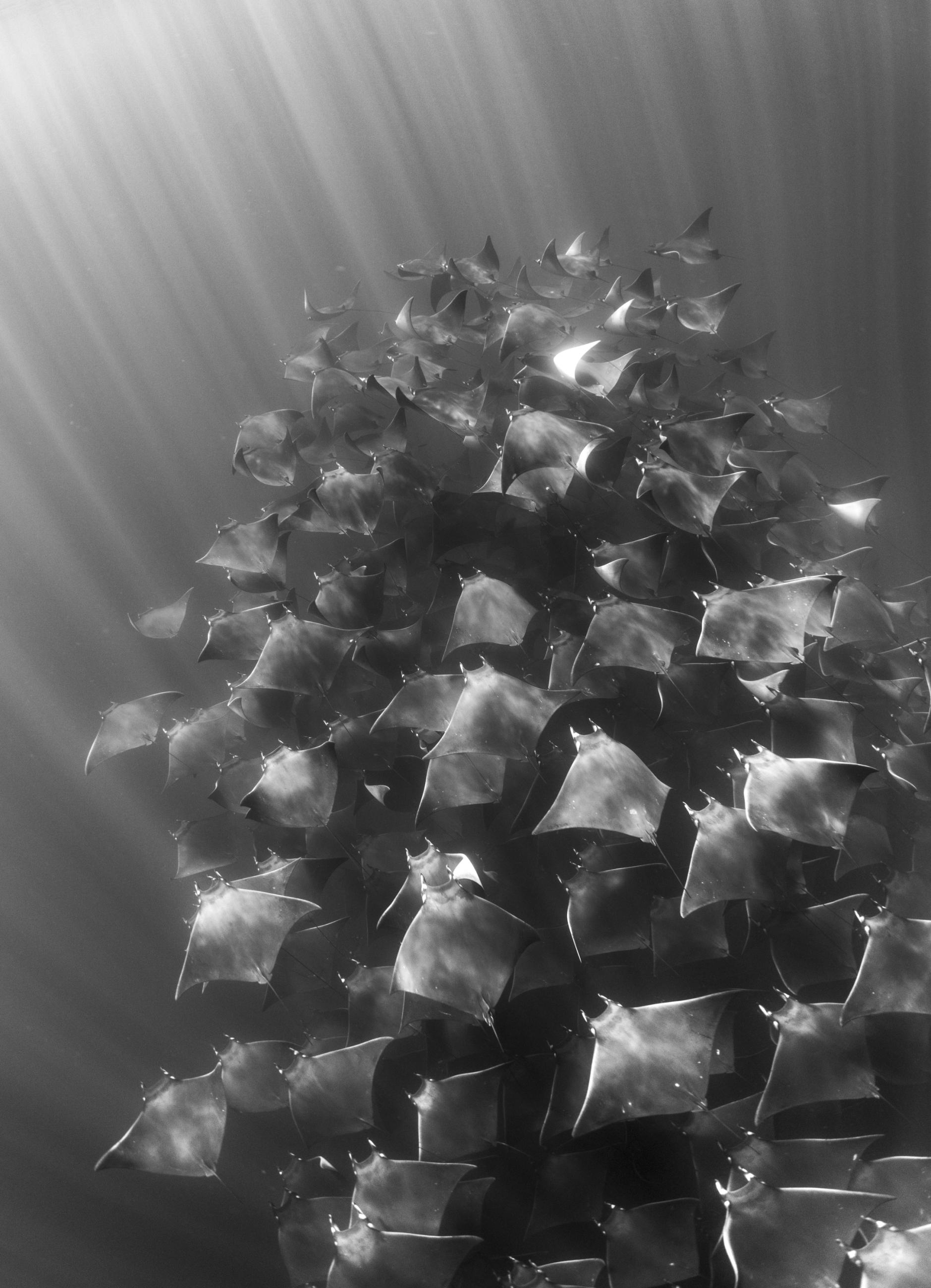 A series of photographs taken below, above and within the water during the annual mobula ray migration in Baja California. The ray fever creates intriguing dynamic patterns and textures underwater, in contrast to the individual jumps outside the water.