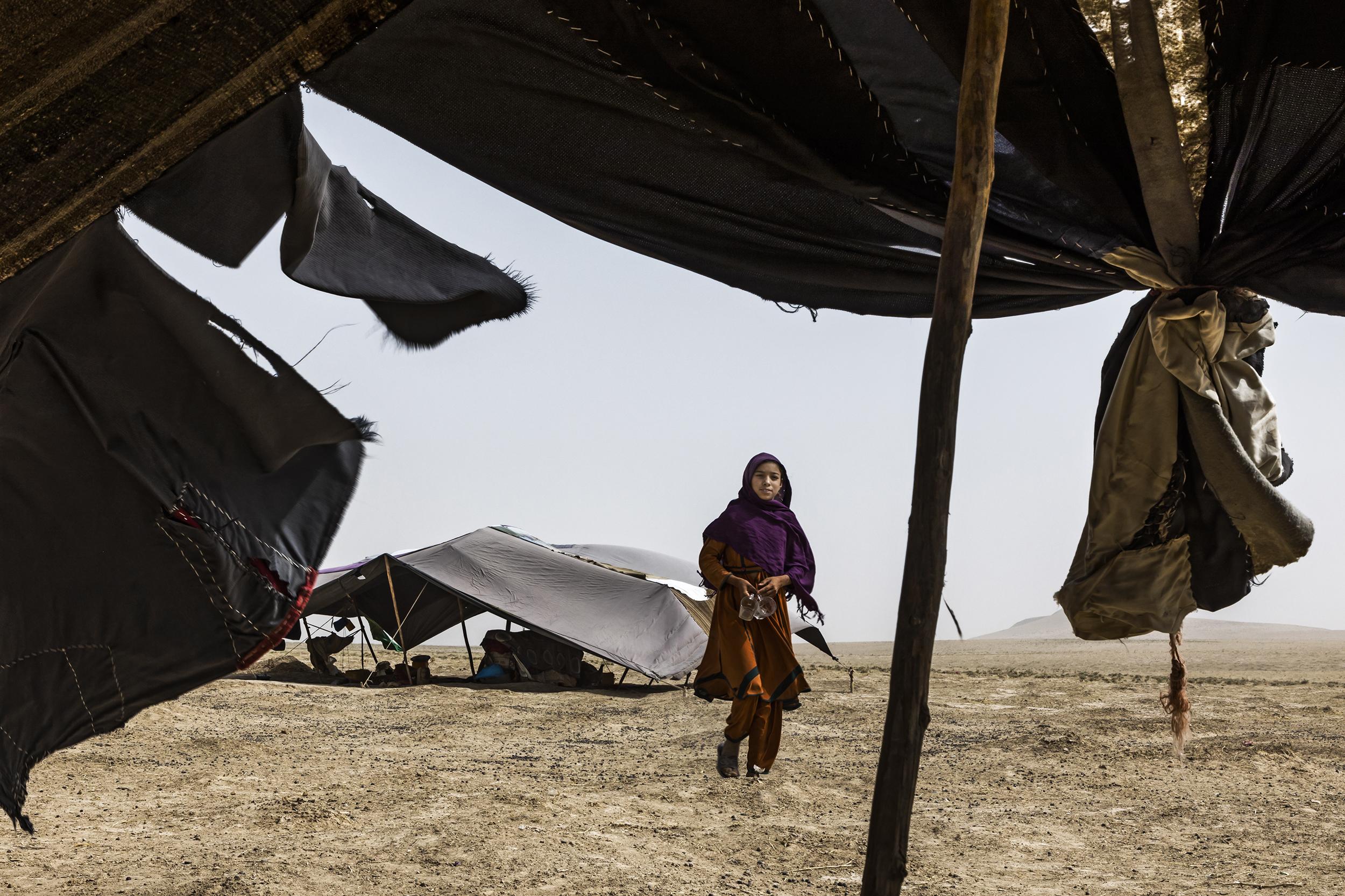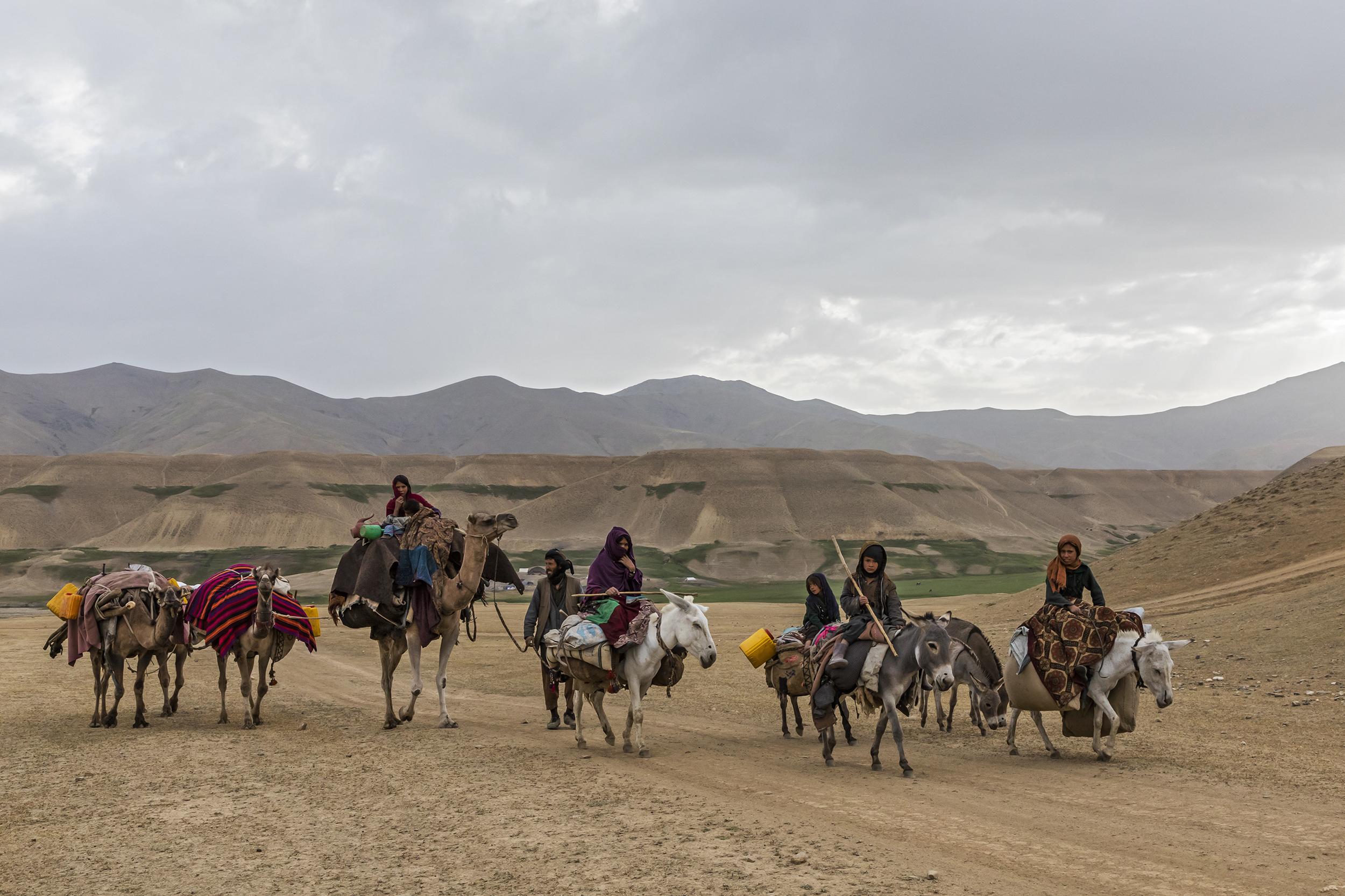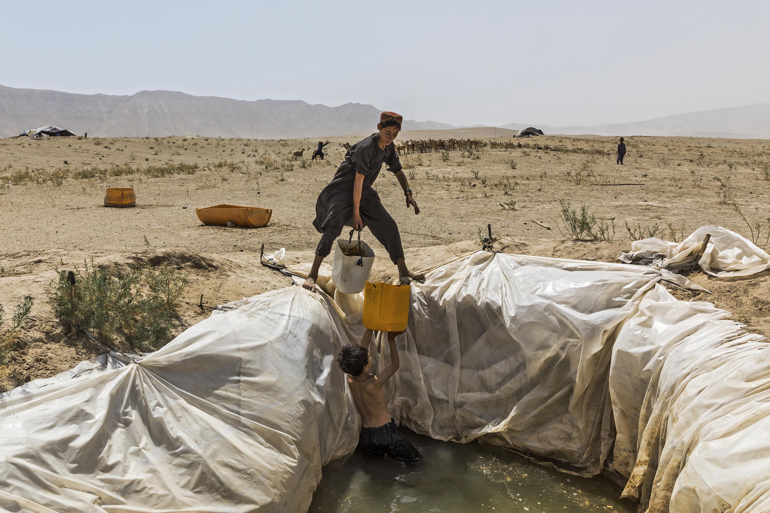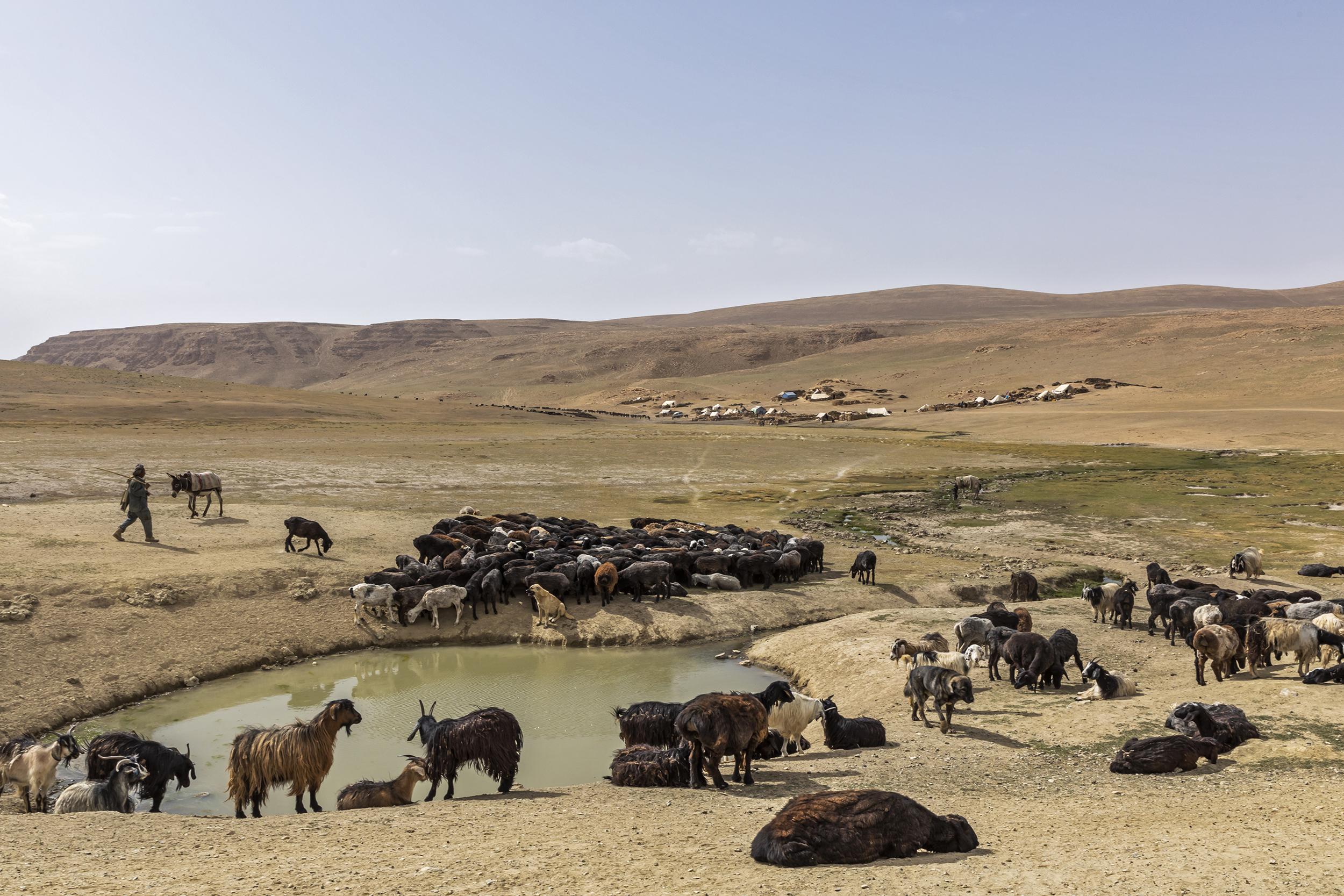 In recent years, drought has made it much harder and less predictable for the nomadic Kuchi herders of Afghanistan to make use of the available pastures. This has inflamed historic tensions with another nomadic group, the Hazara, and in some areas the Kuchi are now allowed only to bring their herds, but not their tents. Such are the pressures that families have been forced to sell their camels and their flocks have reduced significantly in number, while groups that used to spend entire summers in the mountains are now leaving earlier than usual due to the exhaustion of the pastures. Because of this, many herders have to buy forage to feed their flocks, as well as water for their families – those who can afford it buy it from water tankers and create small ponds in which to store it.