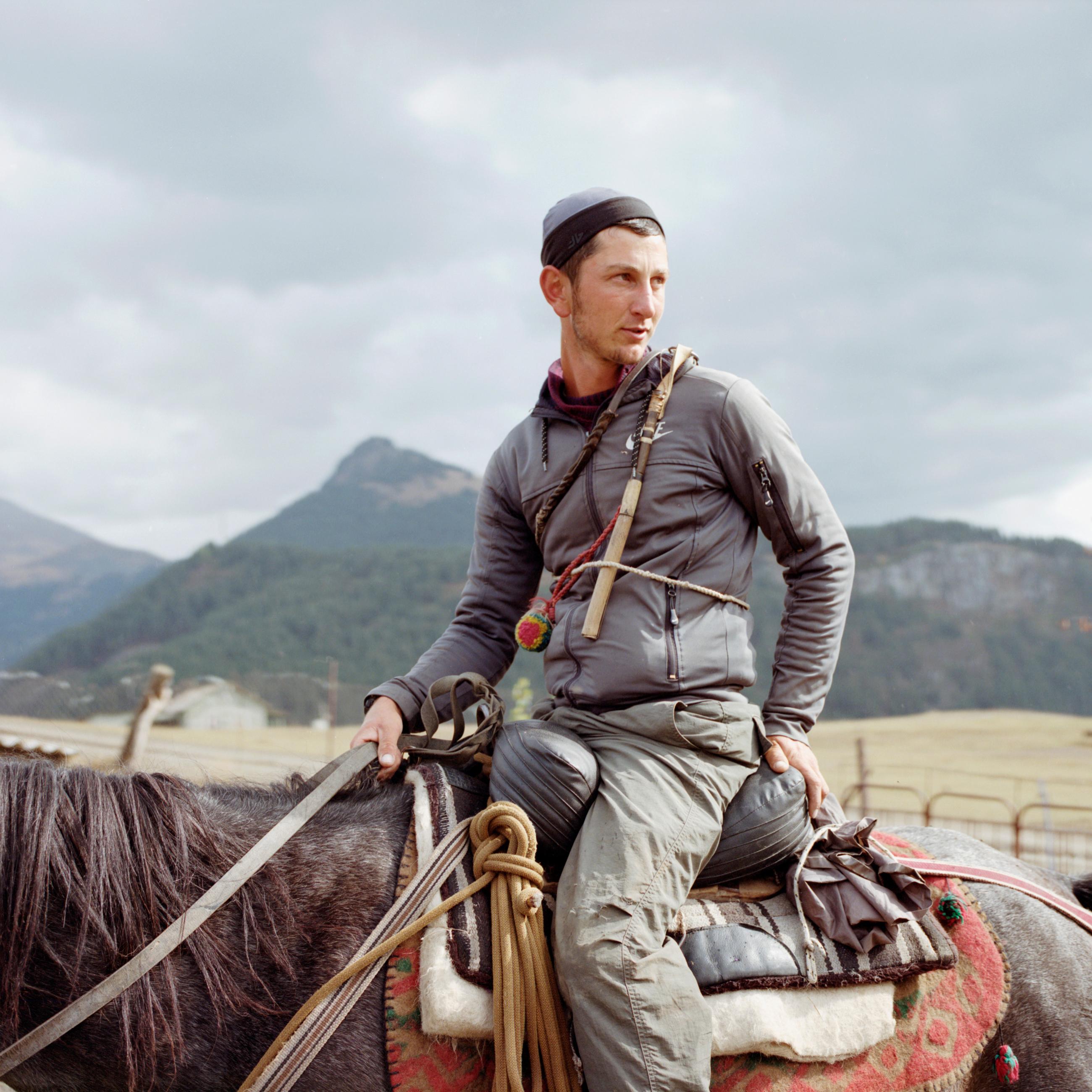 I met Robi and his friends in the village of Omalo, preparing horses for riding. It was a fascinating and detailed process, as colourful, patterned fabrics adorned the horse's back. After Robi got on his horse and got ready to ride, I saw this composition against the beautiful background of the Caucasus mountains and realised that this image merges into something whole and indivisible.
