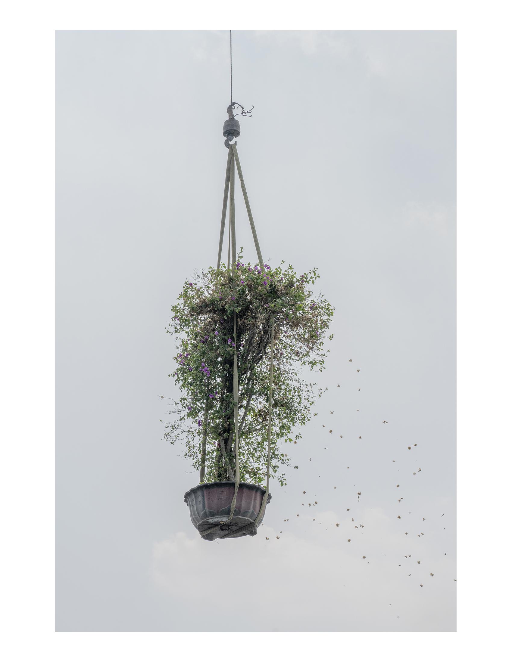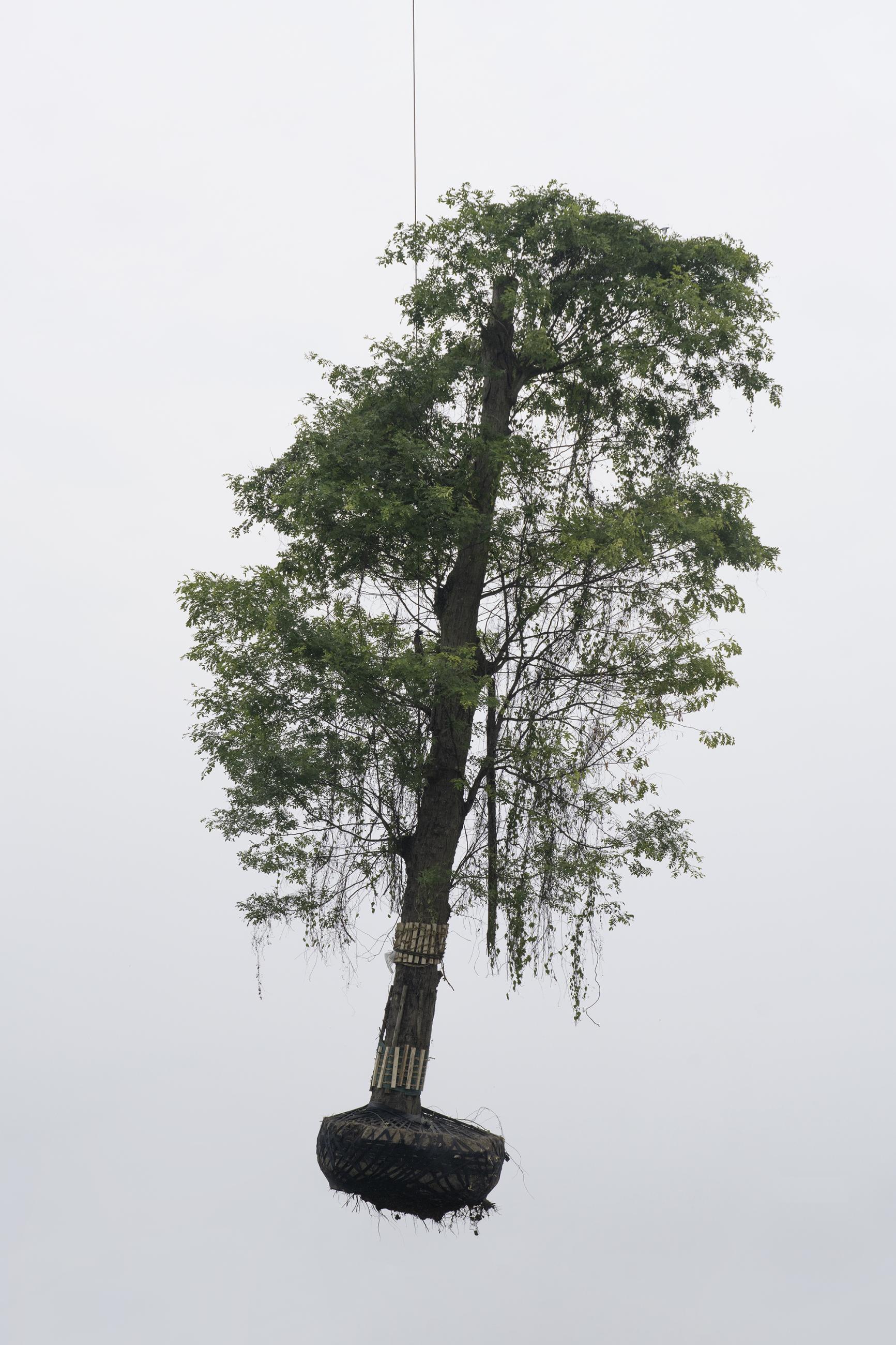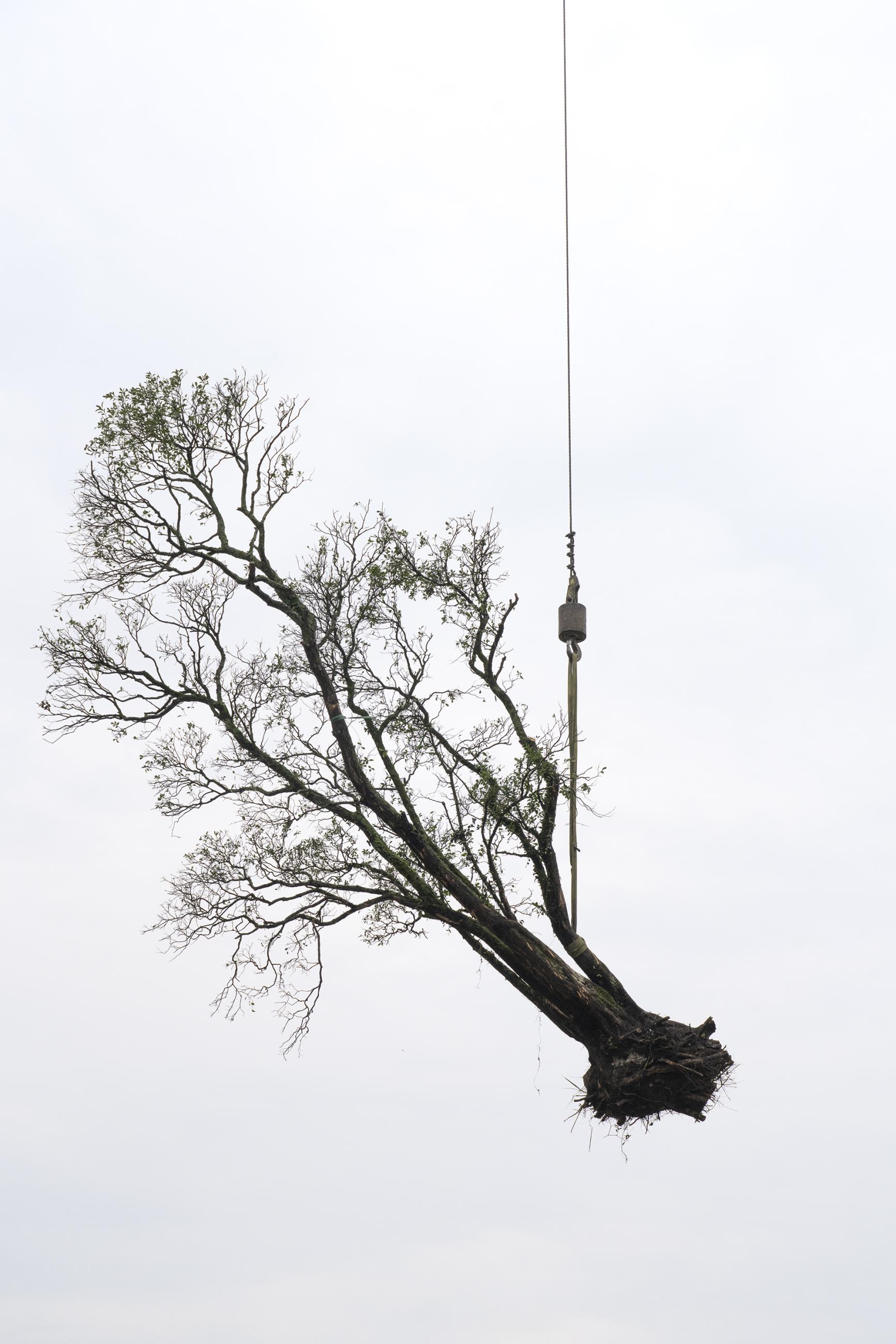 Landscape gardening is a practice dating back to ancient times; Nebuchadnezzar II of the Babylonian Empire built a garden complex in the sky for his homesick princess consort, which was known as the Hanging Gardens of Babylon. The Sky Garden series takes its name from this history. Three years ago I settled down in Wenjiang, and there is a tree nursery within walking distance of my home. Exotic trees and rocks from all over the world can be seen there, including Japanese black pines and maple trees. There are workers lifting these trees and rocks with mobile cranes every day, transporting them and planting them in newly built parks, neighbourhoods or streets in the city. I walk through the woods and take photographs when the trees and rocks are being lifted into the air. Together, these images create The Sky Garden series.