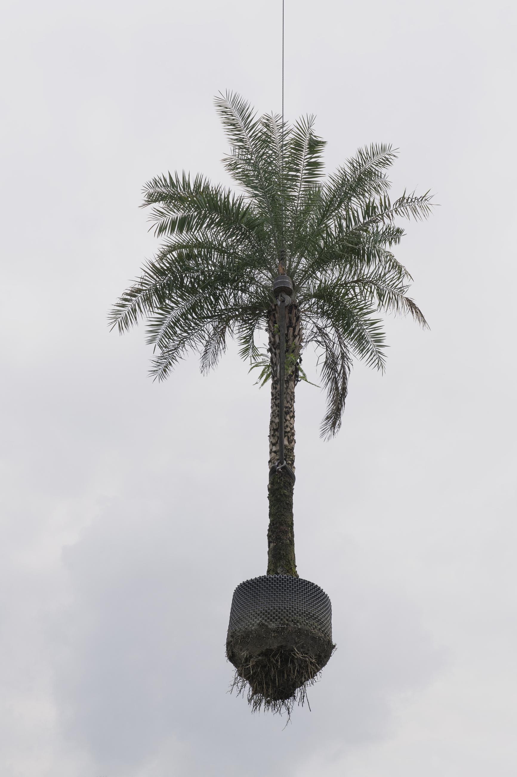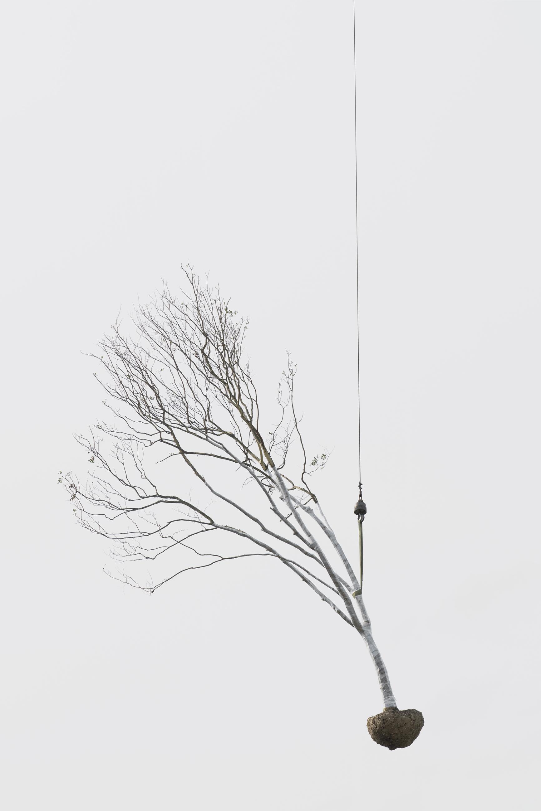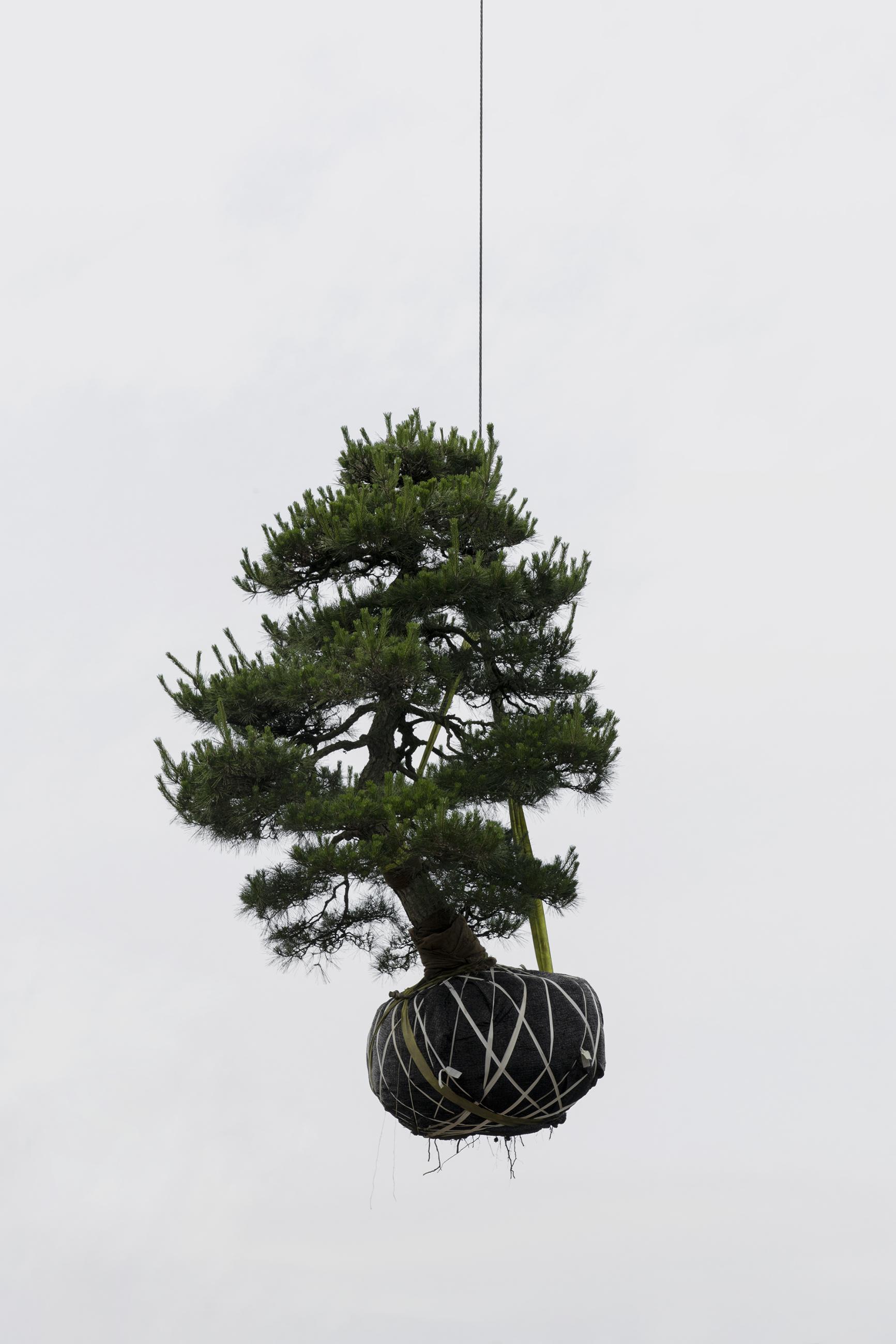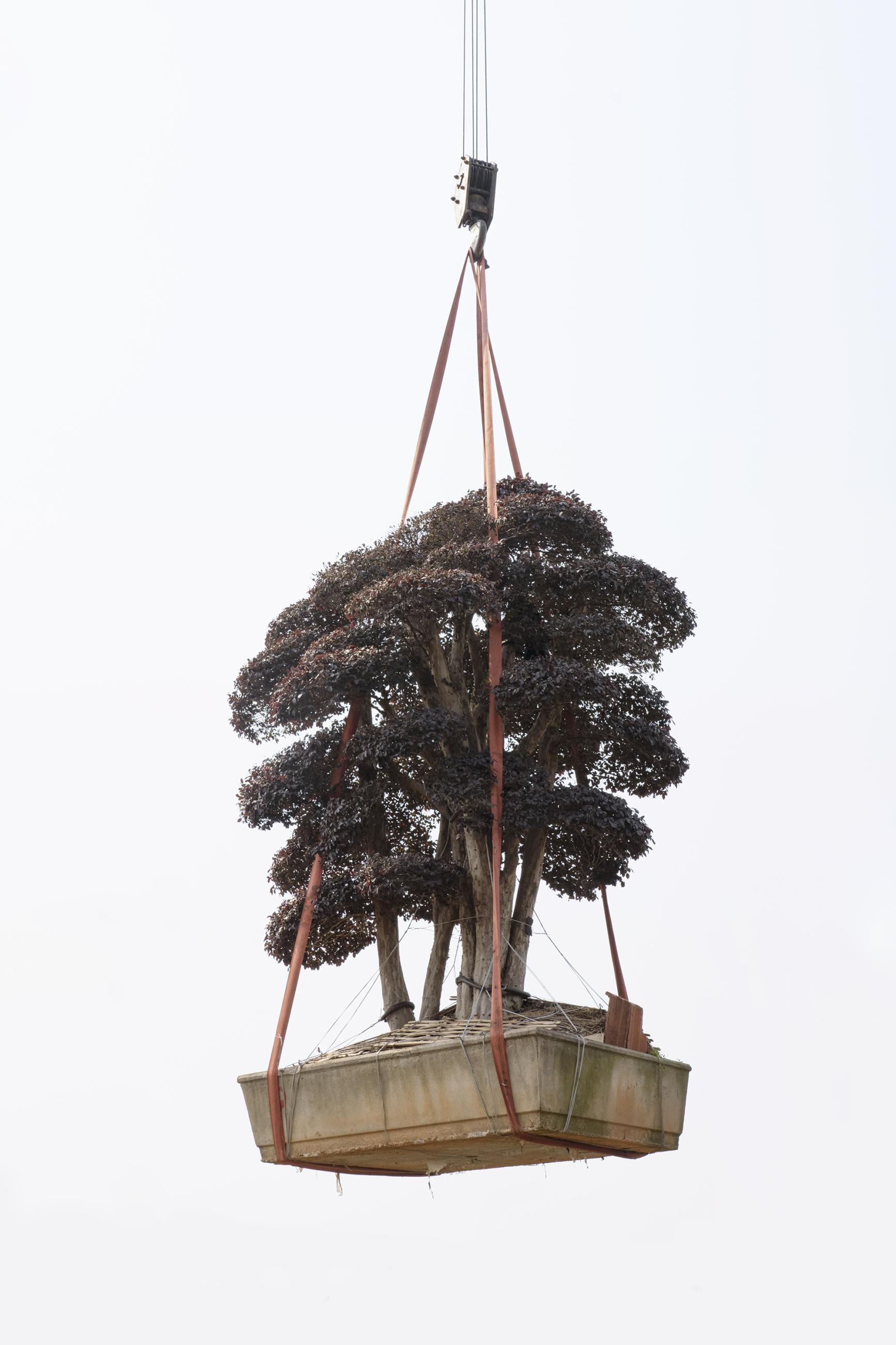 Landscape gardening is a practice dating back to ancient times; Nebuchadnezzar II of the Babylonian Empire built a garden complex in the sky for his homesick princess consort, which was known as the Hanging Gardens of Babylon. The Sky Garden series takes its name from this history. Three years ago I settled down in Wenjiang, and there is a tree nursery within walking distance of my home. Exotic trees and rocks from all over the world can be seen there, including Japanese black pines and maple trees. There are workers lifting these trees and rocks with mobile cranes every day, transporting them and planting them in newly built parks, neighbourhoods or streets in the city. I walk through the woods and take photographs when the trees and rocks are being lifted into the air. Together, these images create The Sky Garden series.