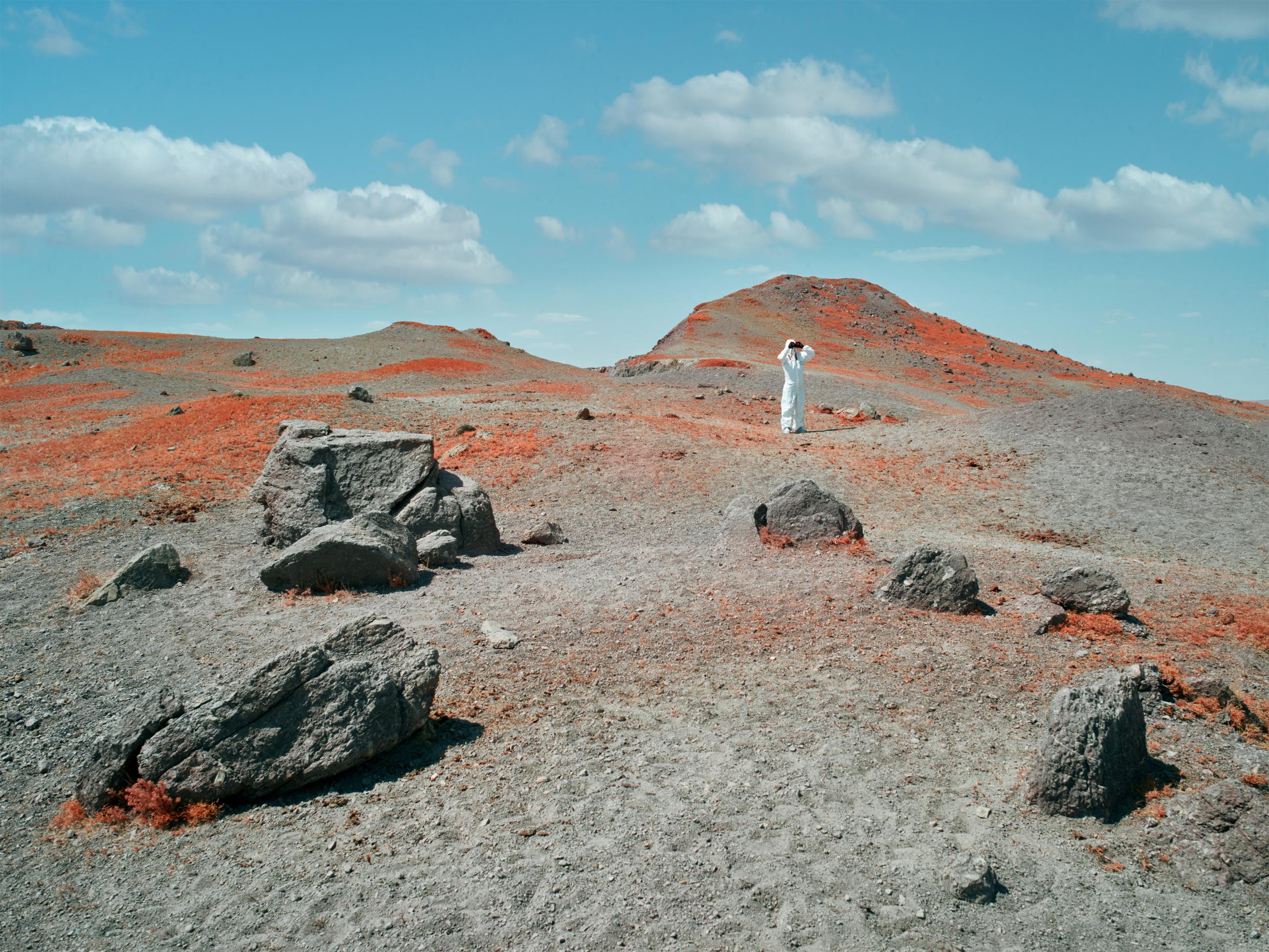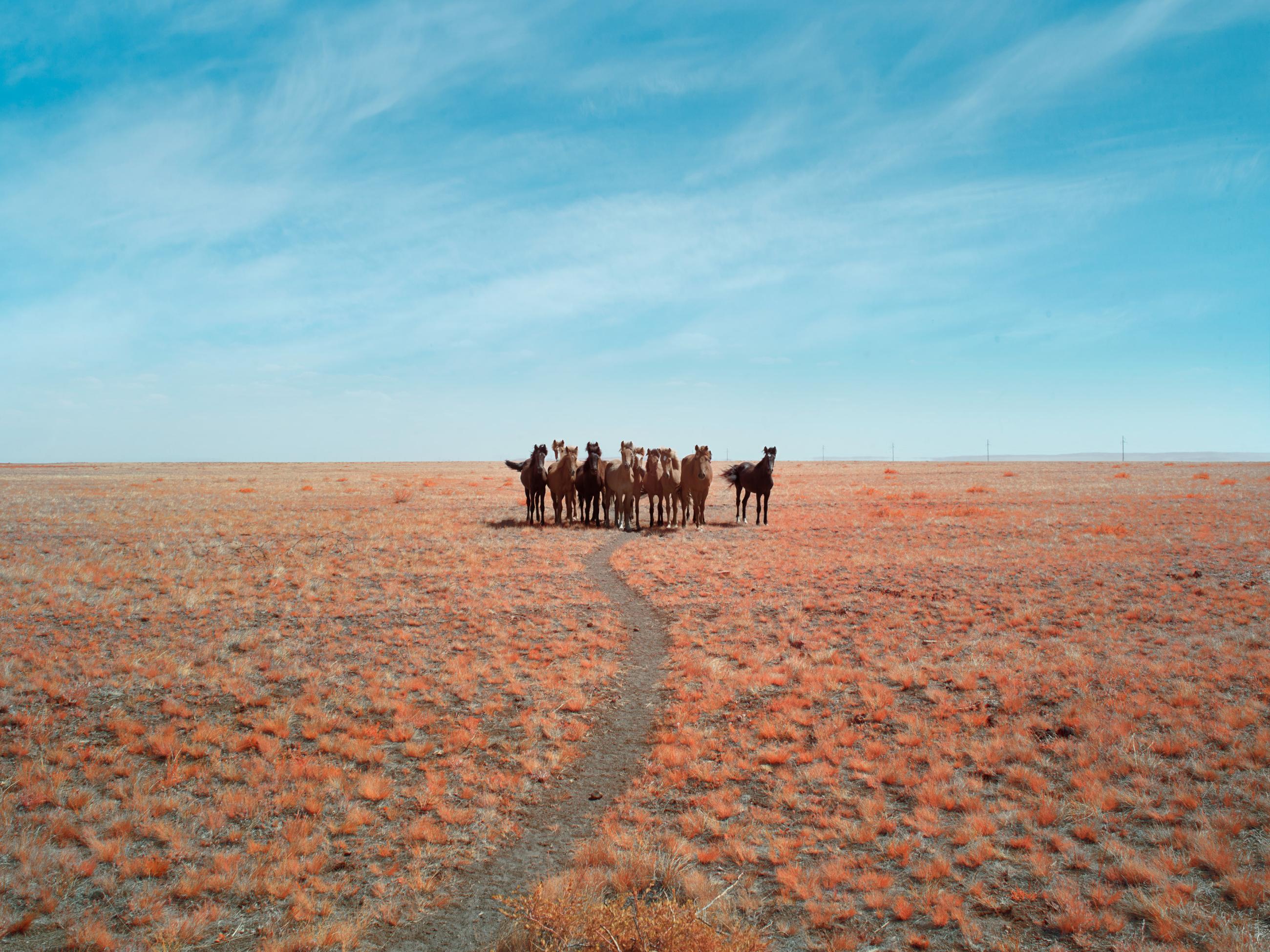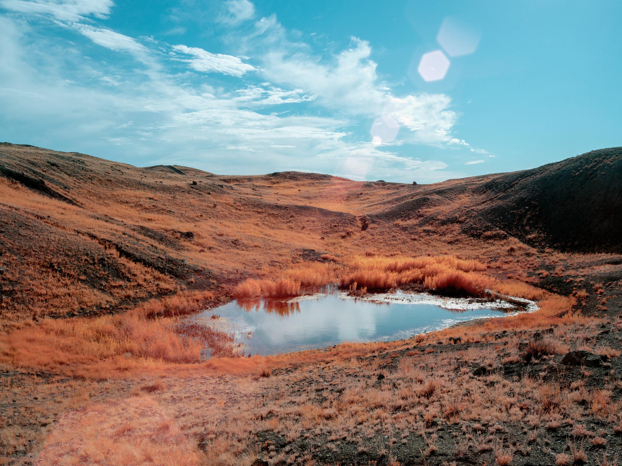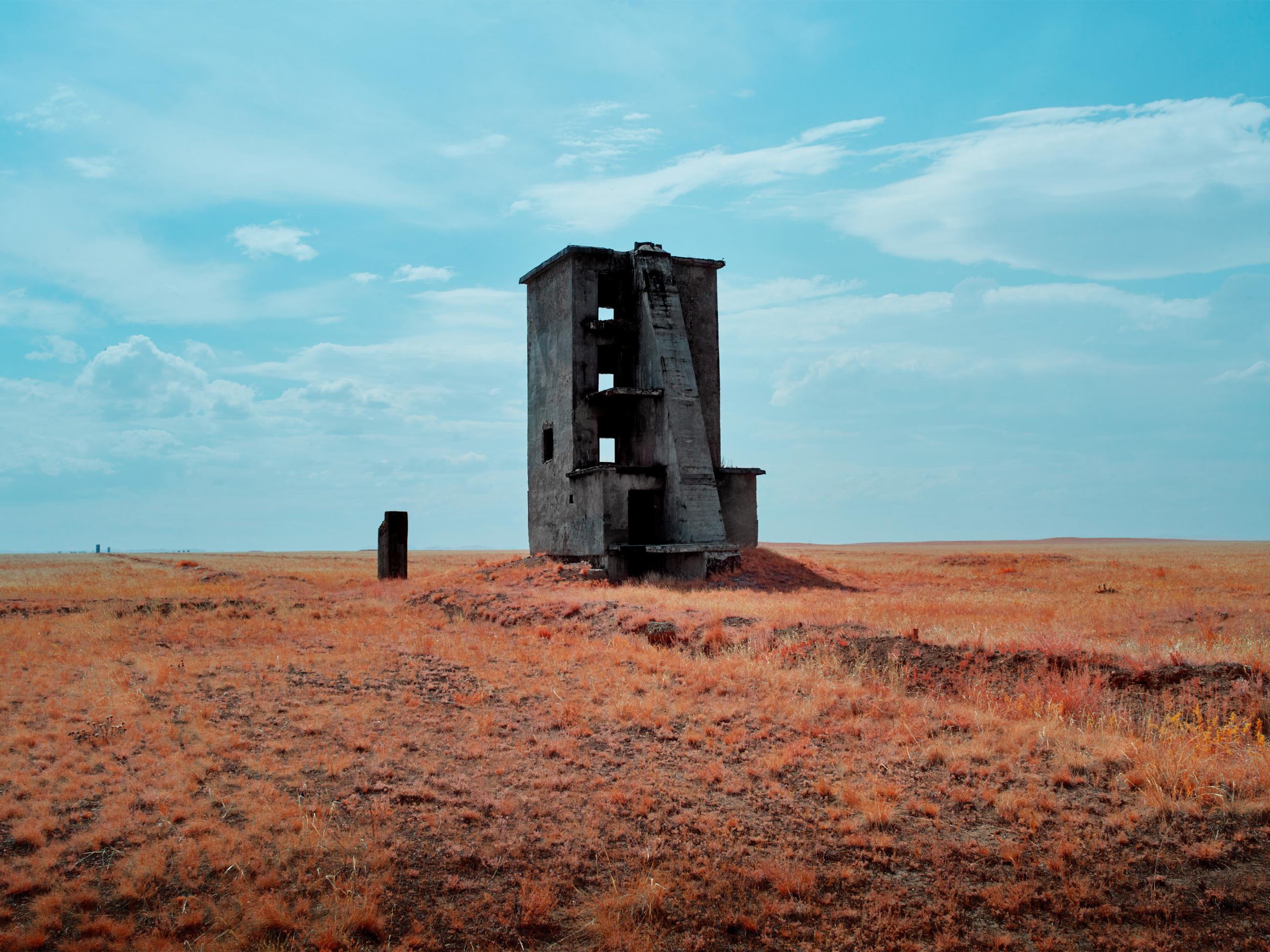 This series explores a remote area of Kazakhstan known as ‘The Polygon’, which was once home to the Soviet Union’s major nuclear testing facilities. Between 1949 and 1989 more than 450 nuclear tests took place here, with little regard for their effect on the local people and environment. The full impact of radiation exposure was hidden for many years by the Soviet authorities and only became clear after the test site was closed in the early 1990s. The location is still heavily contaminated and can only be accessed in protective clothing. The images in this series were made using an infrared camera, which hints at a menace that is equally invisible to the human eye: the radiation resulting from the nuclear explosions. Local scientists employ infrared technology to assess the current conditions of contaminated sites. Green vegetation, reflects a significant amount of infrared light, allowing for a nuanced analysis of environmental health. The varying shades of reflection yield valuable insights into the overall toxicity of this irradiated landscape. Notably, foliage emerges as the primary concern in these locations due to its absorption of radiative particles from deeper layers of soil, making it a focal point for potential environmental hazards.