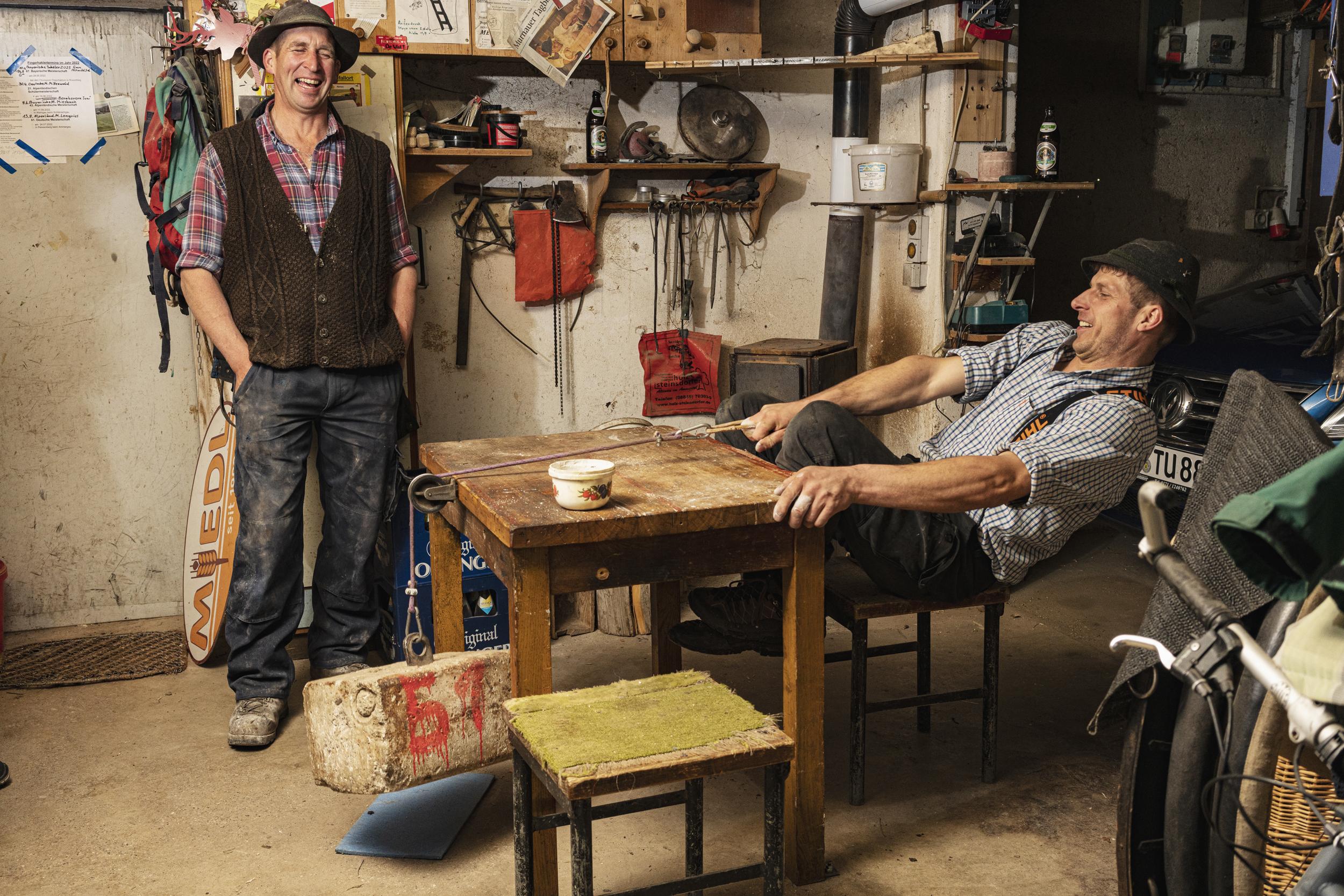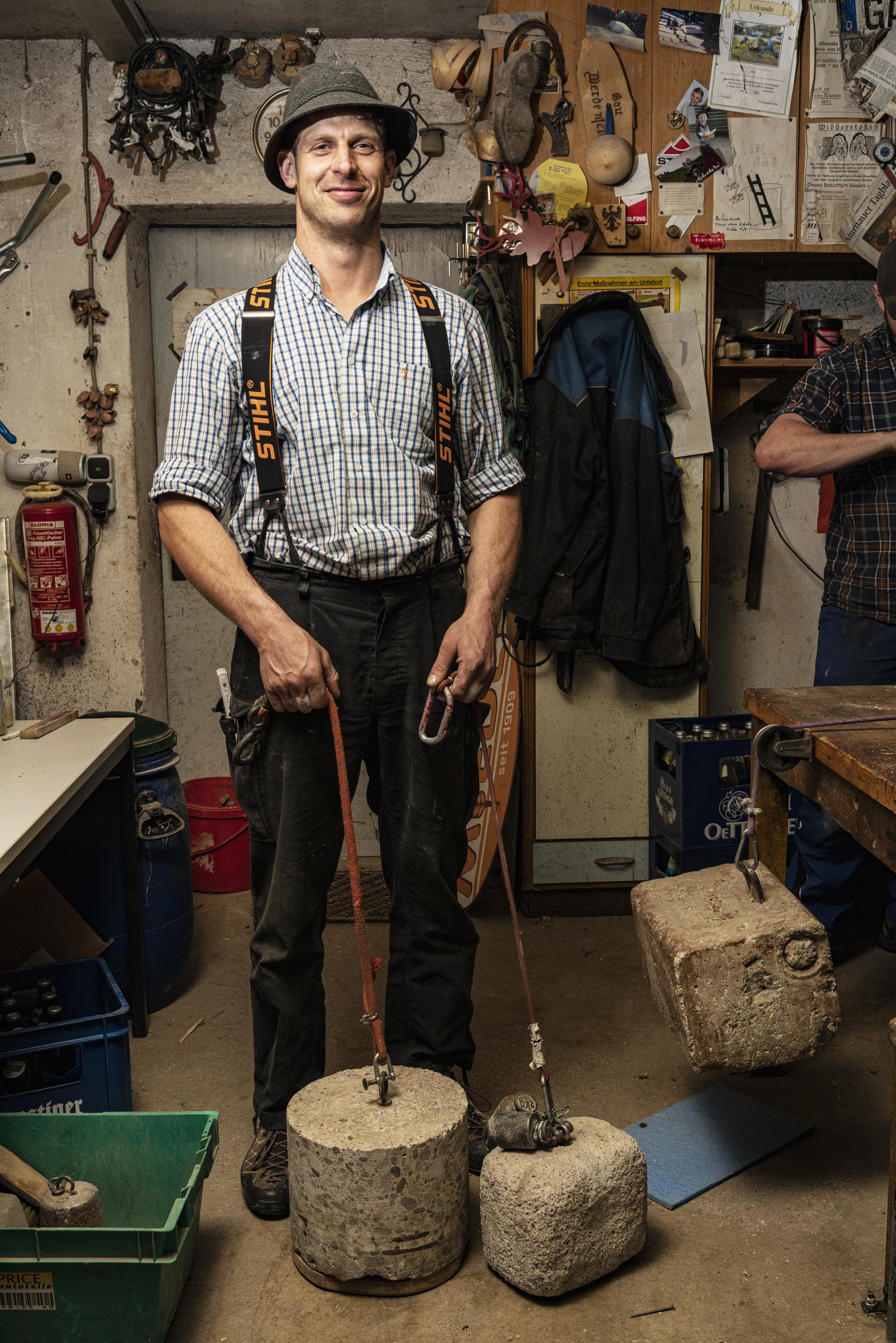 Light-heavyweight champion Josef Utzschneider, from Ohlstadt, Bavaria, Germany, trains in a garage with a 51kg concrete weight.