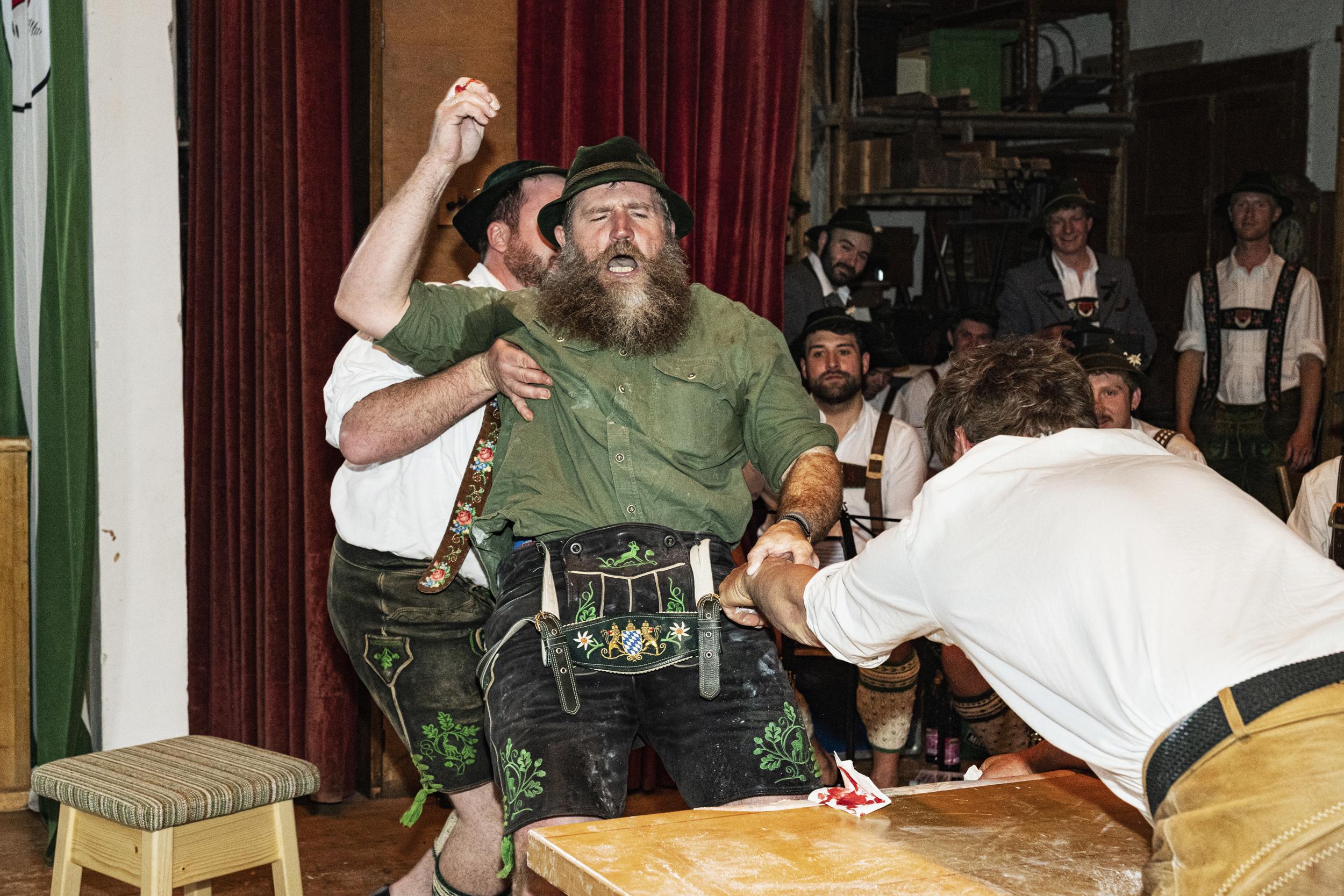 The loser of a duel at the German finger wrestling championship in Bavaria, Germany.