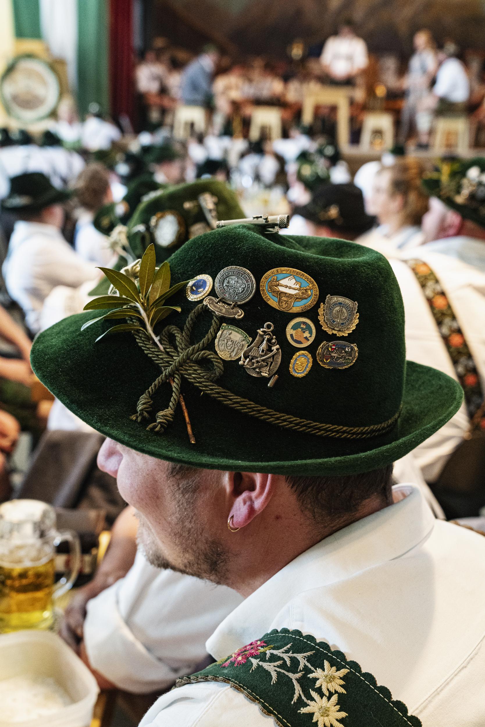 A spectator’s traditional hat with pins. German finger wrestling championship, Bavaria, Germany.