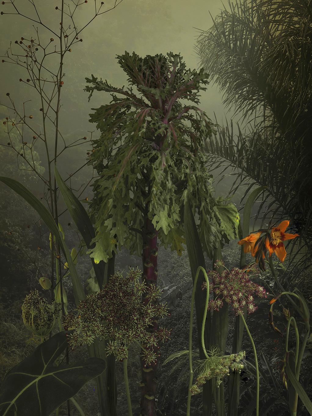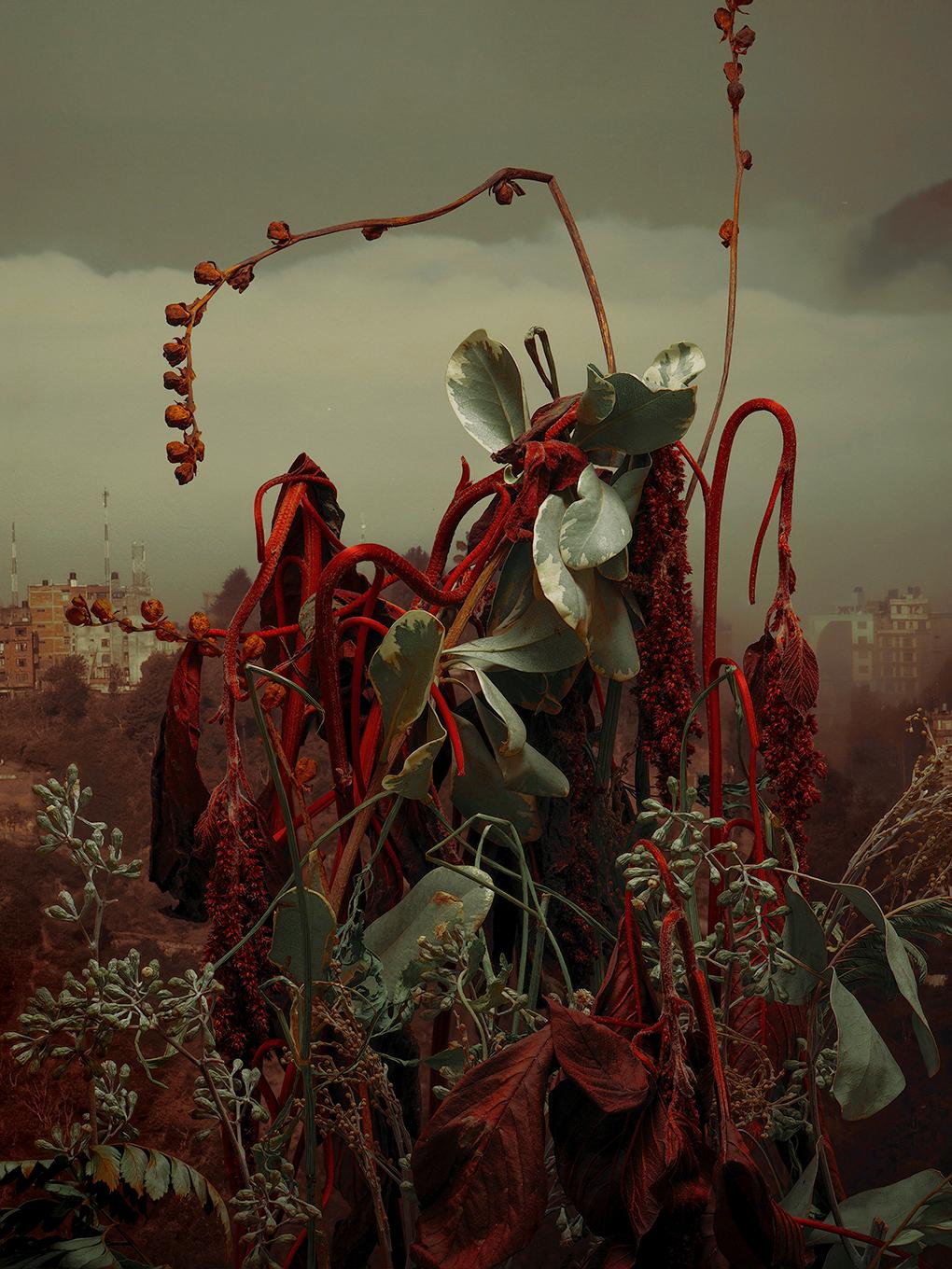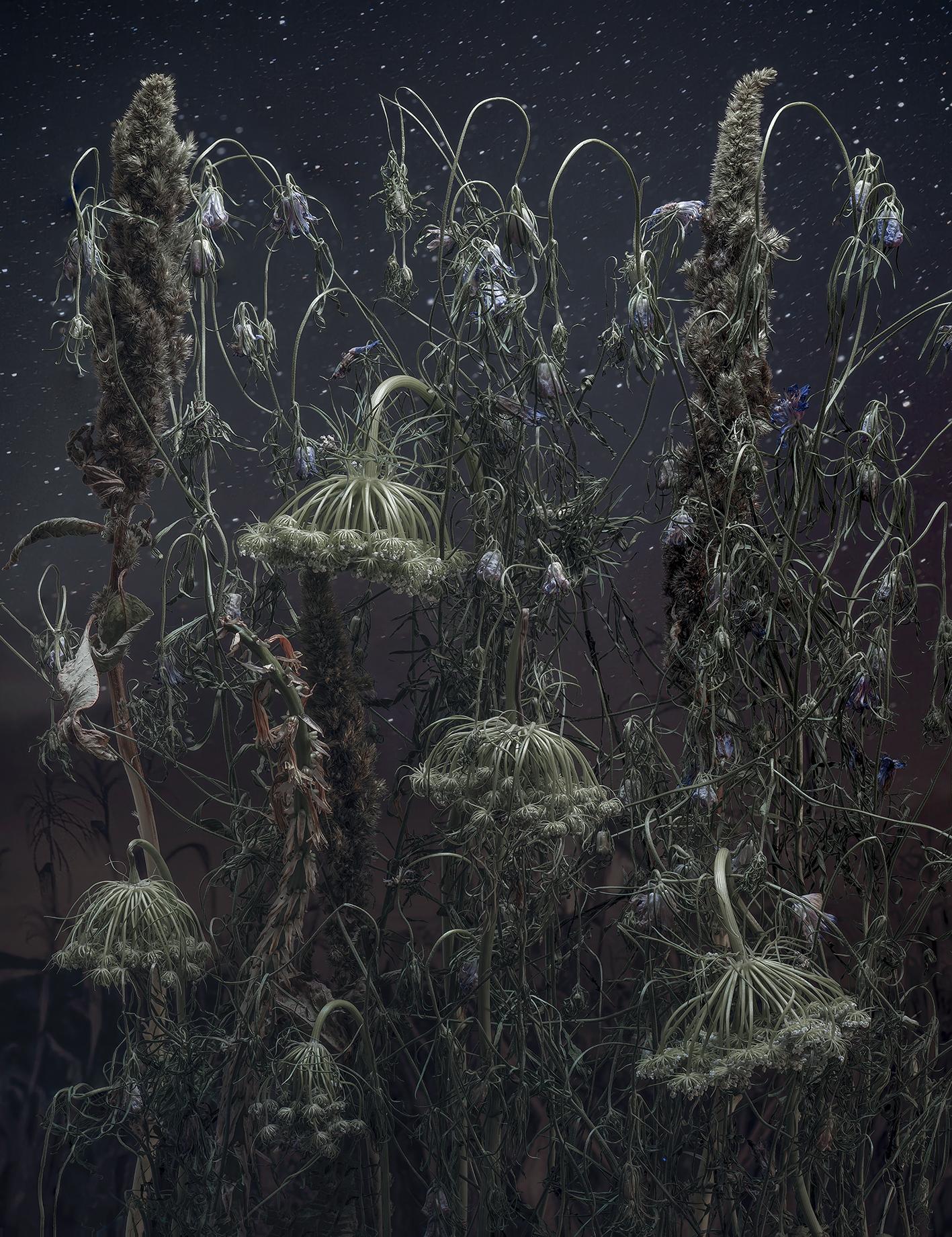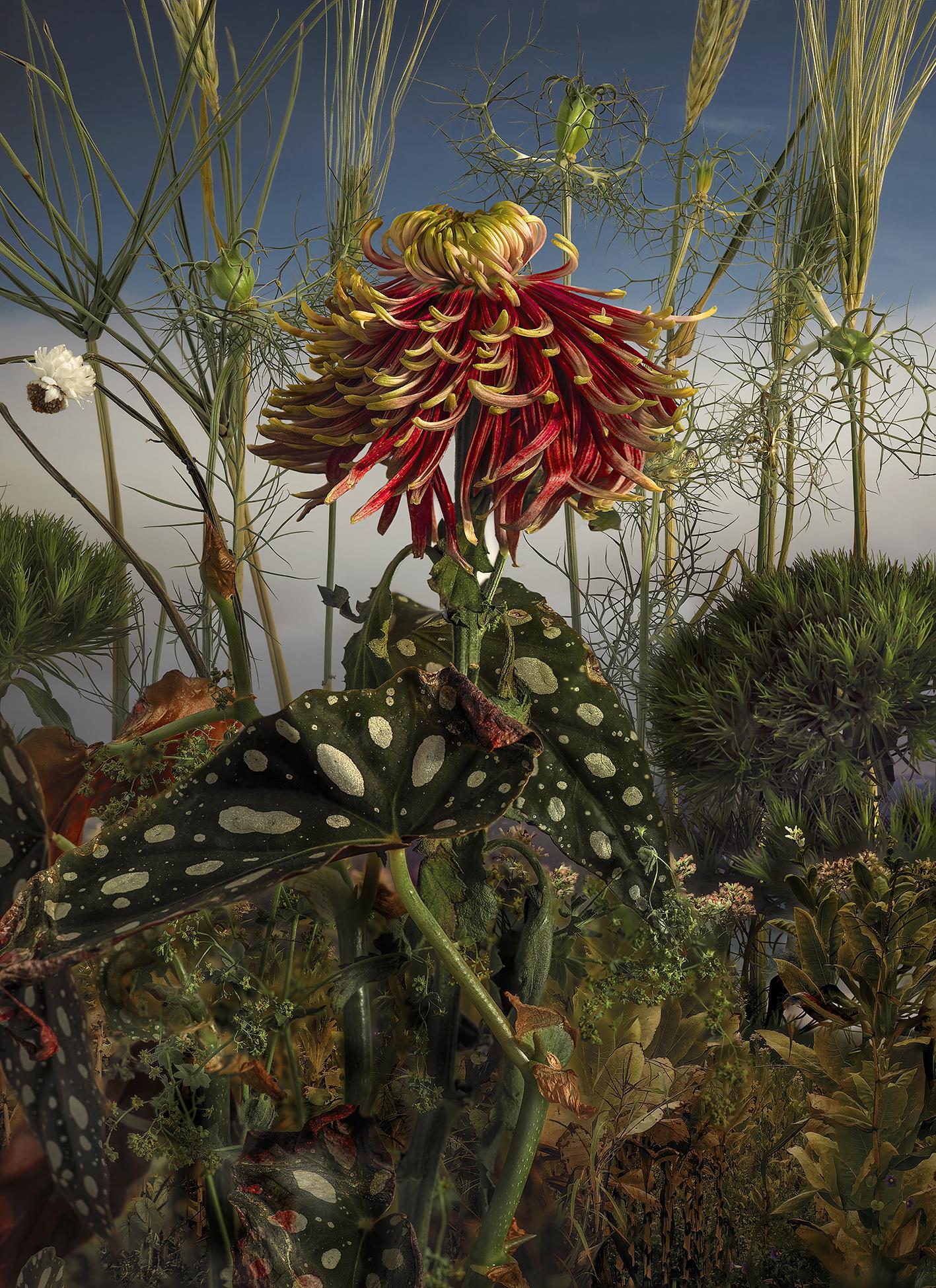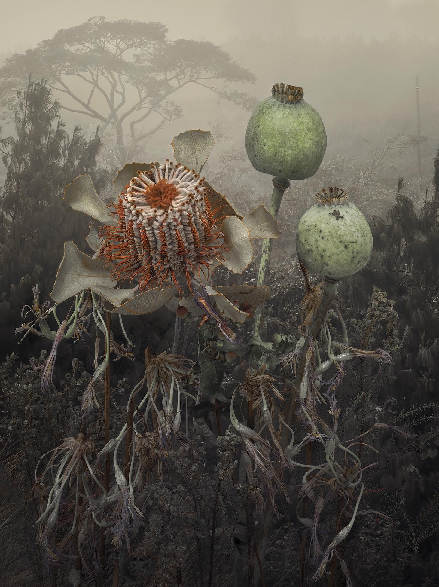 Born and bred in industrial scale greenhouses, cut flowers have no contact with nature and generate high CO2 emissions. The Western world’s supply of cut flowers used to be derived from local greenhouses, but most of the flowers we buy in our stores today have been transported by planes or lorries from digitally run greenhouses around the world; Colombia, Ecuador and equatorial East Africa are currently the largest producers of cut flowers on the planet. The greenhouses contribute to high water use and chemical runoff, while the flowers can generate significant carbon emissions through their refrigeration and long-haul transportation – stems may be transported up to 9,600 km (6,000 miles) in refrigerated aeroplane holds. These cut flowers were bought at a local flower shop and photographed in front of prints of landscapes in my studio.