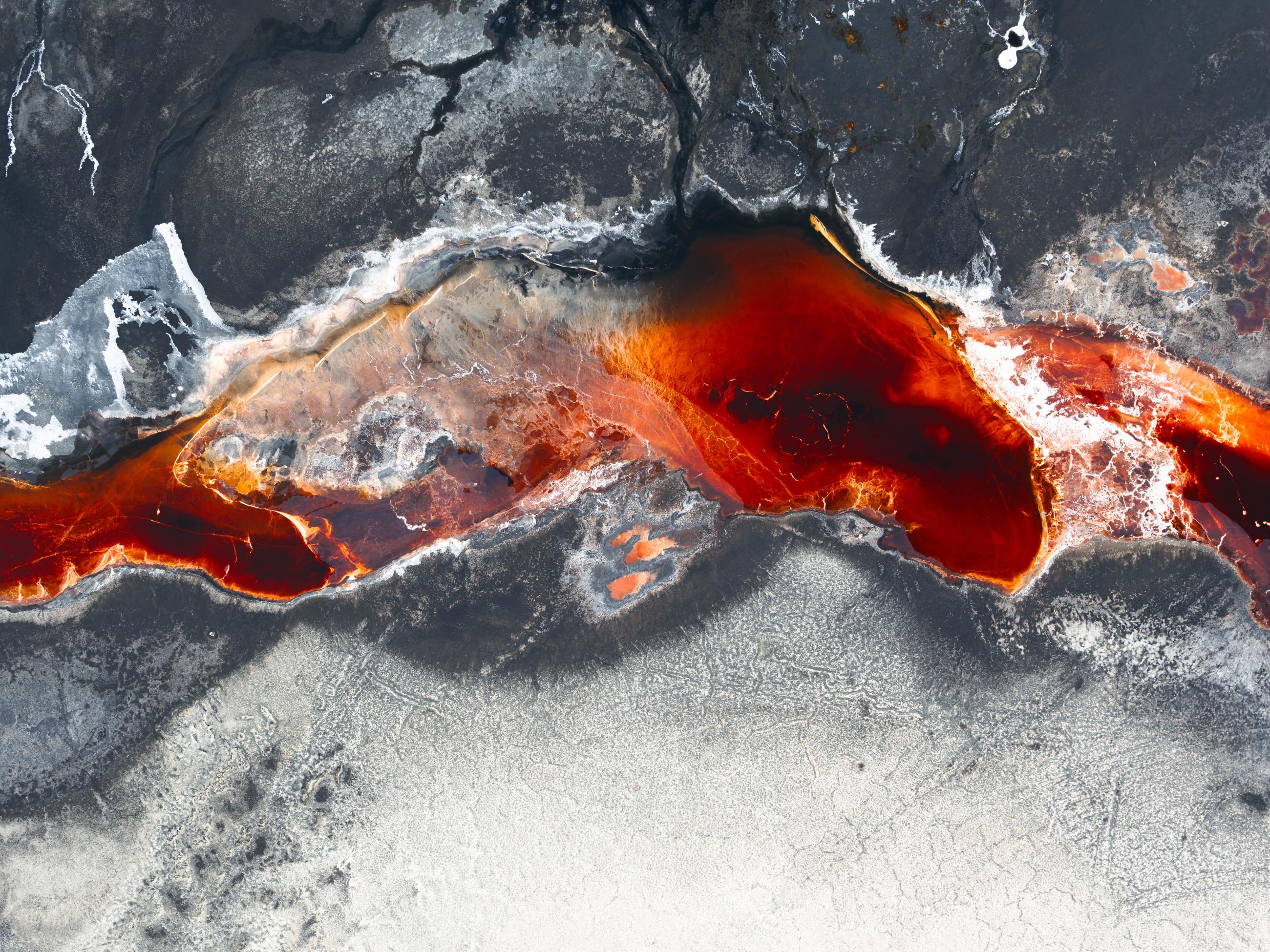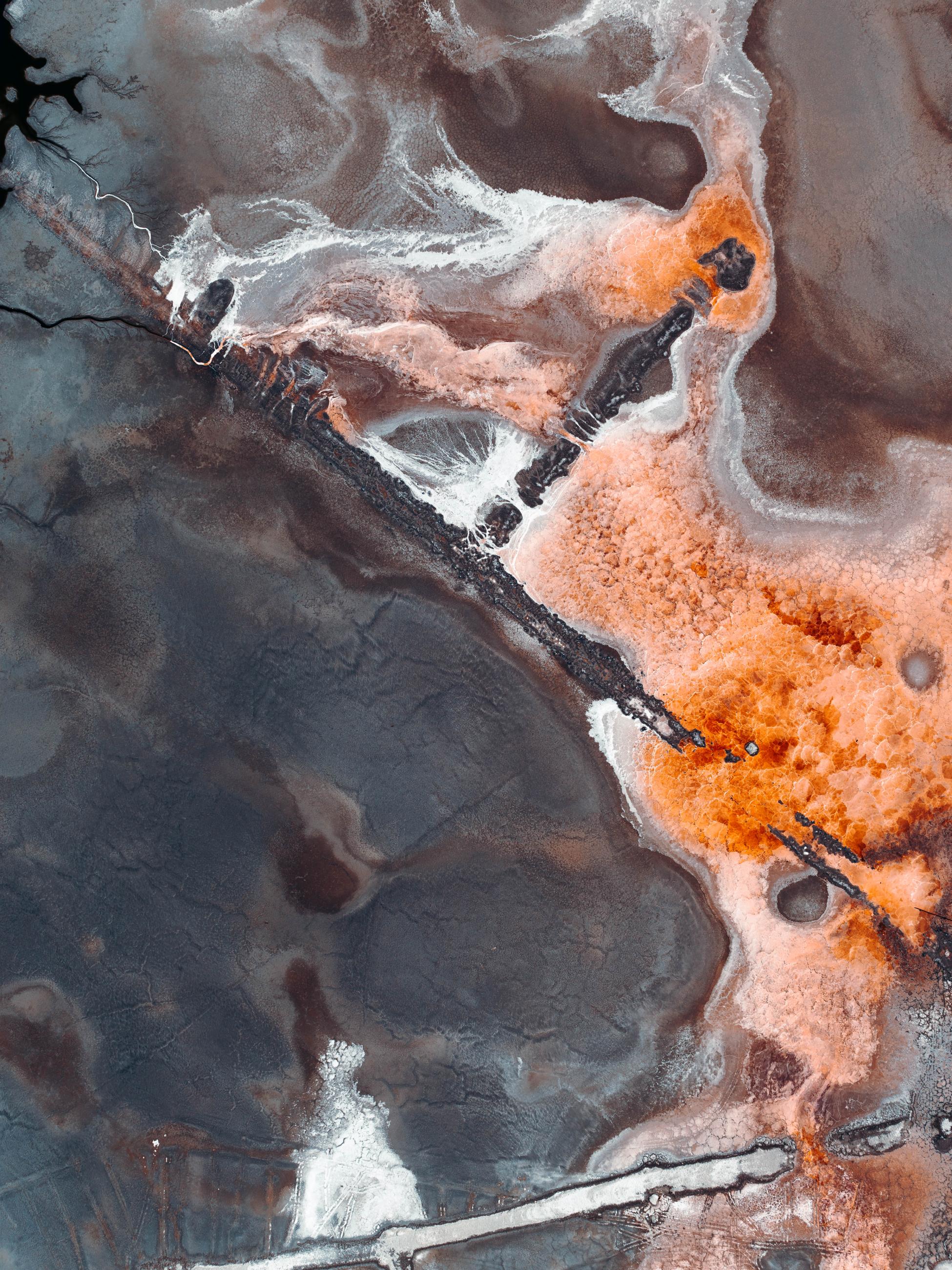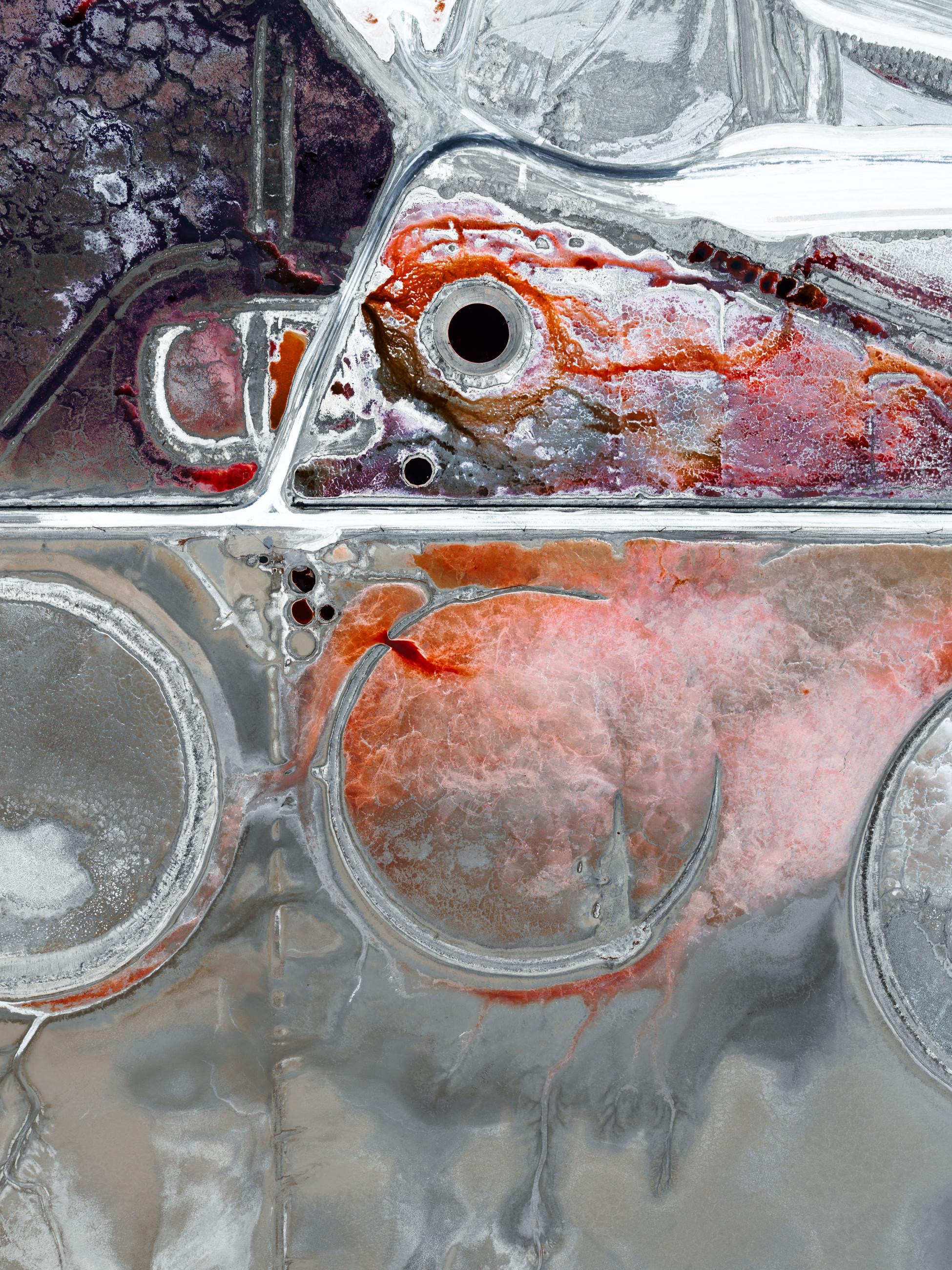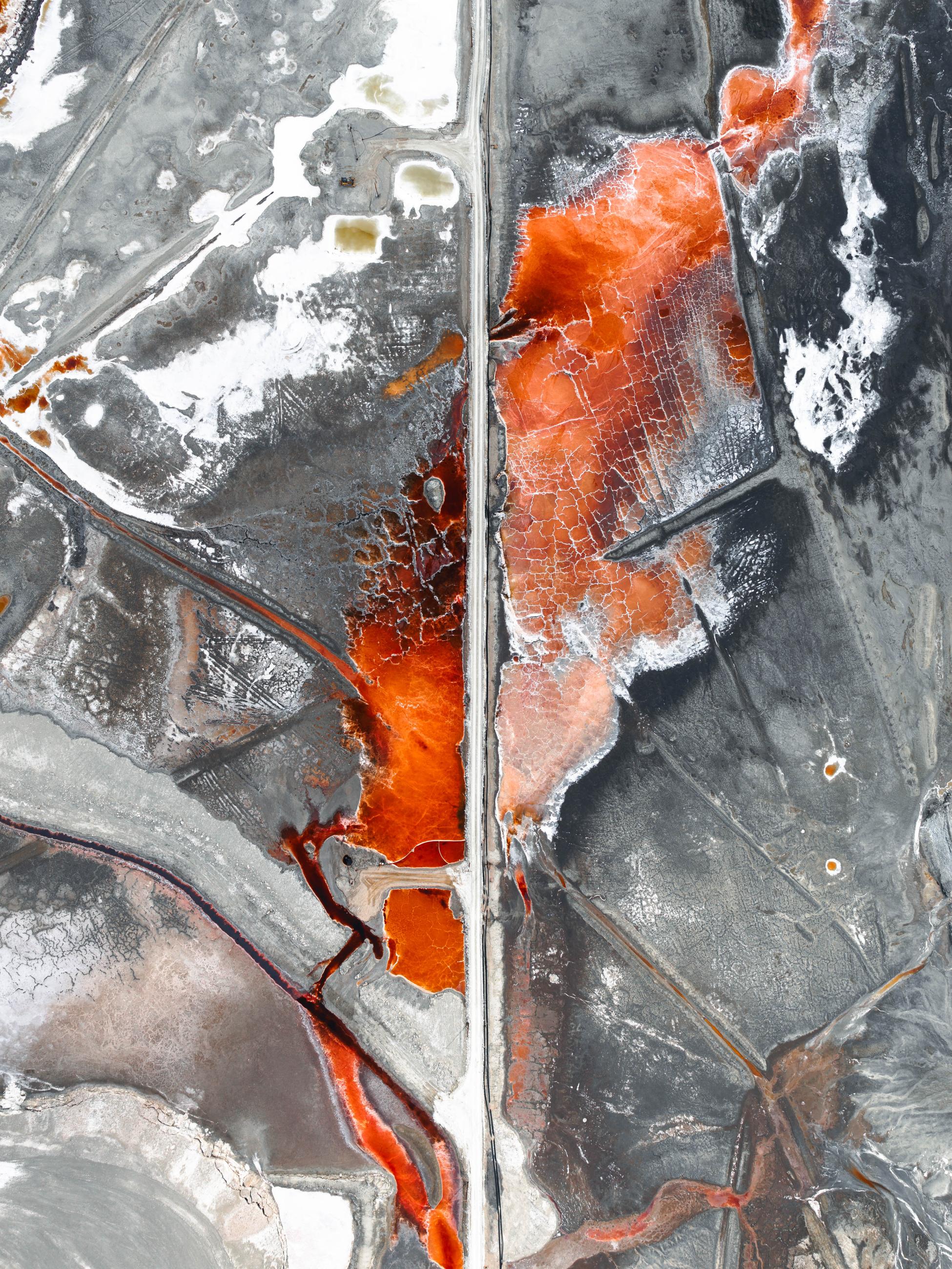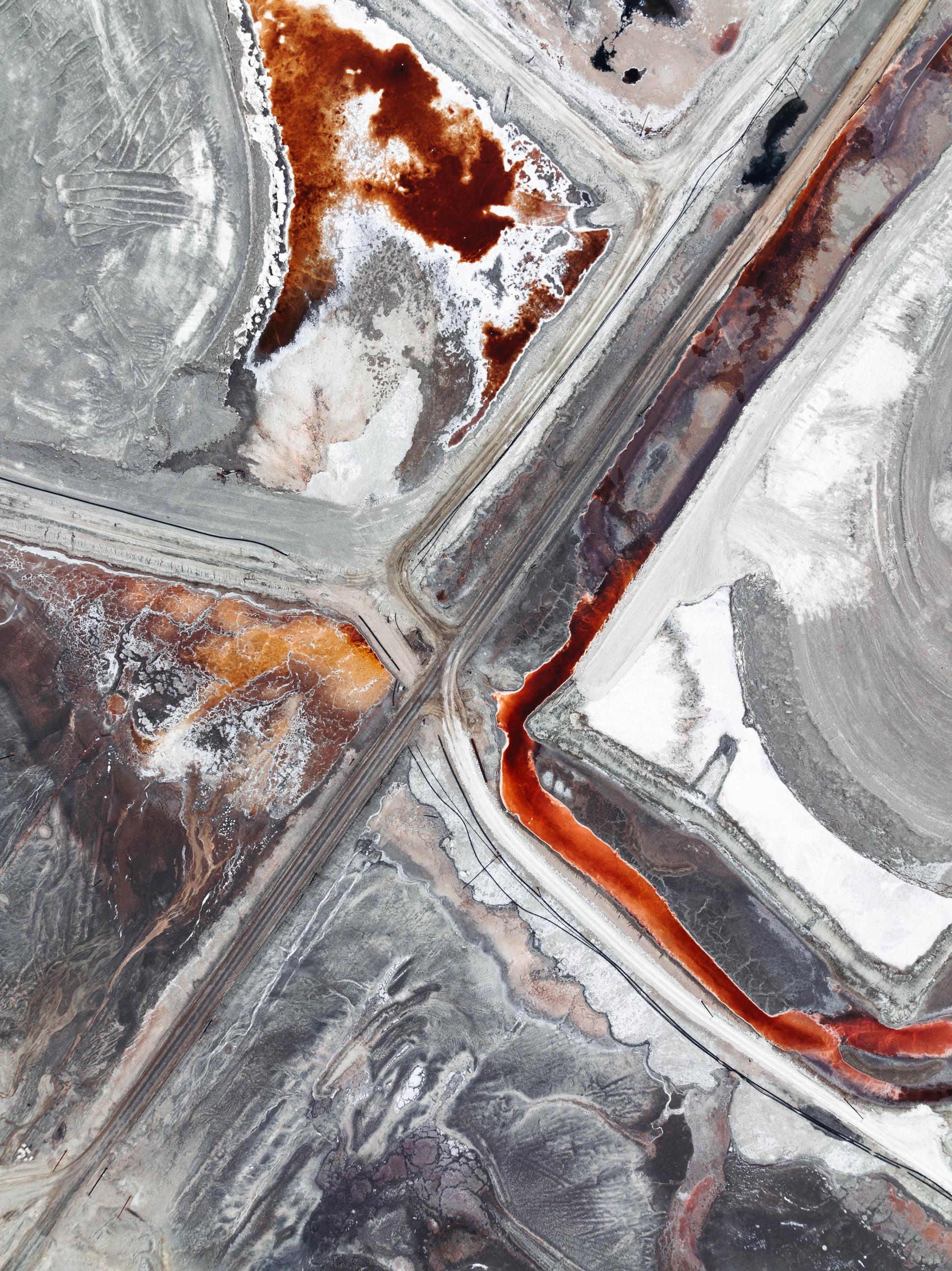 This project shows a rarely used method of mining borax from the air. Wells are drilled into the lakebed to reach the brine layer below the surface and pumps are used to draw the brine solution out. The extracted brine is then pumped into large evaporation ponds or pans, which have a large surface area and allow the sun and natural evaporation to concentrate the minerals within the brine. Over time, as the water evaporates, borax and other minerals become more concentrated and highly saturated colours are visible on the surface.