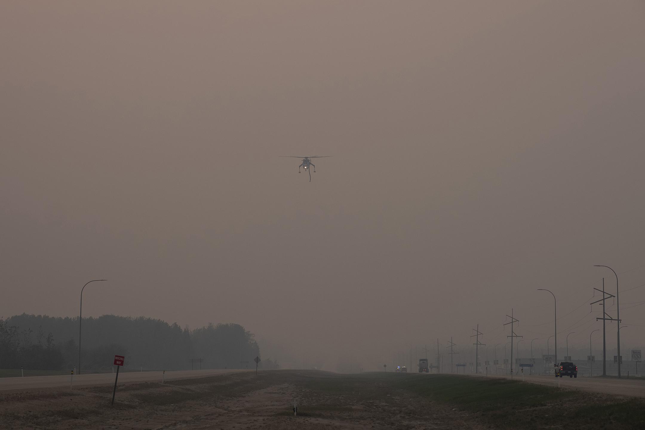 On Highway 43, a long stretch of Alberta highway, a thick layer of smoke from wildfires blankets the area. A firefighting skycrane flies through the air.
