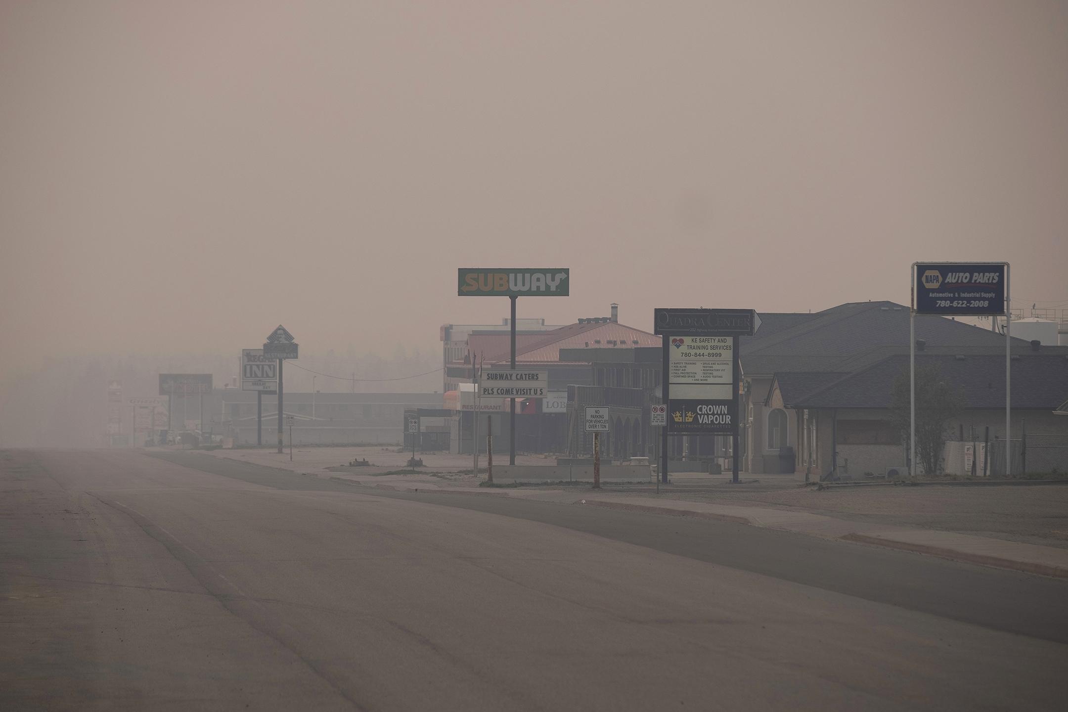 A thick layer of smoke blankets the horizon in Fox Creek as wildfires burn just a few kilometres away.