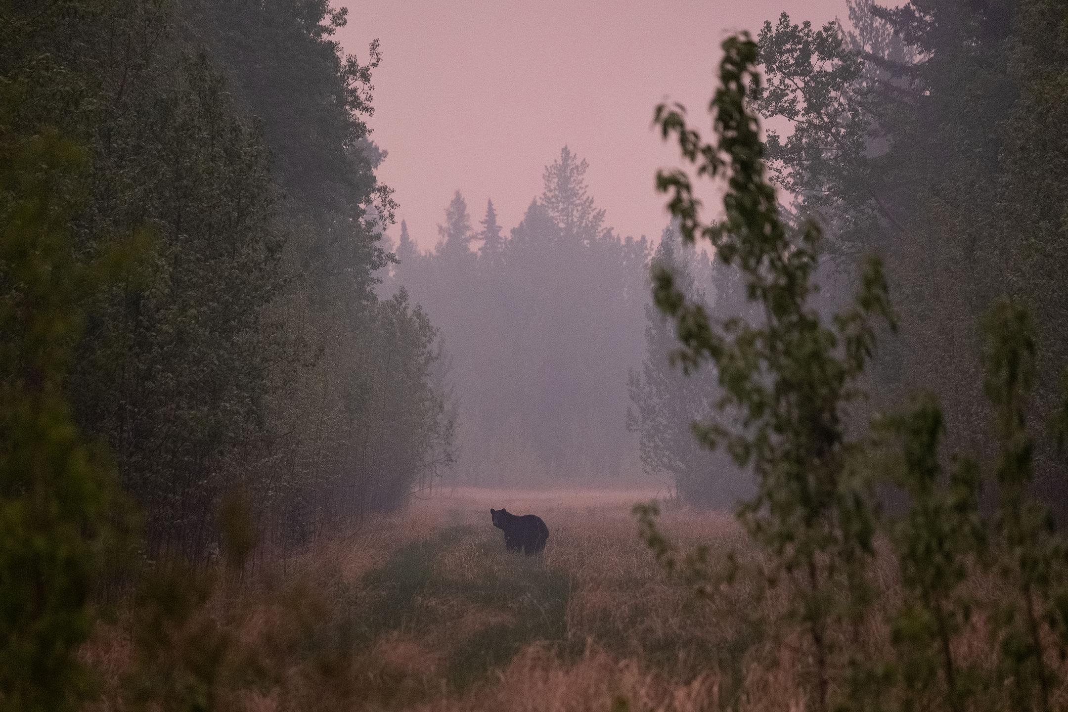 A black bear wanders through a fire zone in Shining Bank, Alberta.