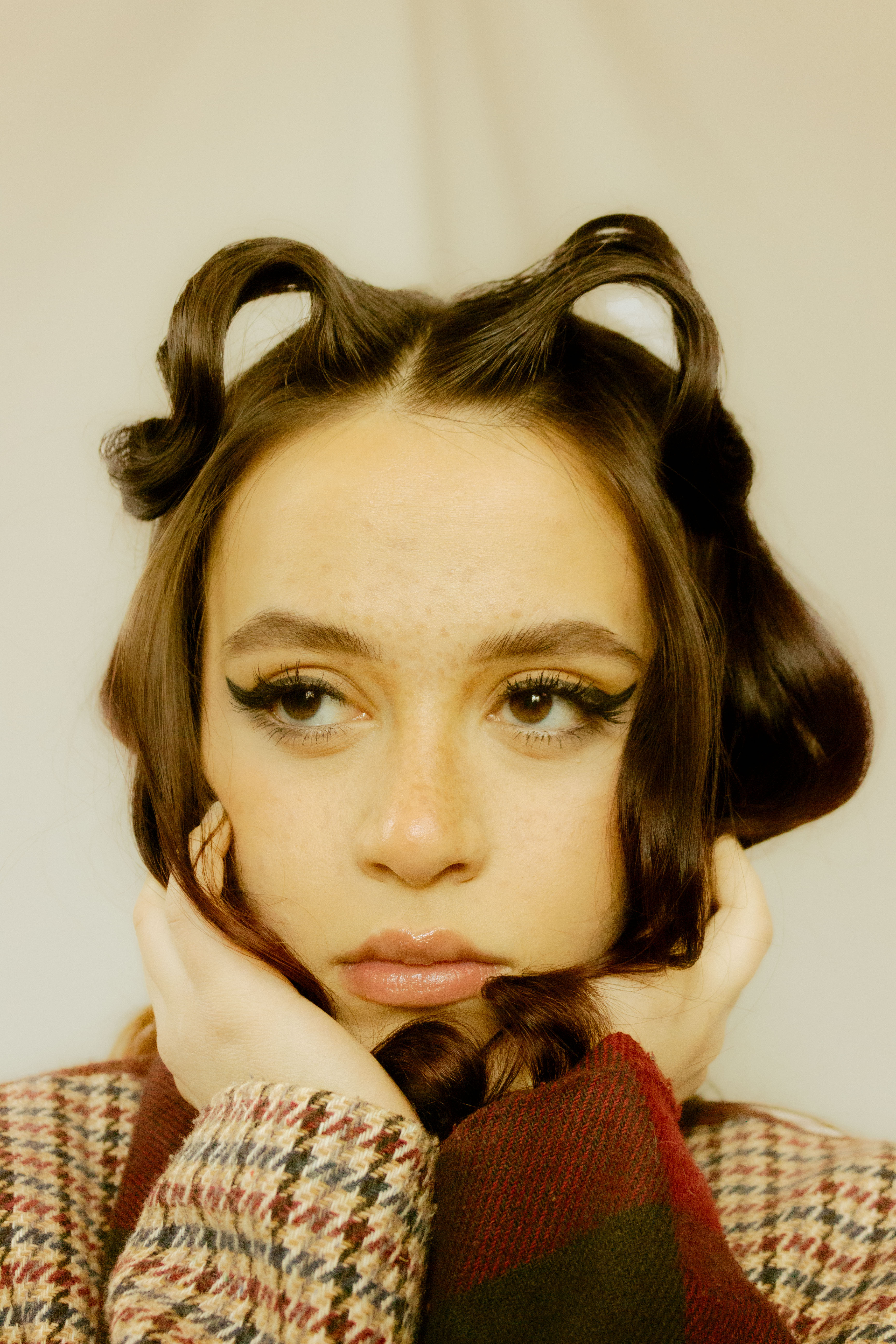 Taken in a studio in Salt Lake City, Utah. Close up of a model in 1940s-style clothing.