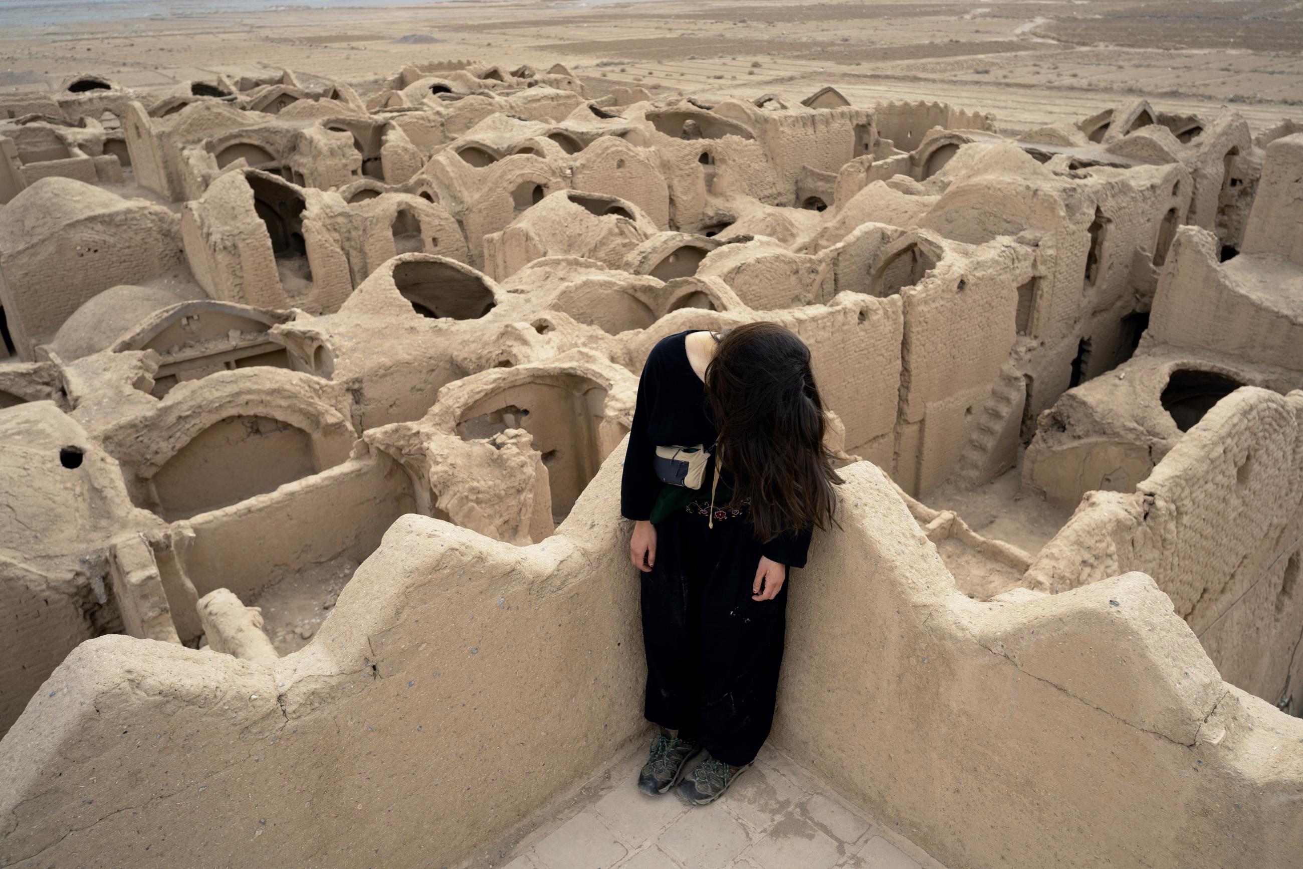A Zoroastrian girl standing on the top of the ancient bank in Saryazd fortress, Yazd, Iran.