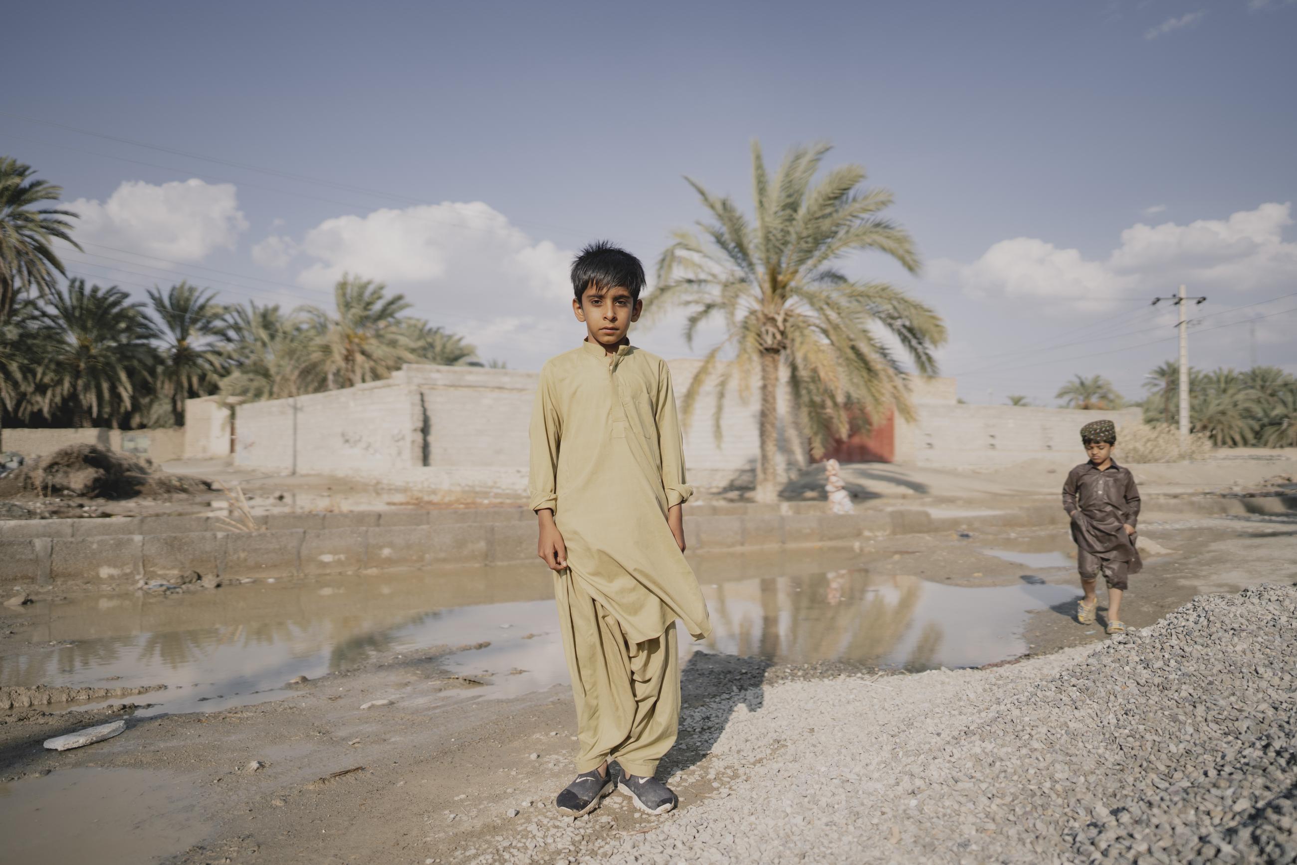 A local boy playing with his brother on the streets of Dezzak village, Baluchistan, Iran.