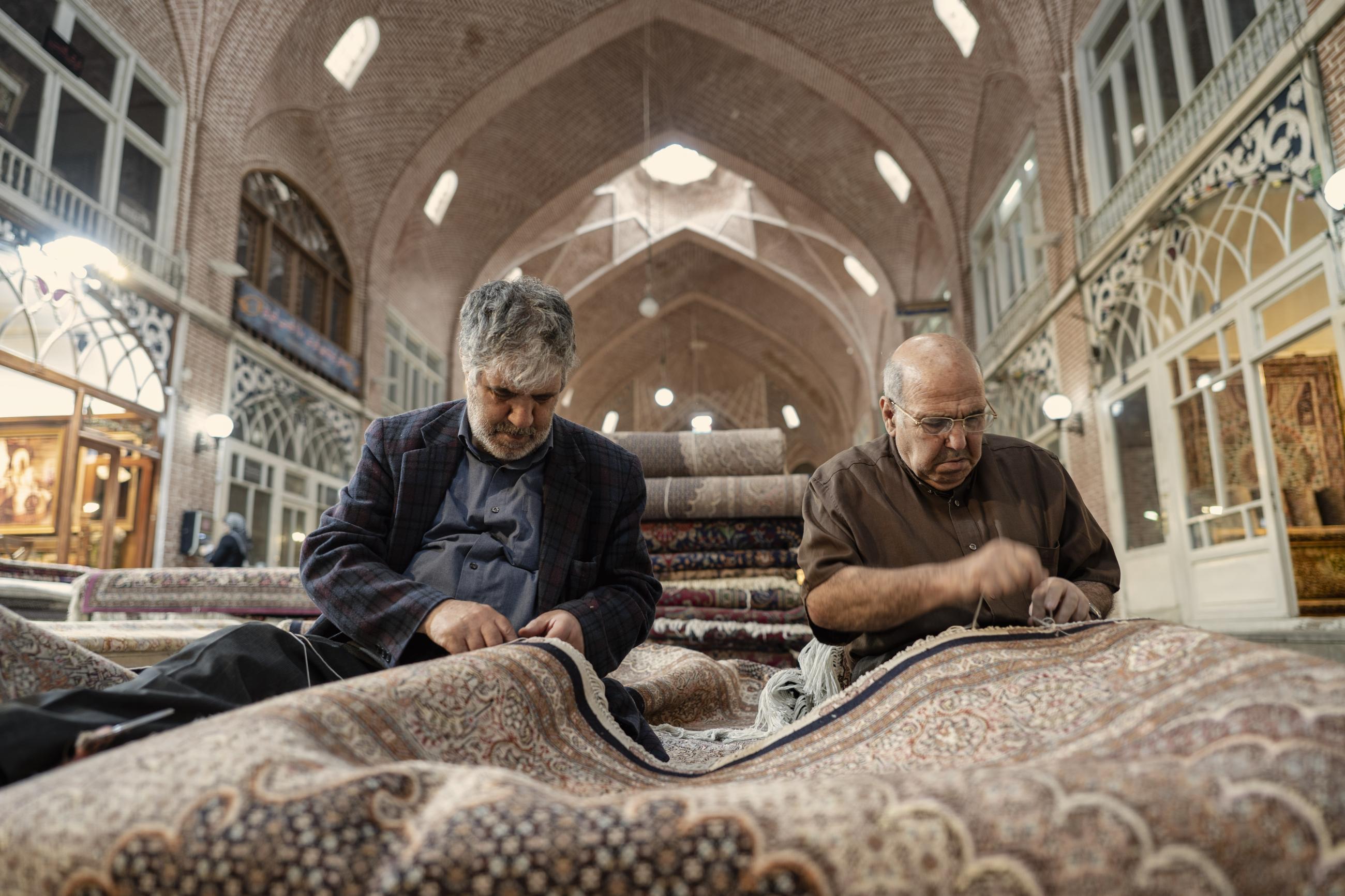 Local carpet Weavers working on a carpet in the Bazaar of Tabriz, East Azerbaijan, Iran.