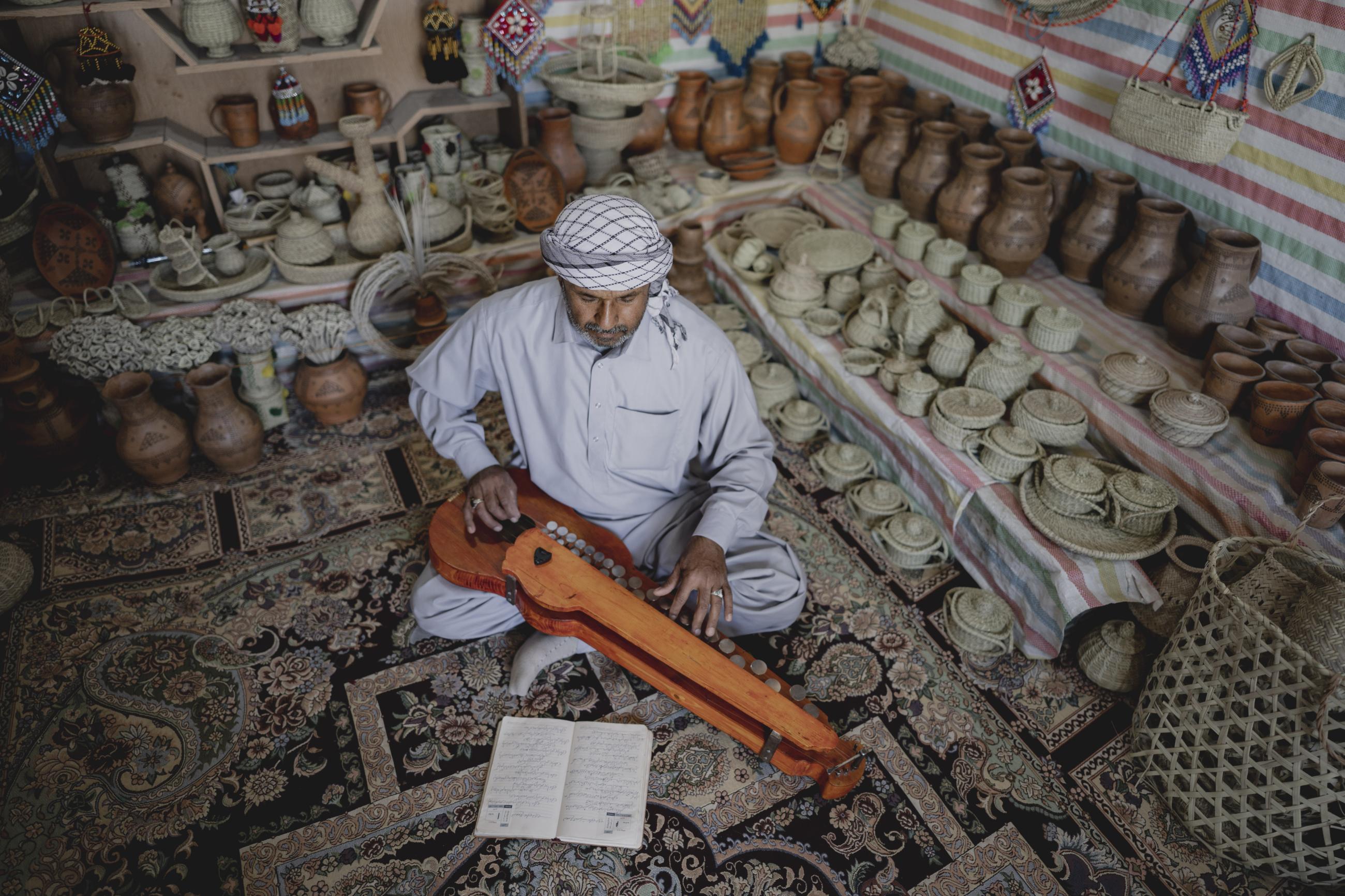 A local potter playing a Benju in his art gallery in Baluchistan, Iran.