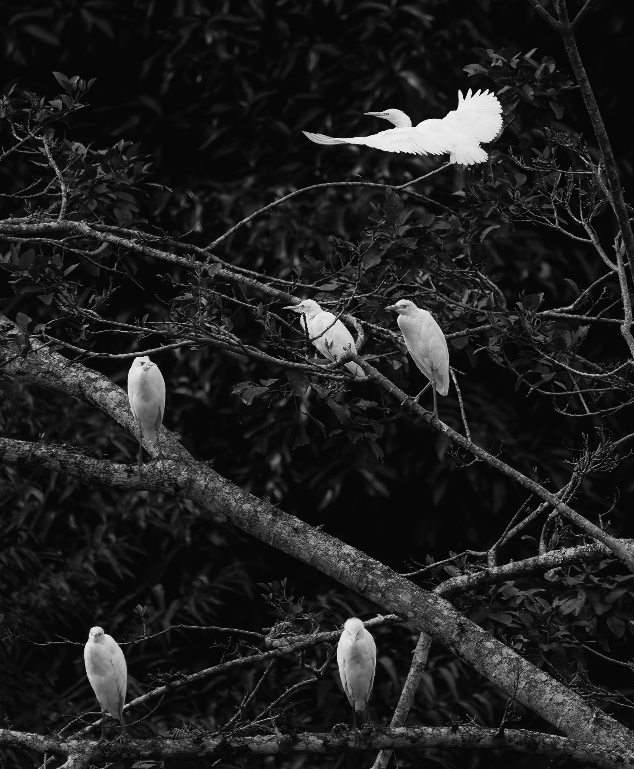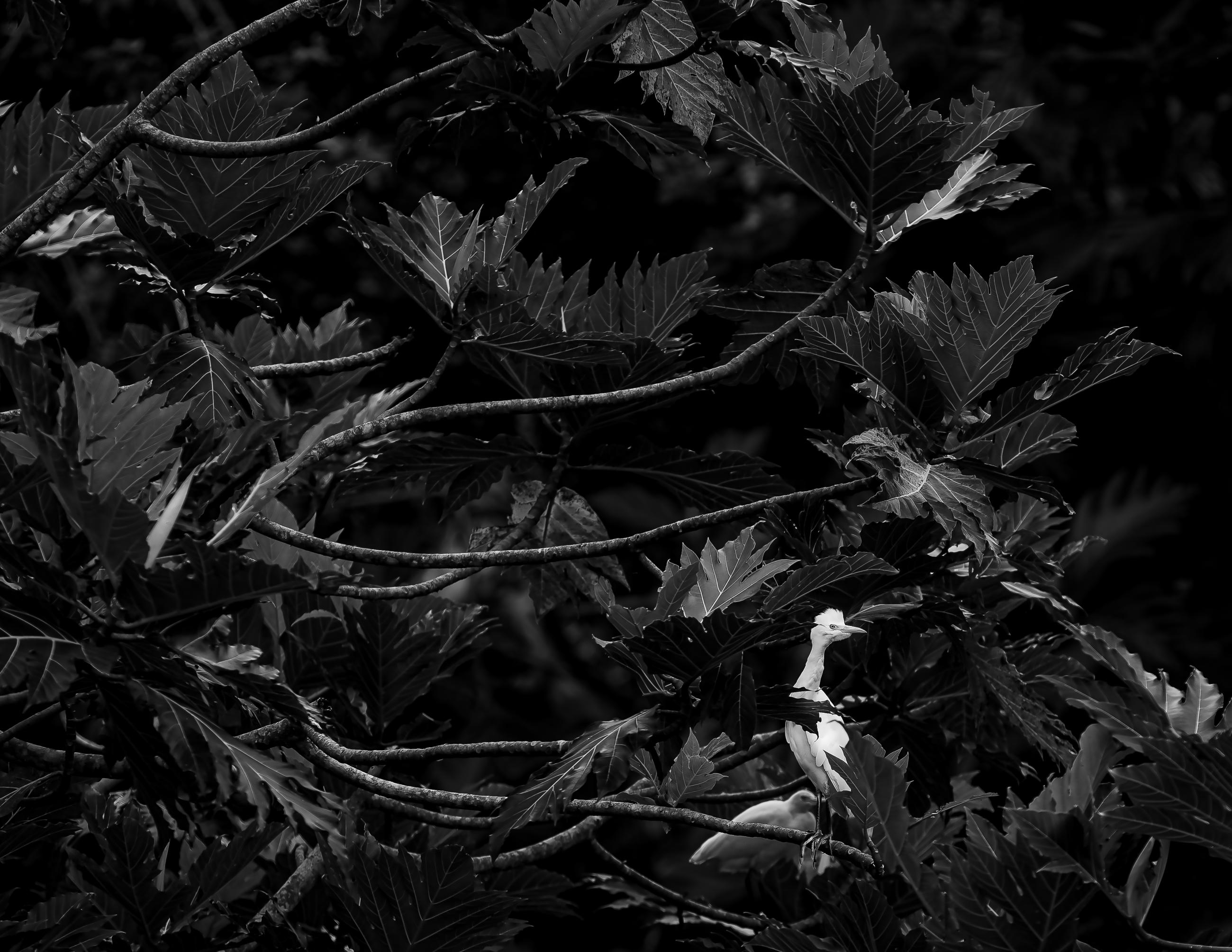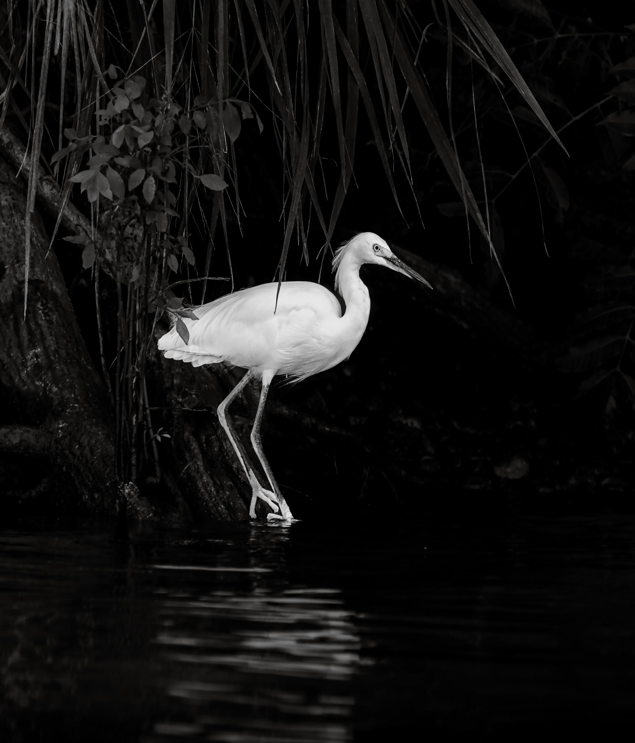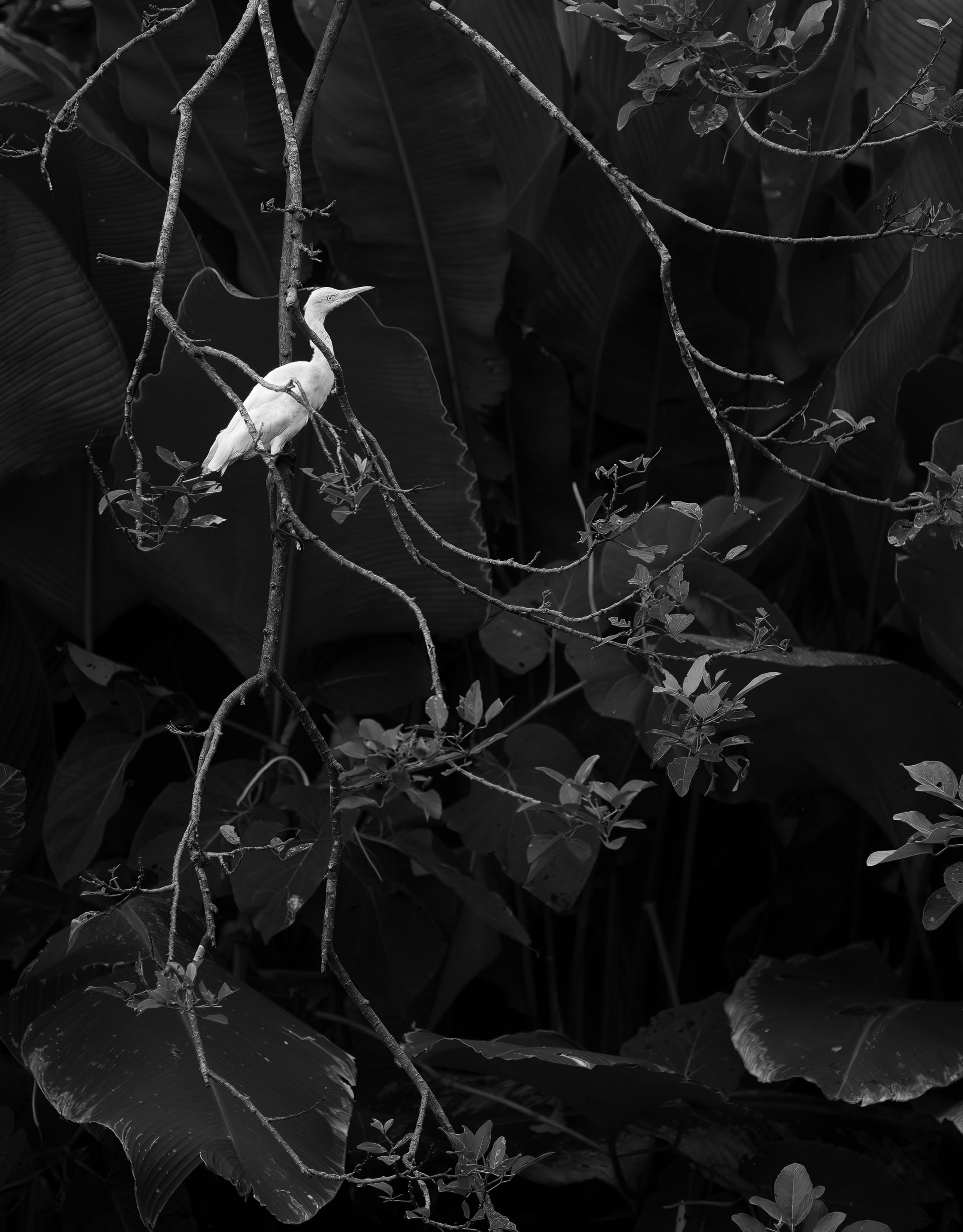 On a recent trip to Costa Rica, I was fascinated by the habitat of the herons and egrets I observed in the Arenal Volcano and La Fortuna area. Rather than just focusing on the birds, I wanted to ‘pull back’ and show the lush and rhythmic environment they inhabited. The black and white medium worked well, highlighting the contrast of the dark and mysterious fauna against the white birds.