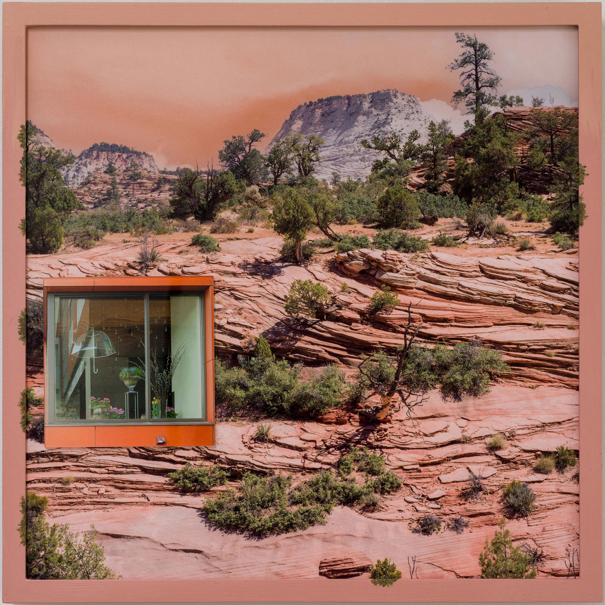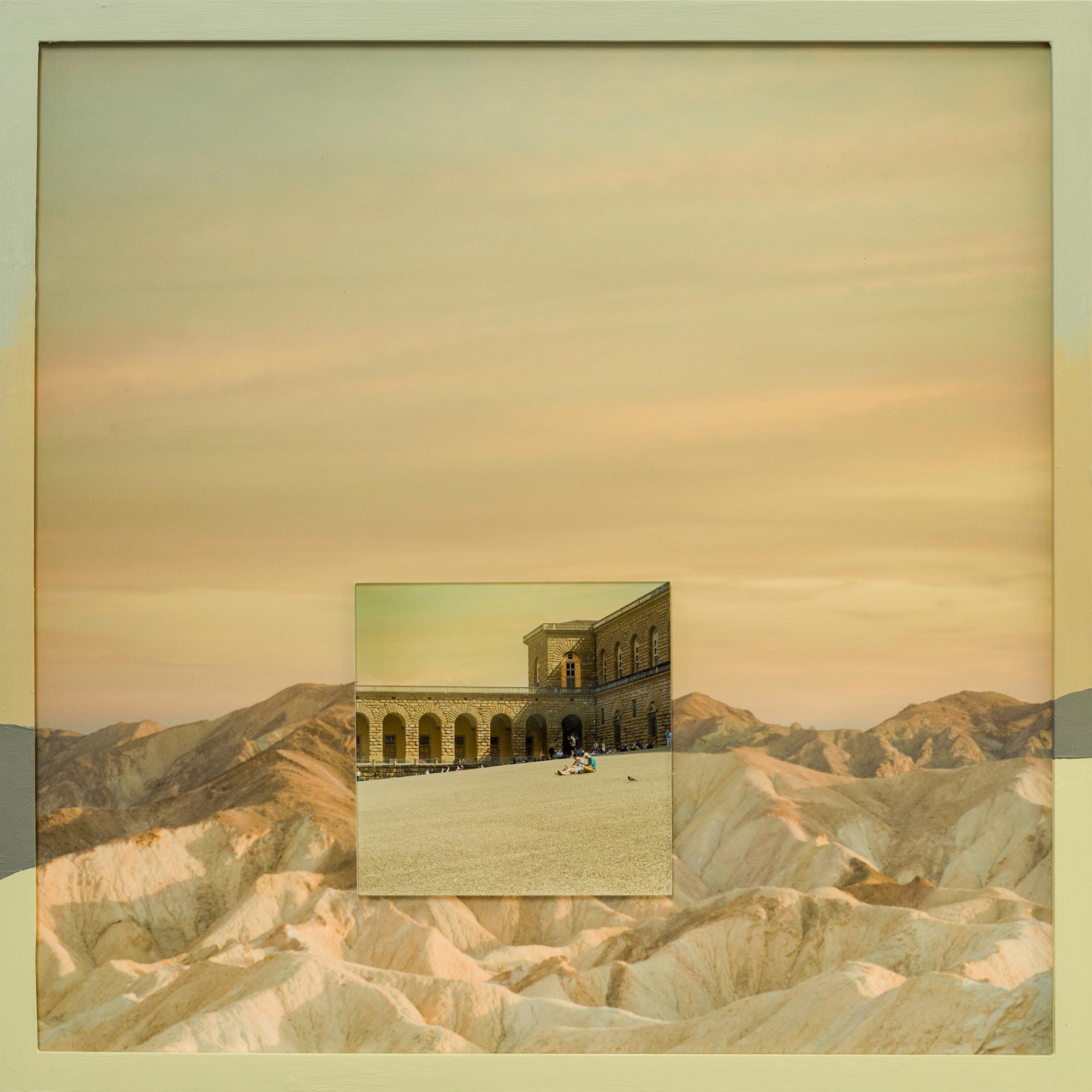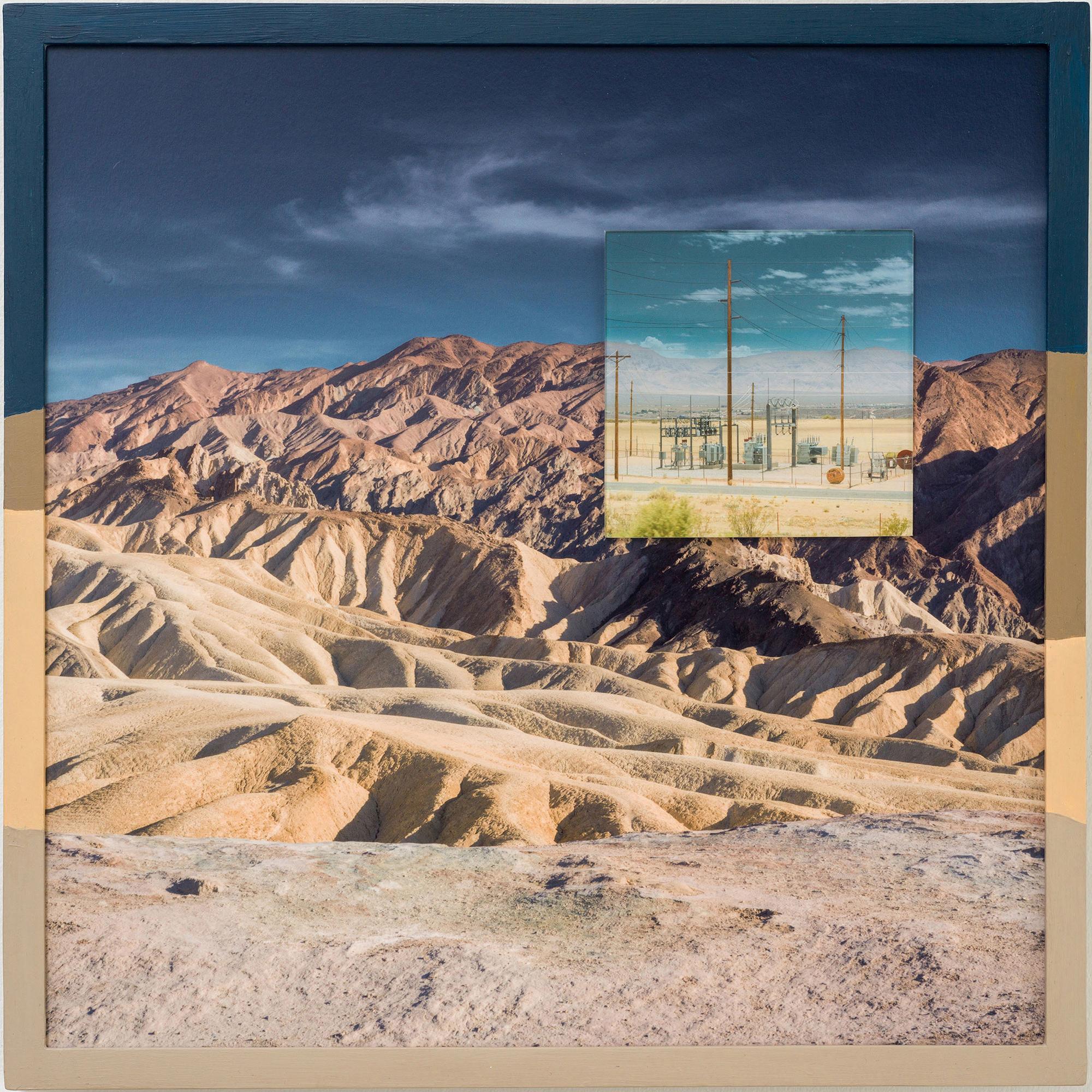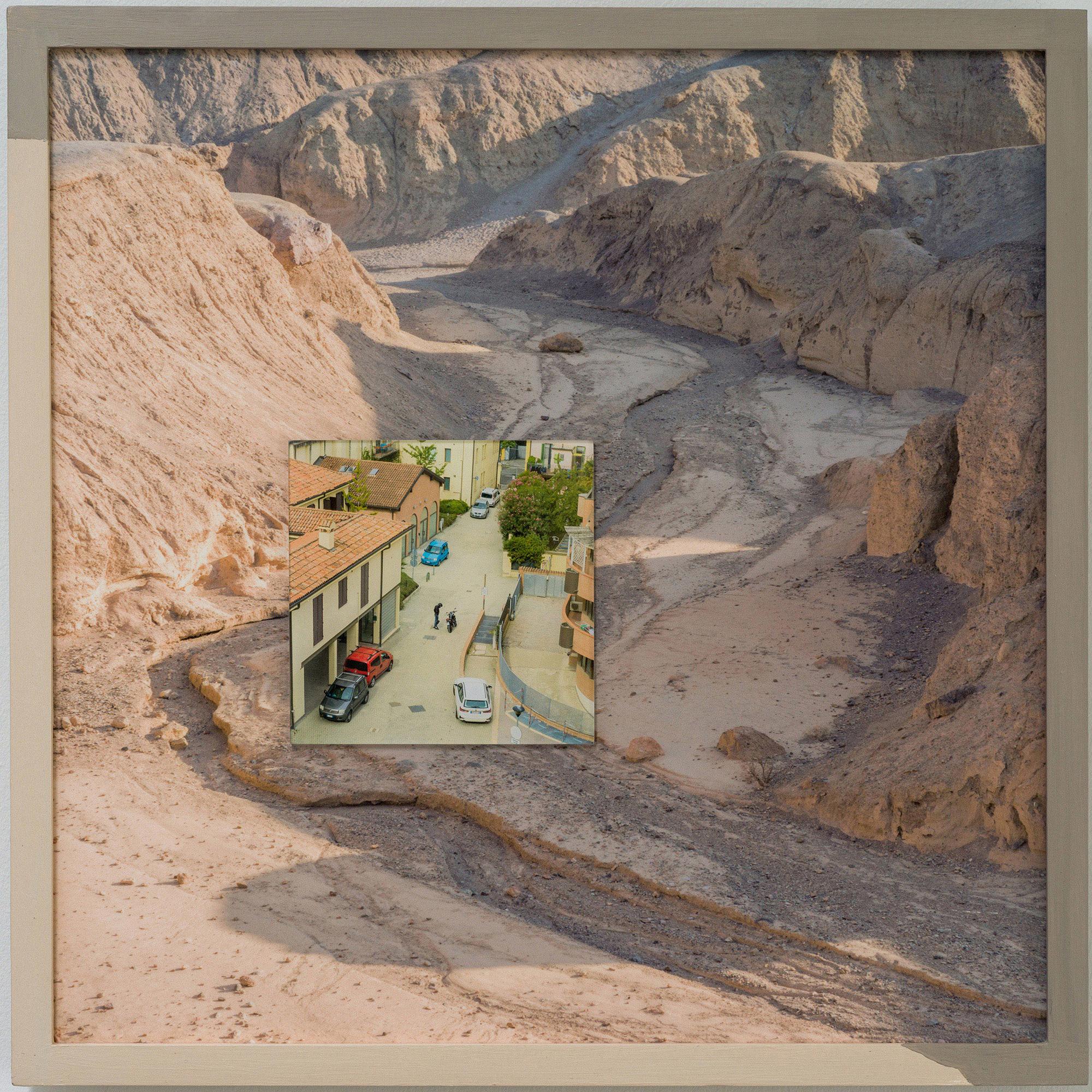 With this series I have mounted scenes of habitation behind acrylic, as if we can separate the things we do from having an impact on the natural world, and placed these within sweeping landscapes of the deserts of the American southwest – a stand-in for a future planet shaped by rising temperatures. The constructed world behind the acrylic is protected, while the landscapes, though durably printed on aluminium, remain exposed. The continuity of line and colour between these scenes points to their interconnectedness and the multi-layered images are finished with hand-painted frames, alluding to the planet’s next chapter. As the image pushes beyond the frame, the story continues to evolve.