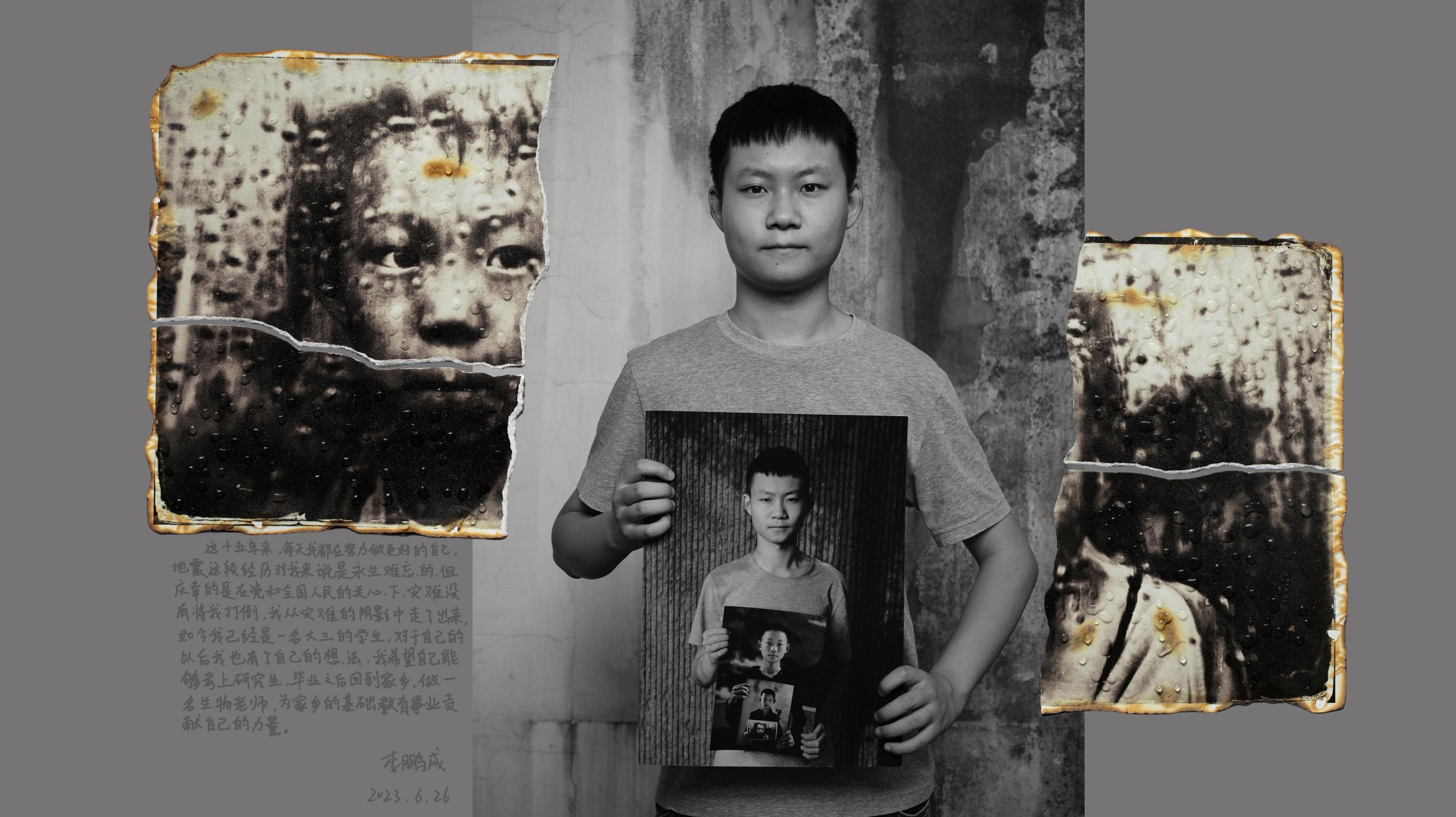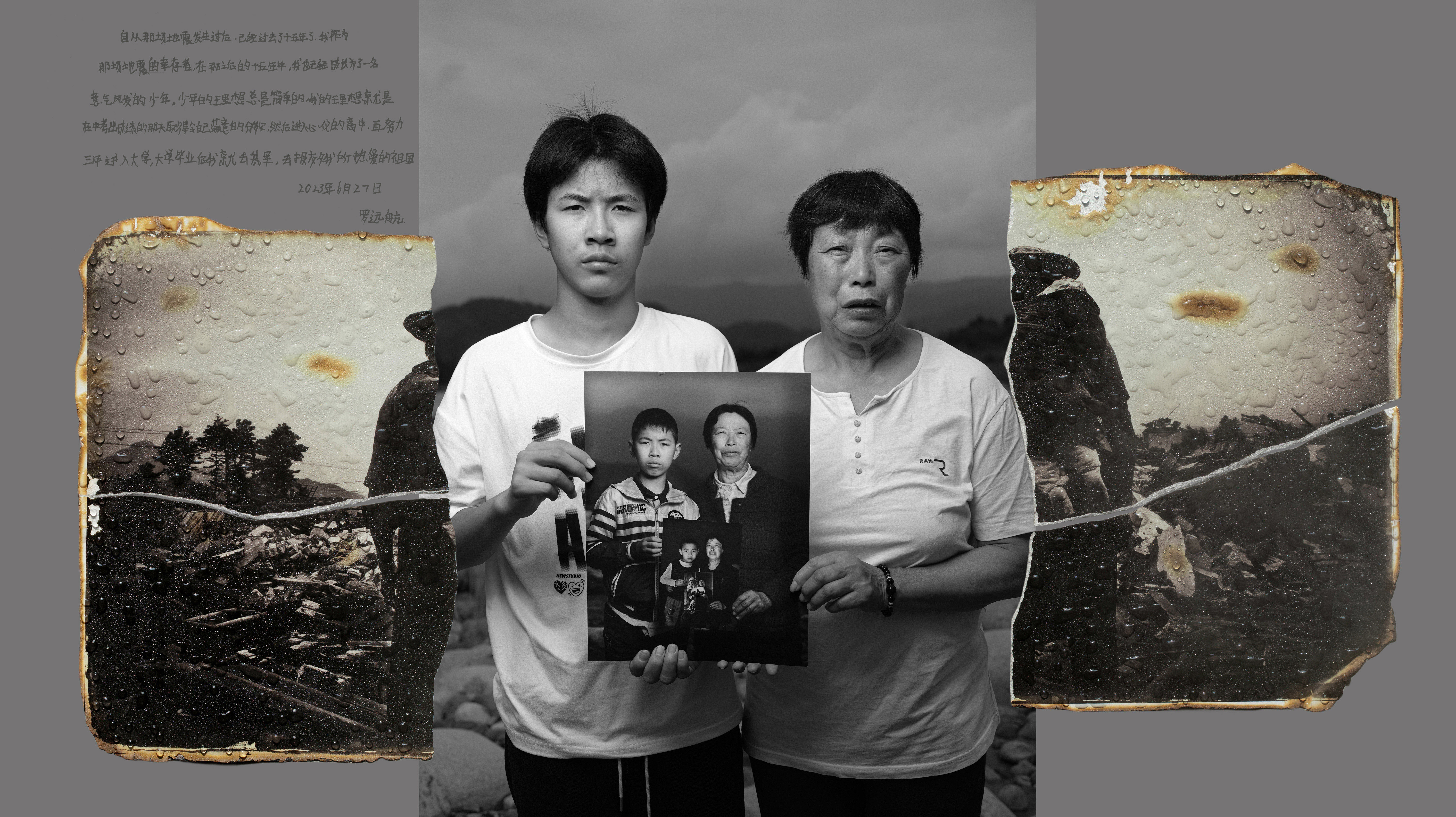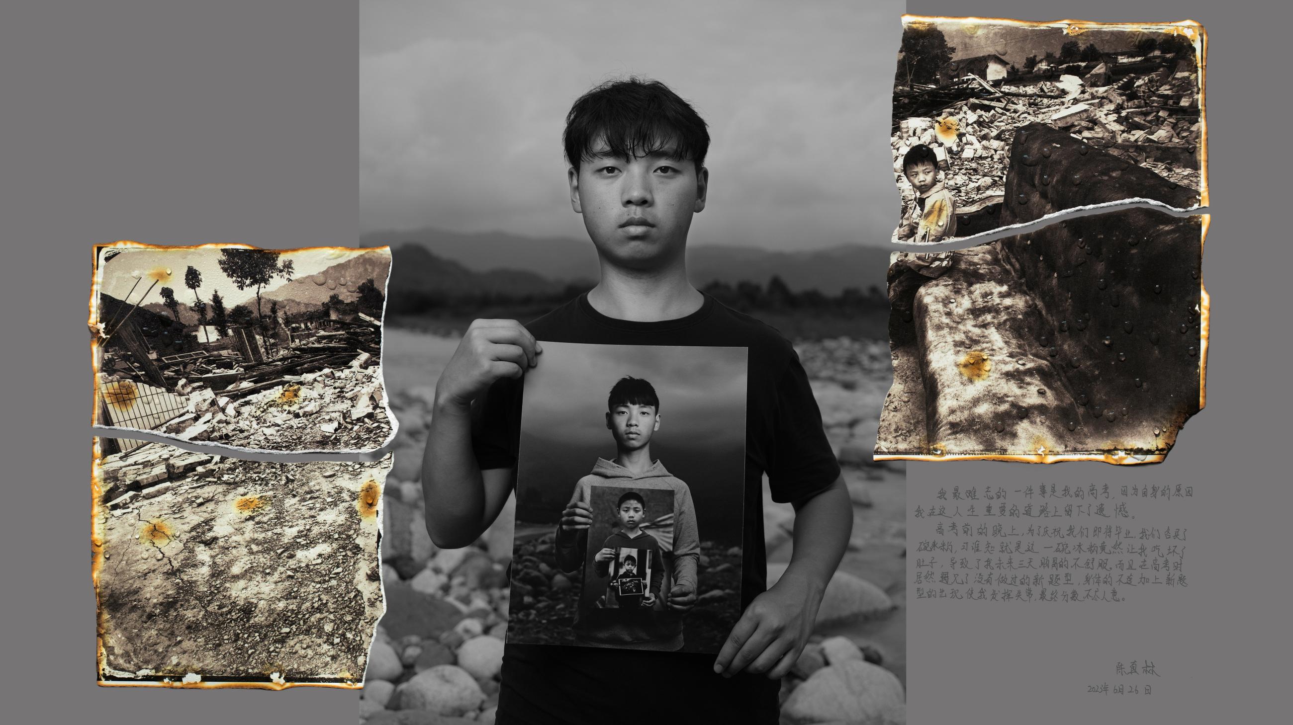 On 12 May, 2008, an earthquake with a magnitude of 8.0 struck Wenchuan, China, killing more than 69,000 people, injuring over 370,000 more and leaving another 17,000 missing. They say that ‘time is a great healer’, but it can also make things worse. This photographic series focuses on the survivors of the tragedy. The first stage was to take portraits in 2008, 2009, 2014, 2018 and 2023. In each one, the survivors held a print of their previous portrait, so the final image combines multiple portraits showing the passage of time. I juxtaposed the portraits with images of the earthquake scene from 2008, which I printed and burned, tore, sprayed with water mist, reassembled, rephotographed and pasted to symbolise ‘nirvana’ and a ‘rebirth from the ashes’. To this composite I added text from the survivors, written in Chinese, describing their 15-year life journey since the earthquake.