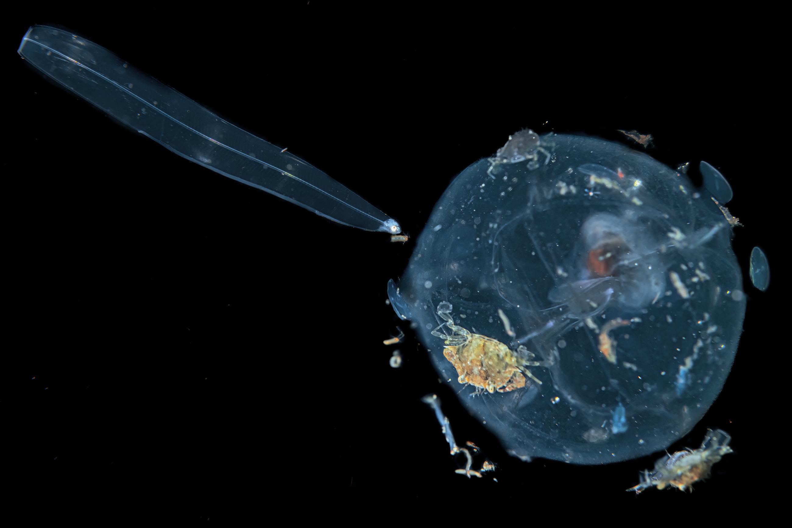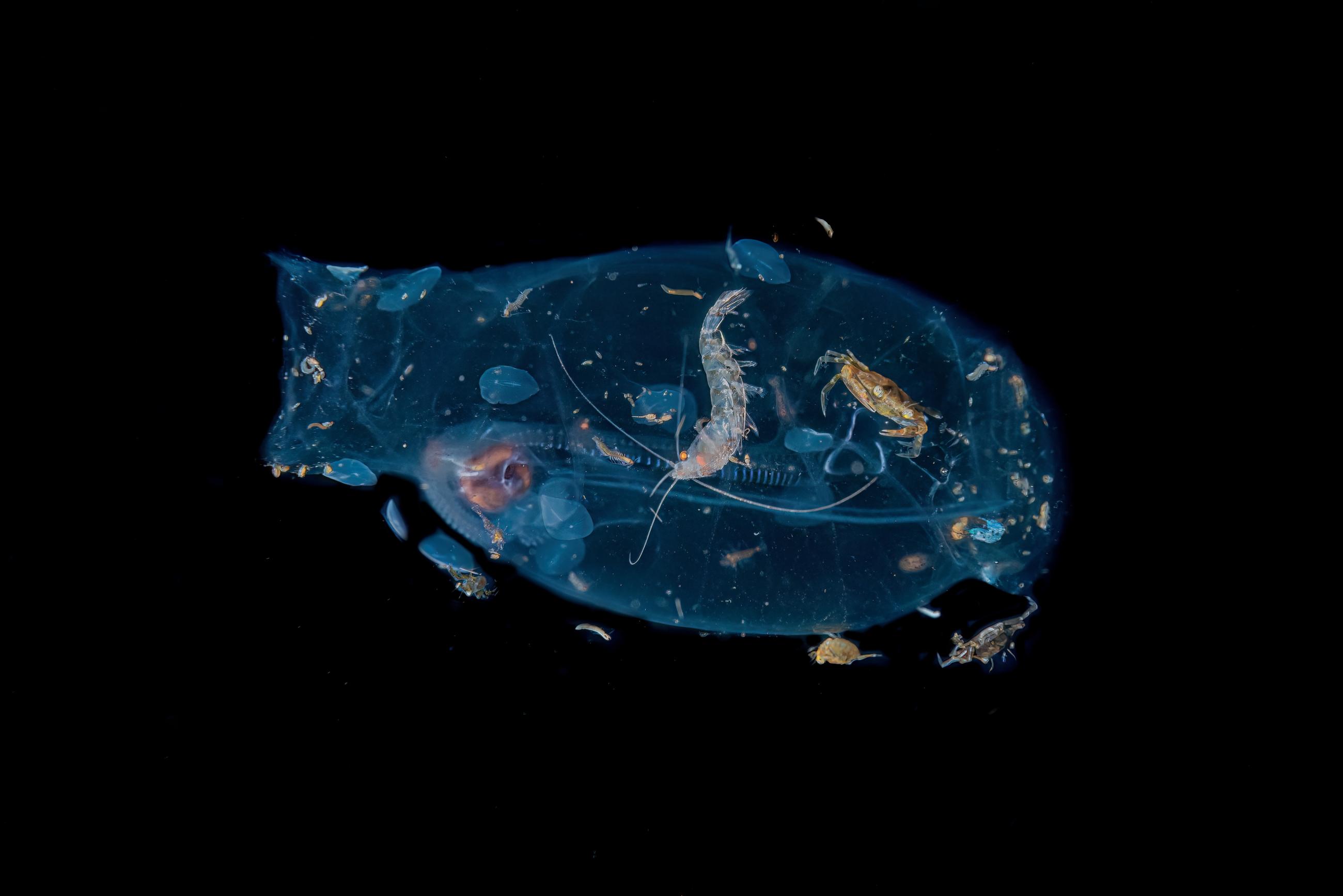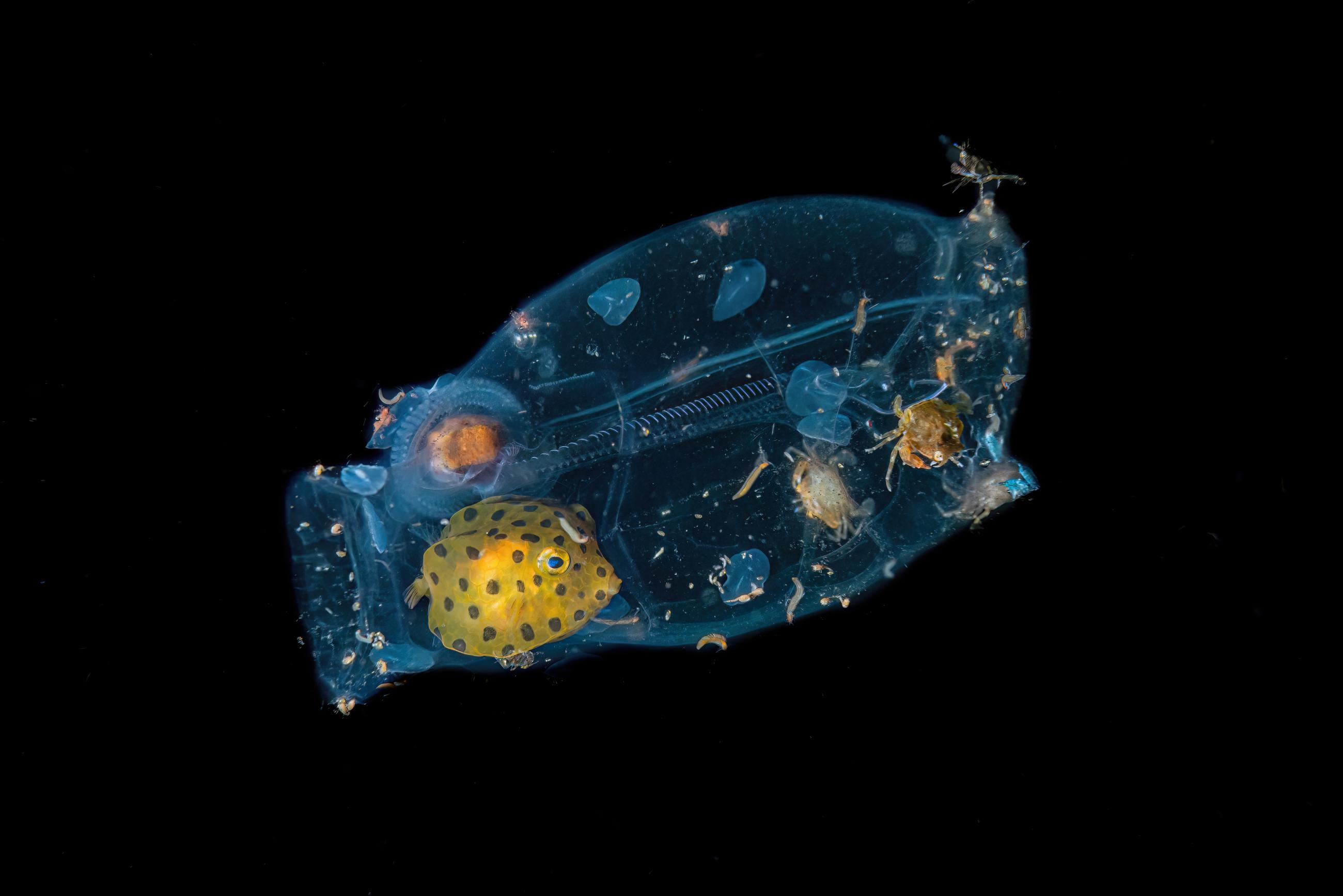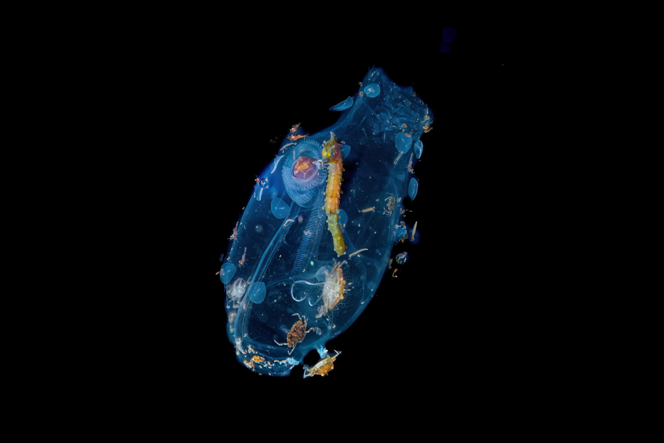 This series is the result of eight dives in the Lembeh Strait, North Sulawesi, Indonesia. The photographs were taken at night using a technique that involves lowering a 10 metre line with eight alternating lights hanging from it into the ‘black water’. The lights are lowered 30 to 40 minutes prior to the dive and attract the larval or juvenile forms of different species. Just before the dive, the lights are hoisted back up and secured to a buoy, drawing the tiny, interesting creatures up with them. For the most part these larval forms are transparent, and range in size from just a few millimetres up to jellyfish measuring 4 cm. These photographs show how the tiny larval beings use tunicate jellyfish as protection from larger animals.